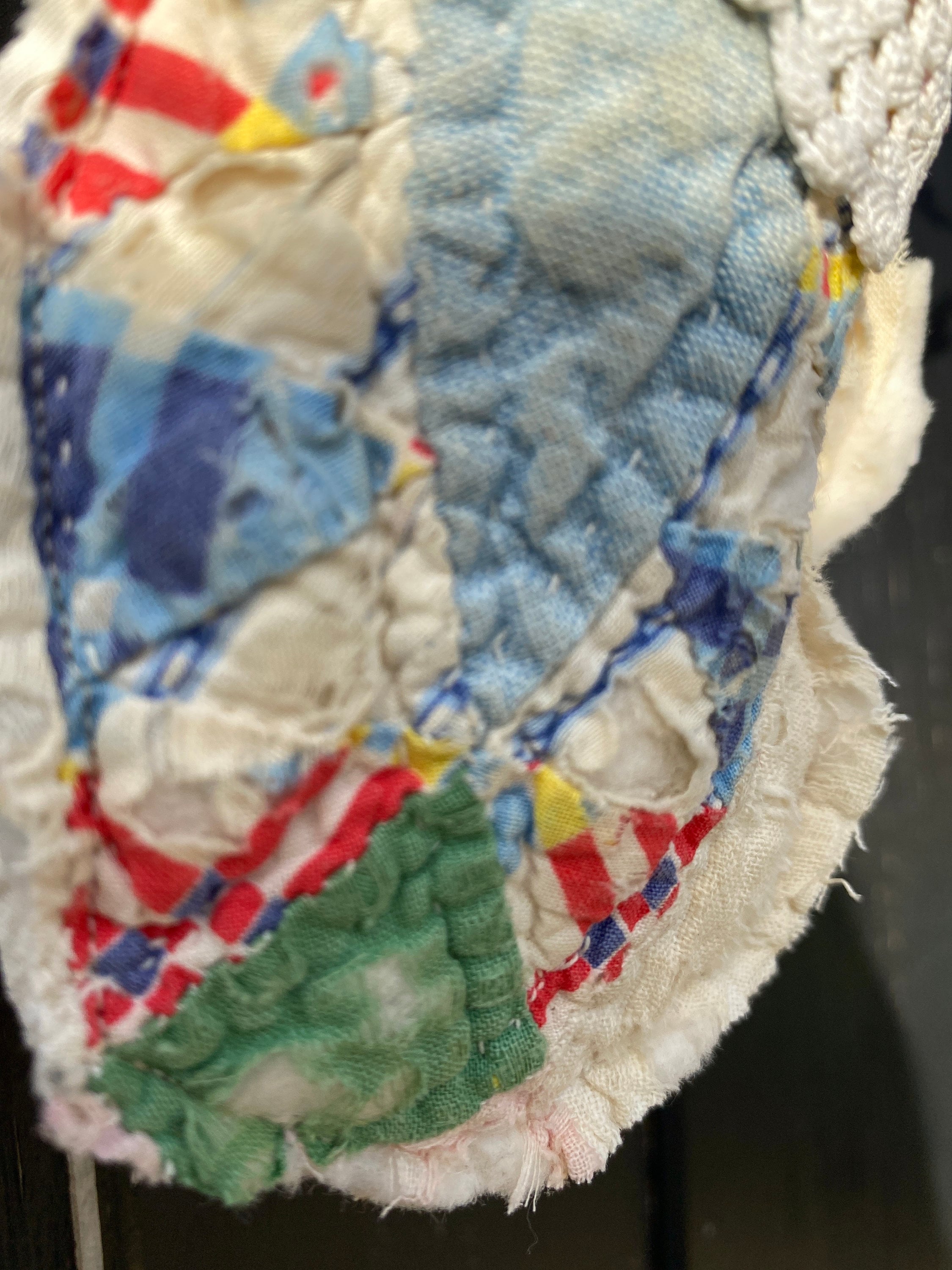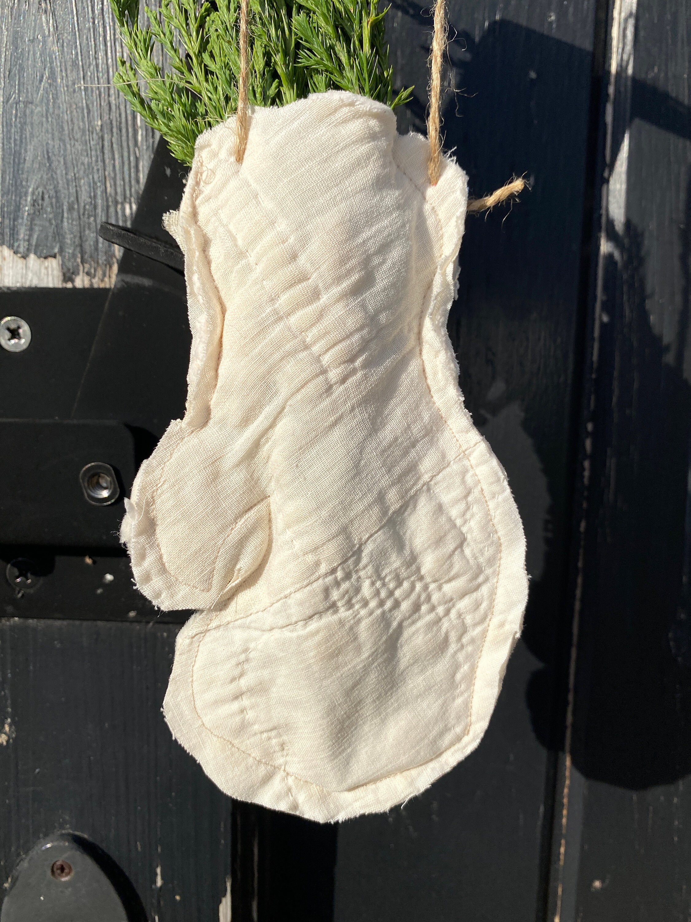 I found a muted, worn and tattered lovely textured antique quilt. I was only able to get one piece so this is truly unique. This farmhouse cottage hone decor mitten has pocket for a gift or note, reverse white quilting, vintage lace trim and a festive jute bow.