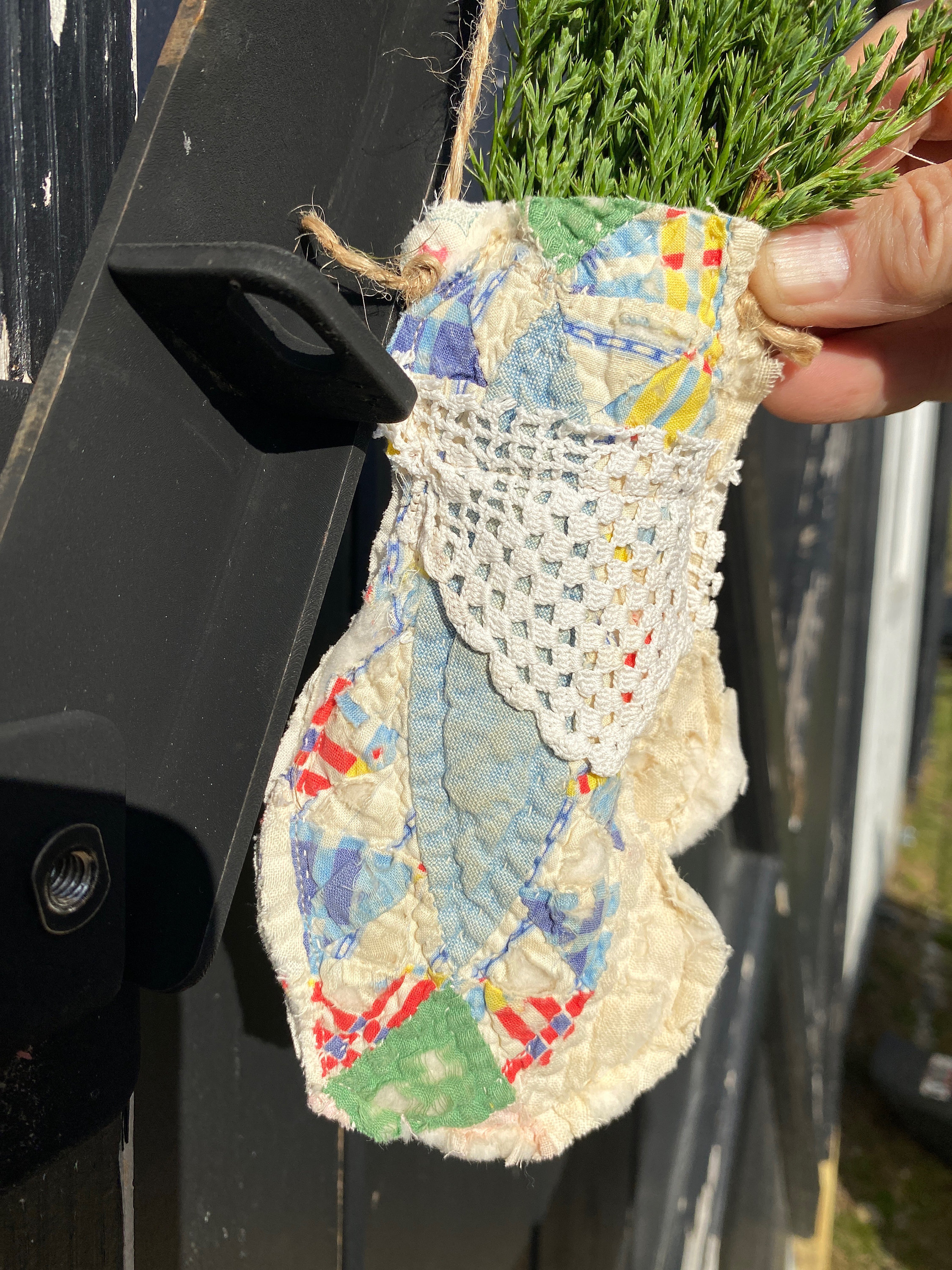 Mitten: antique quilt Christmas peg hanger mitten, vintage lace at top, farmhouse cottage homiday decor, pocket to add a gift or note! 7”