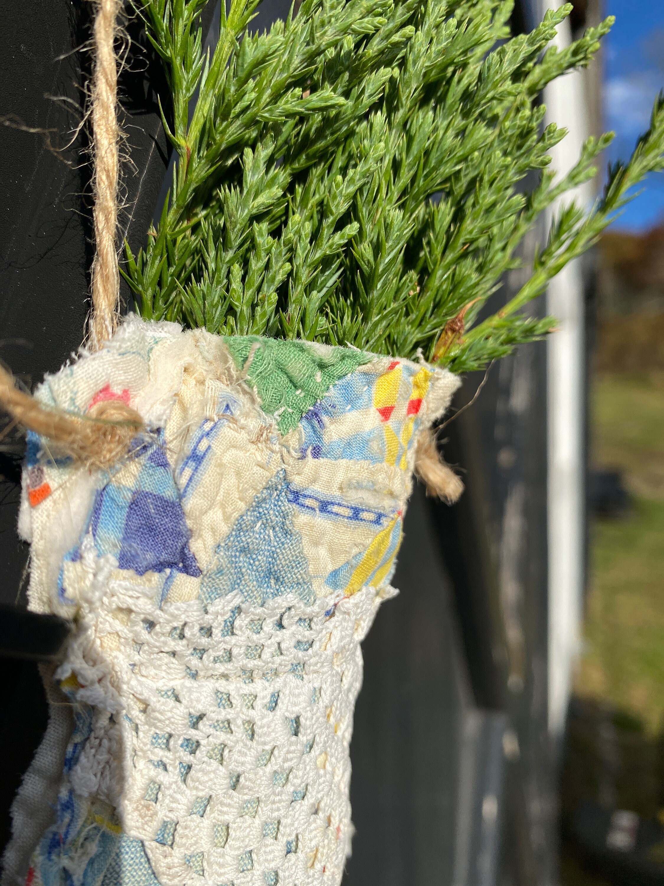 Each antique 19th century antique quilt primitive Christmas pillows are designed and handcrafted by me. These one of a kind upcycled rustic adorable Christmas pillows are finished with charming antique lace and a cute jute bow. There is just one of these mitten pockets.