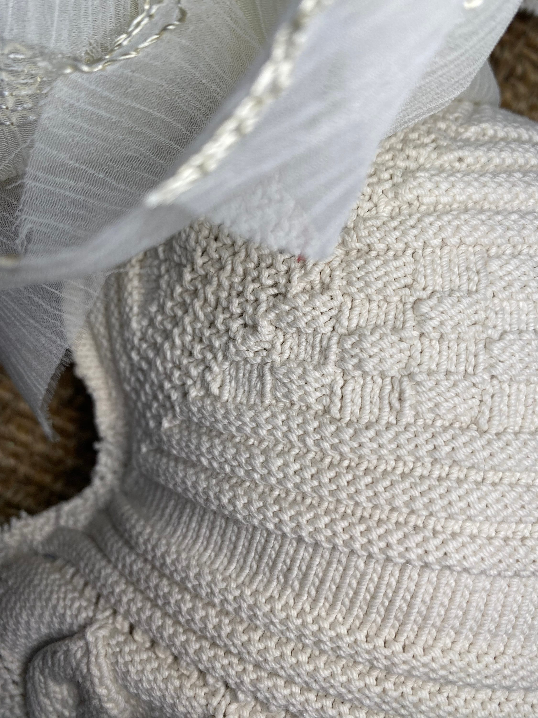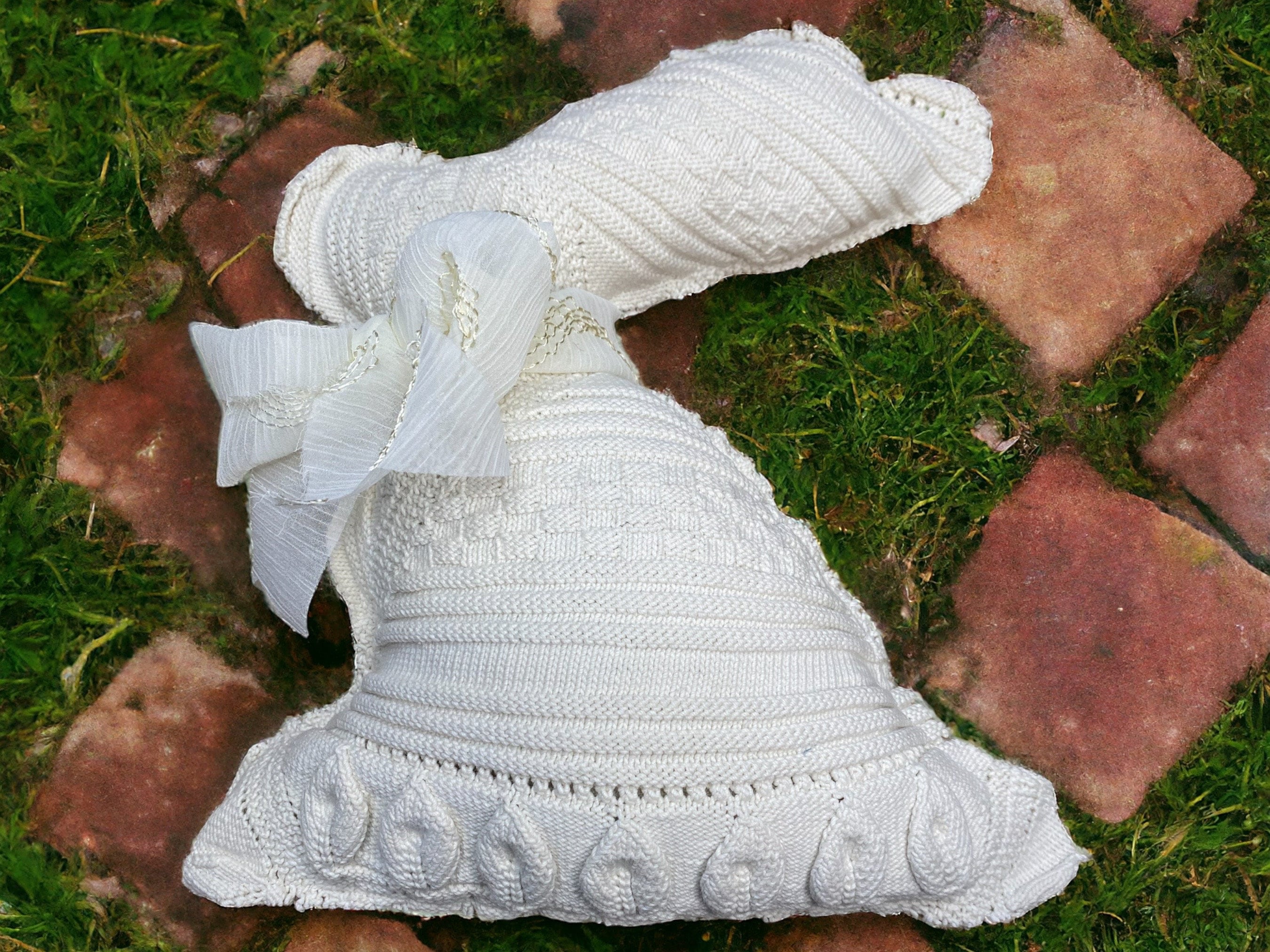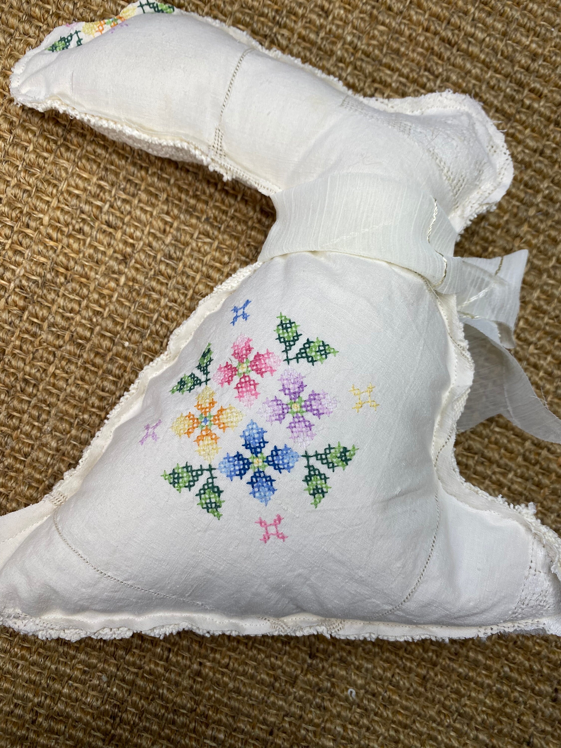 I have repurposed a gorgeously textured vintage crochet neutral textile into this XL Easter bunny here in my 1787 farmhouse studio. The reverse is a charming cotton embroidered cross stitch for a pop of surprise color on the back of the rabbit. I added a huge silk bow for extra texture.
