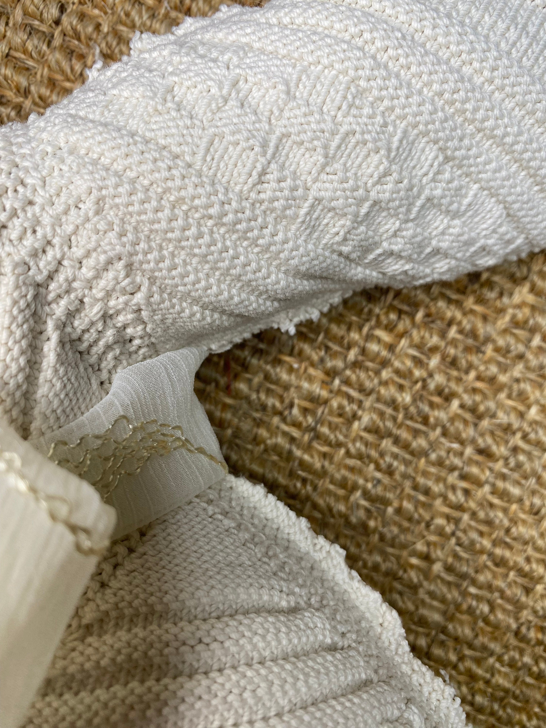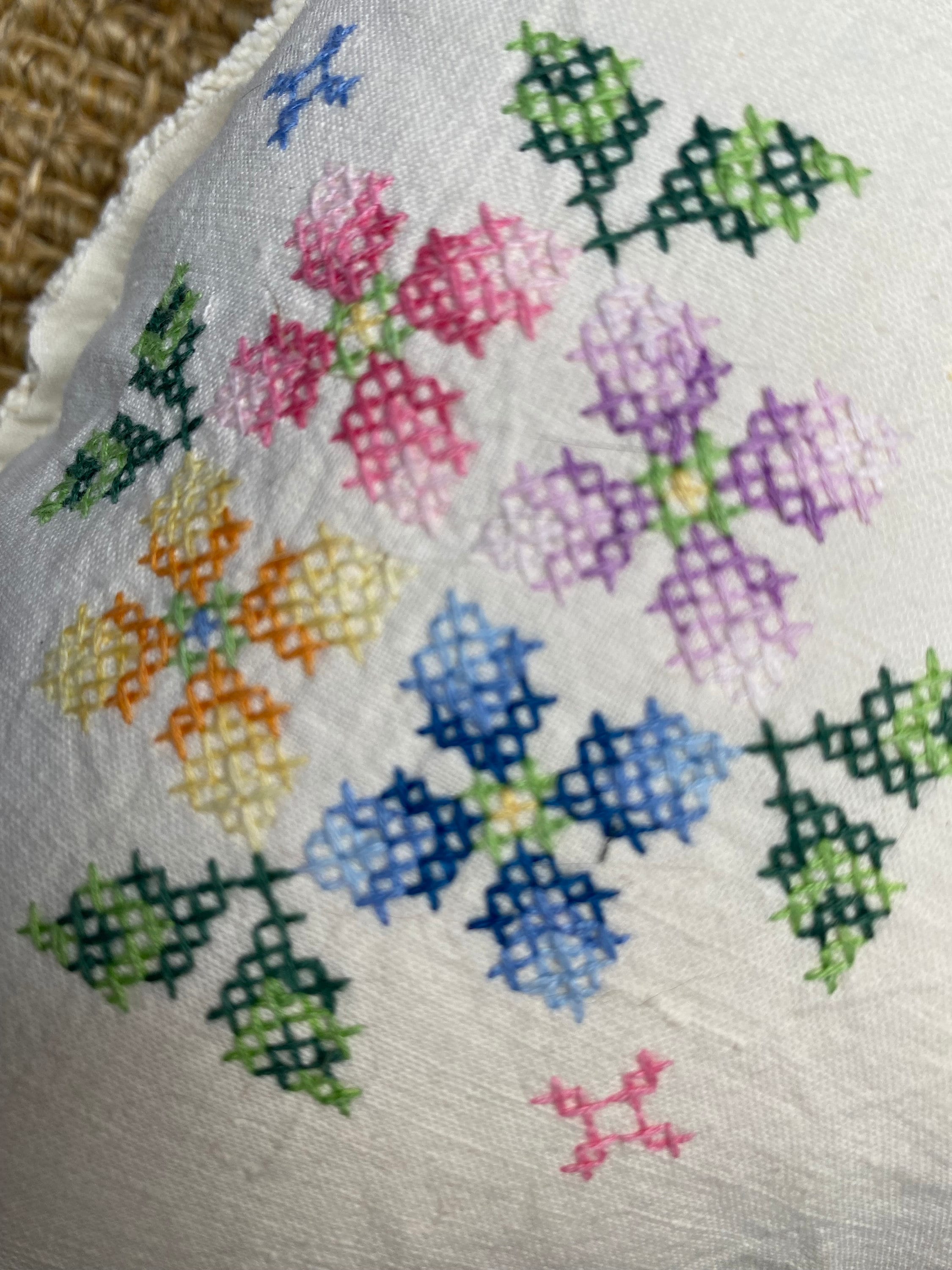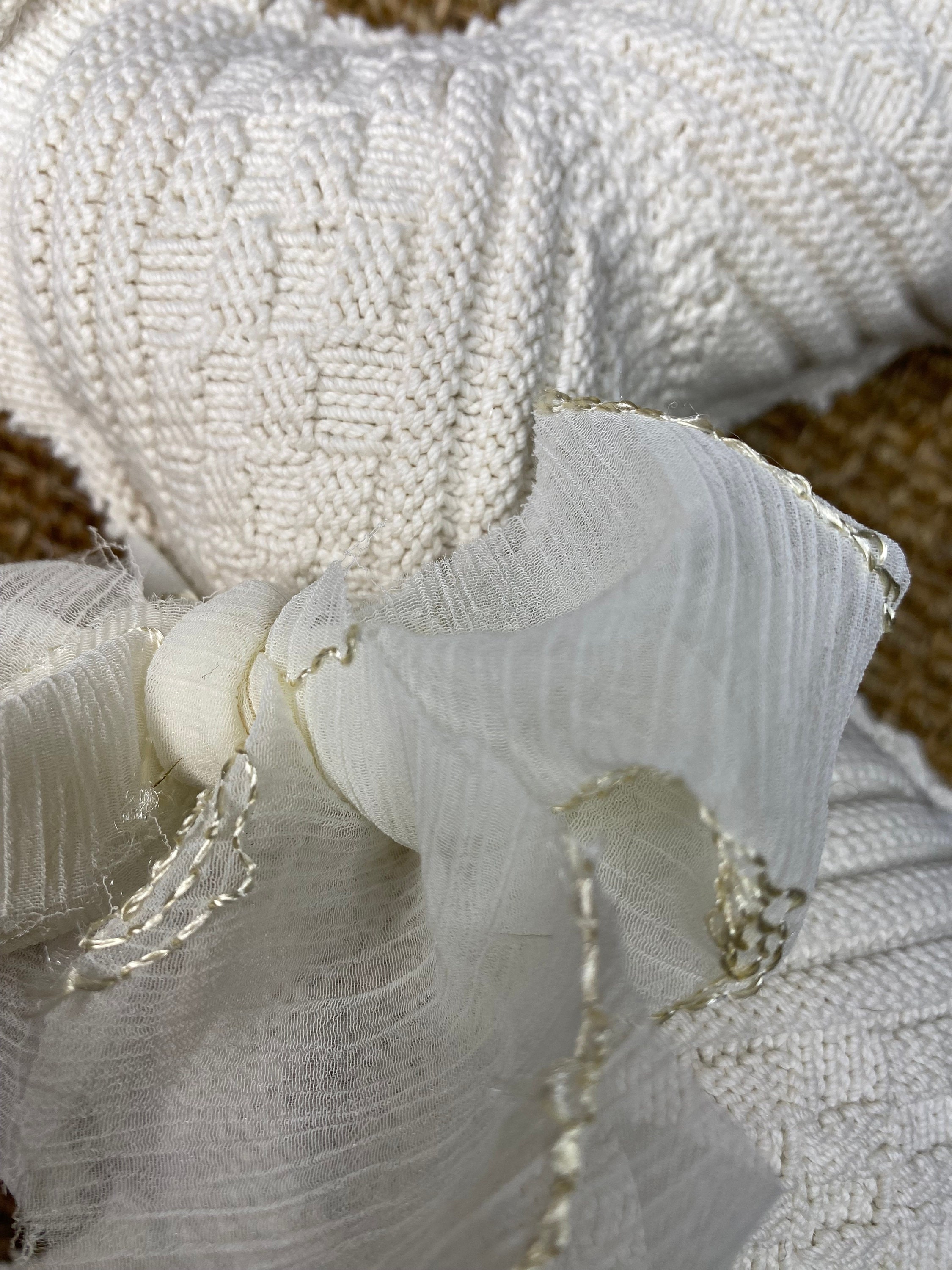 I have repurposed a gorgeously textured vintage crochet neutral textile into this XL Easter bunny here in my 1787 farmhouse studio. The reverse is a charming cotton embroidered cross stitch for a pop of surprise color on the back of the rabbit. I added a huge silk bow for extra texture.