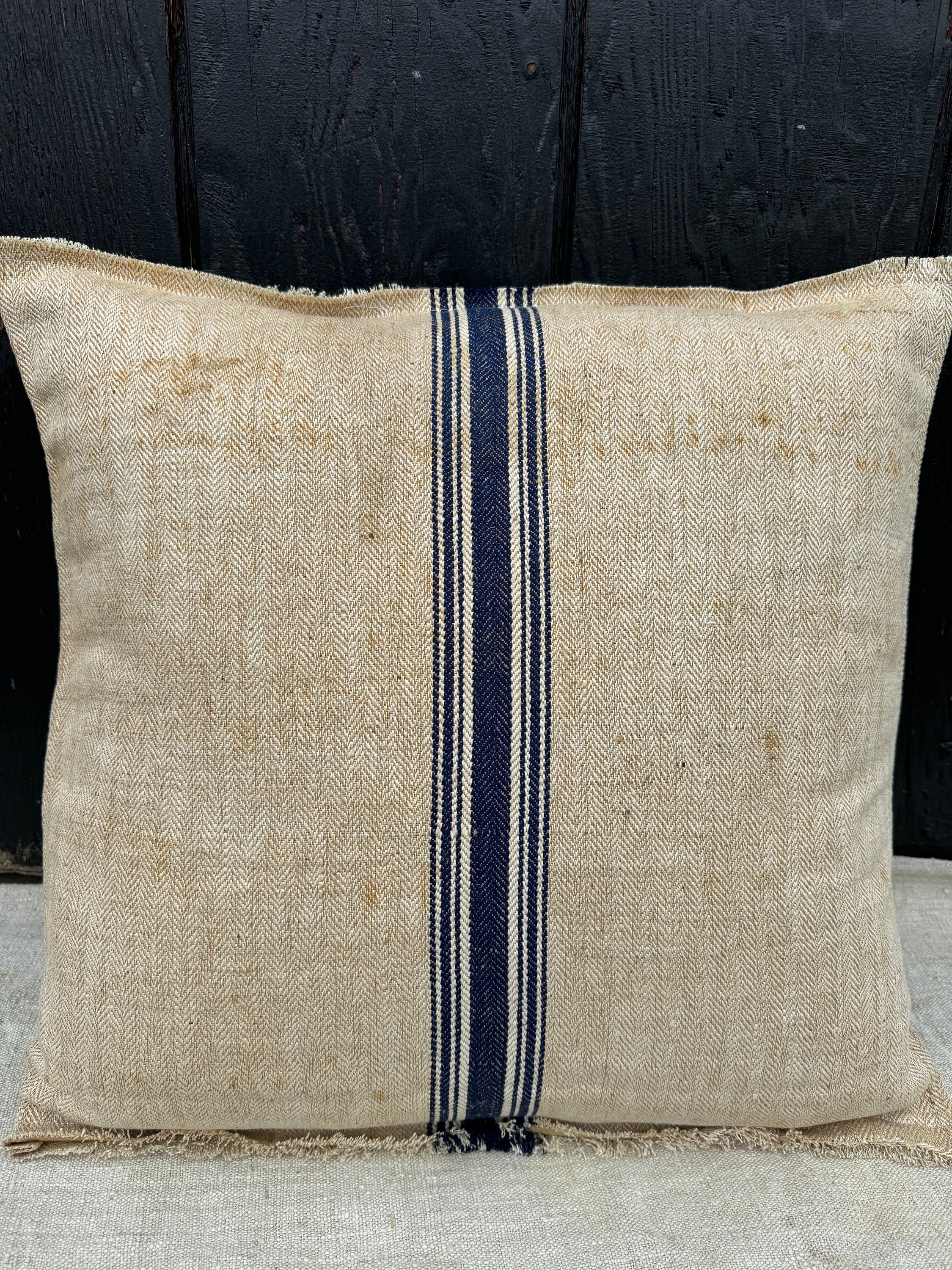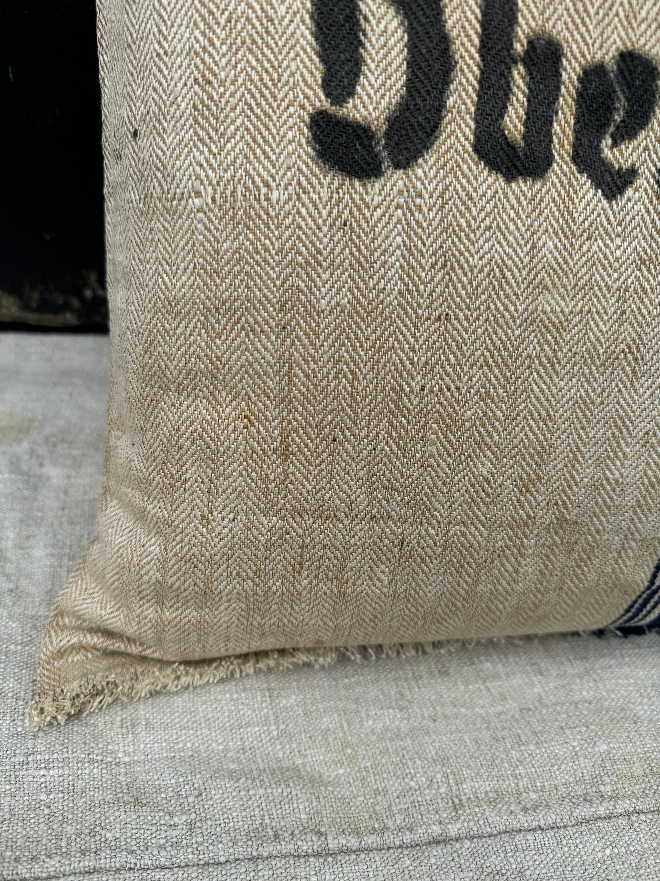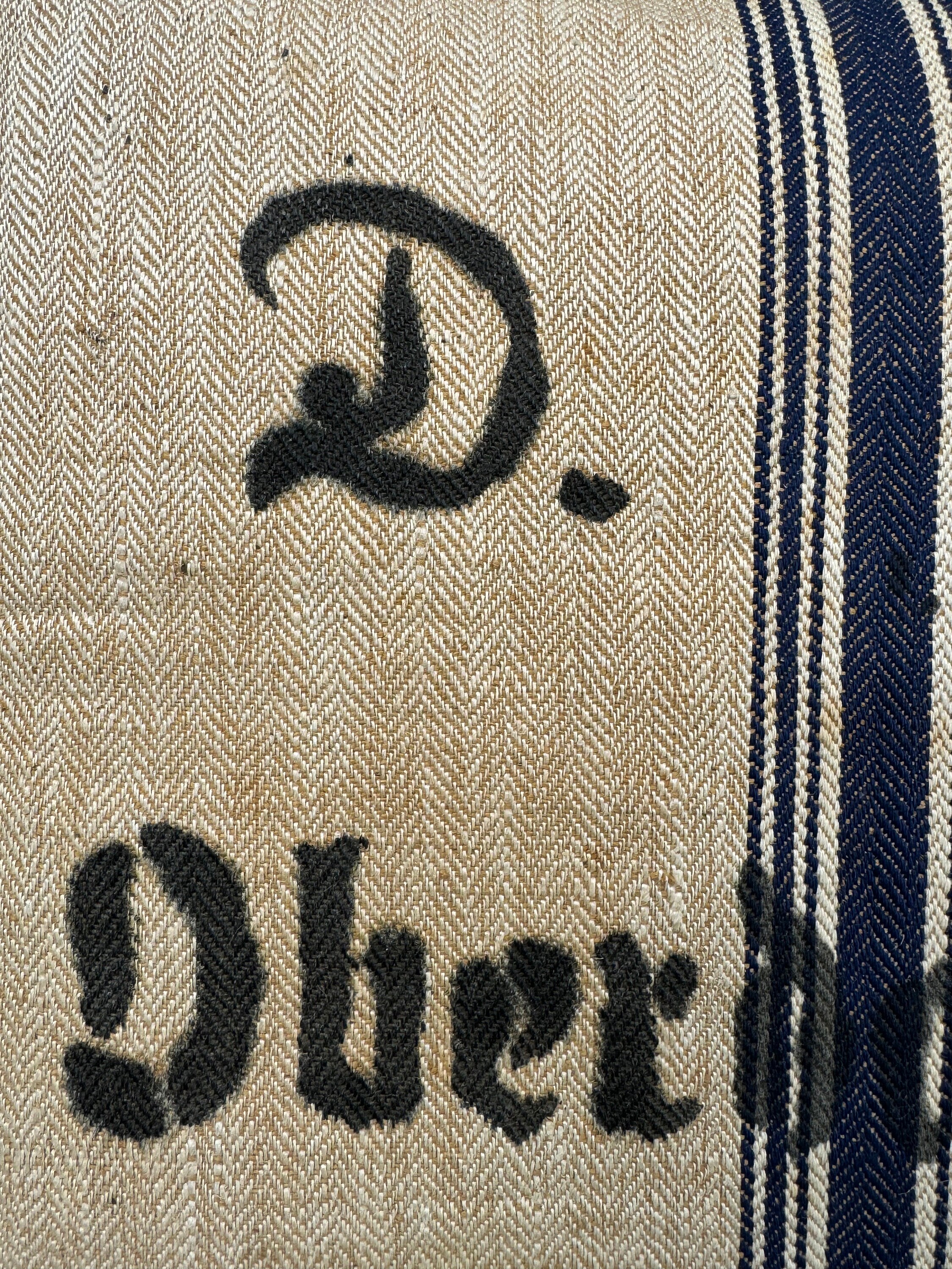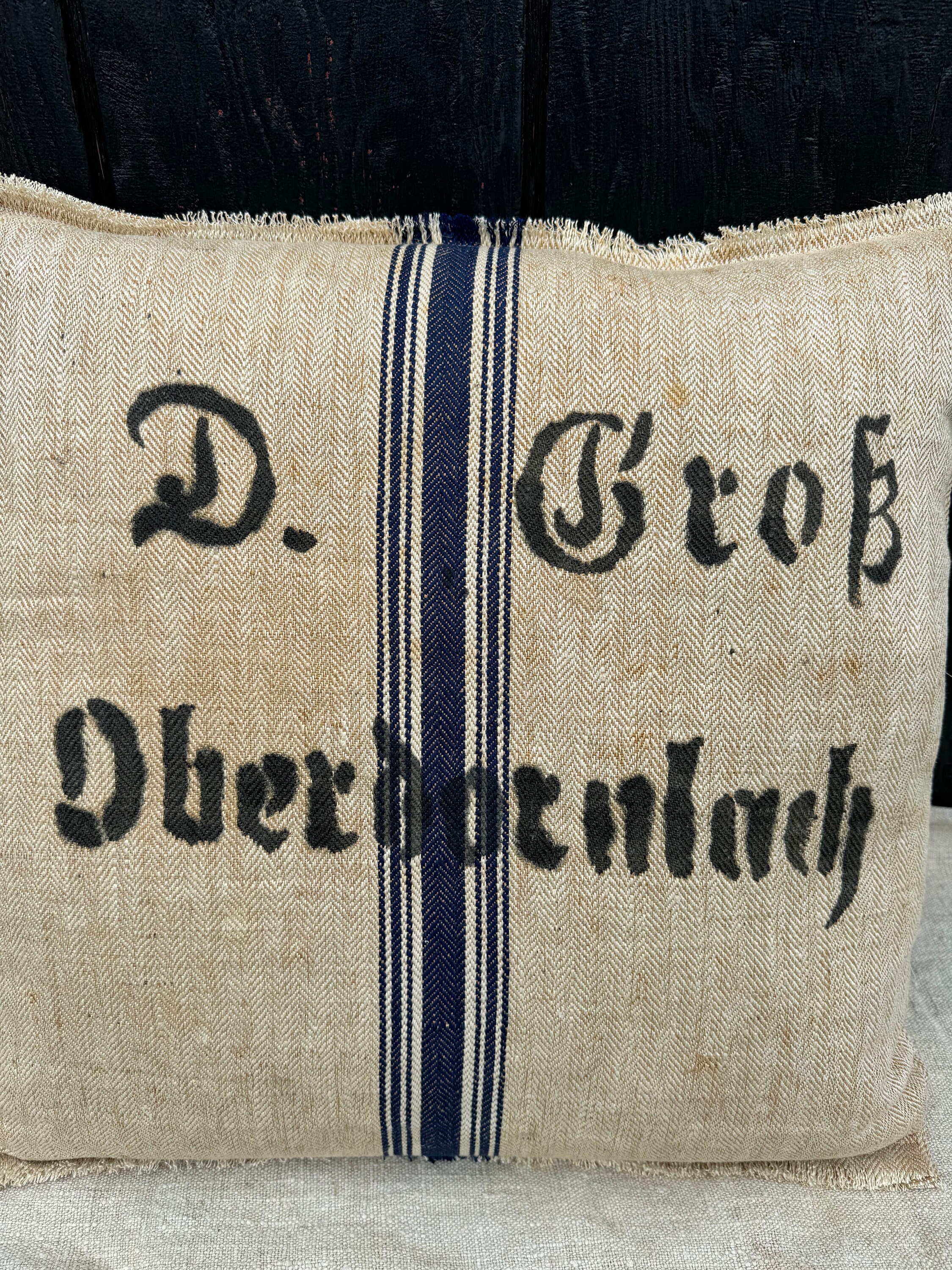 I have just returned from a buying trip to Europe and I found this incredibly RARE grain sack in a pristine herringbone with tones of khaki/beige and stripes of indigo. This charming, textured antique German grain sack has been made into a stunning 21” sofa pillow here in my 1787 farmhouse studio: I'm completely smitten with this grain sack and I have never seen one quite like it - so I snapped it up in Berlin. I jsut could not believe the timeworn color and rustic distressed textures. I really liked the super charming and bold "D. Grob, Oberdornach" stamp on the front of grain sack. When I made this pillow, I left the top and bottom of it rugged and frayed which adds to its charm. The reverse is also stamped and the same grain sack but faded: ""timothy S. Lest 47 12197."