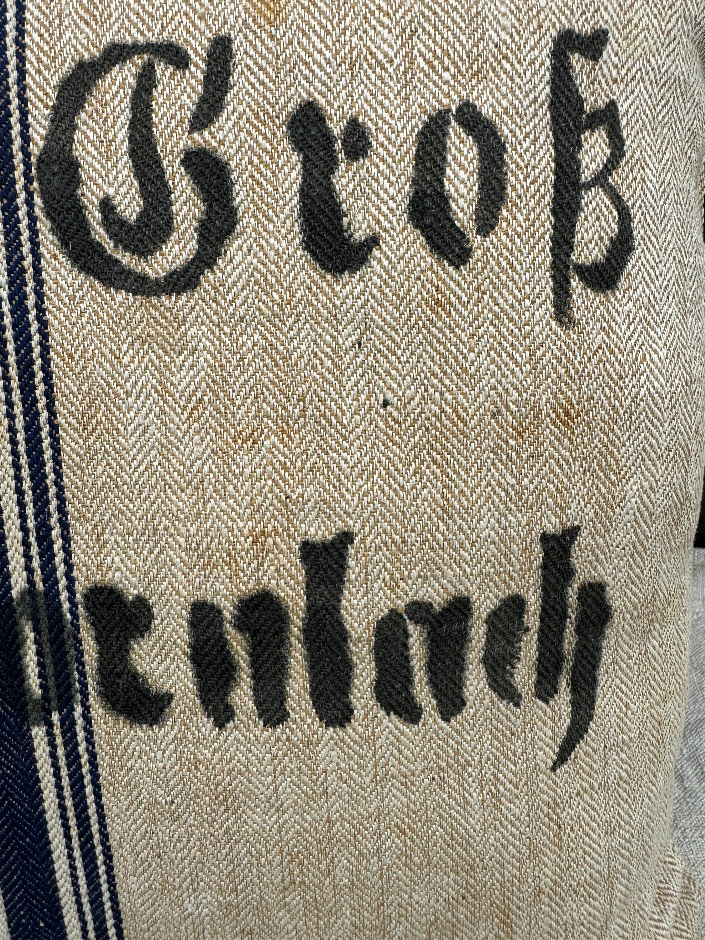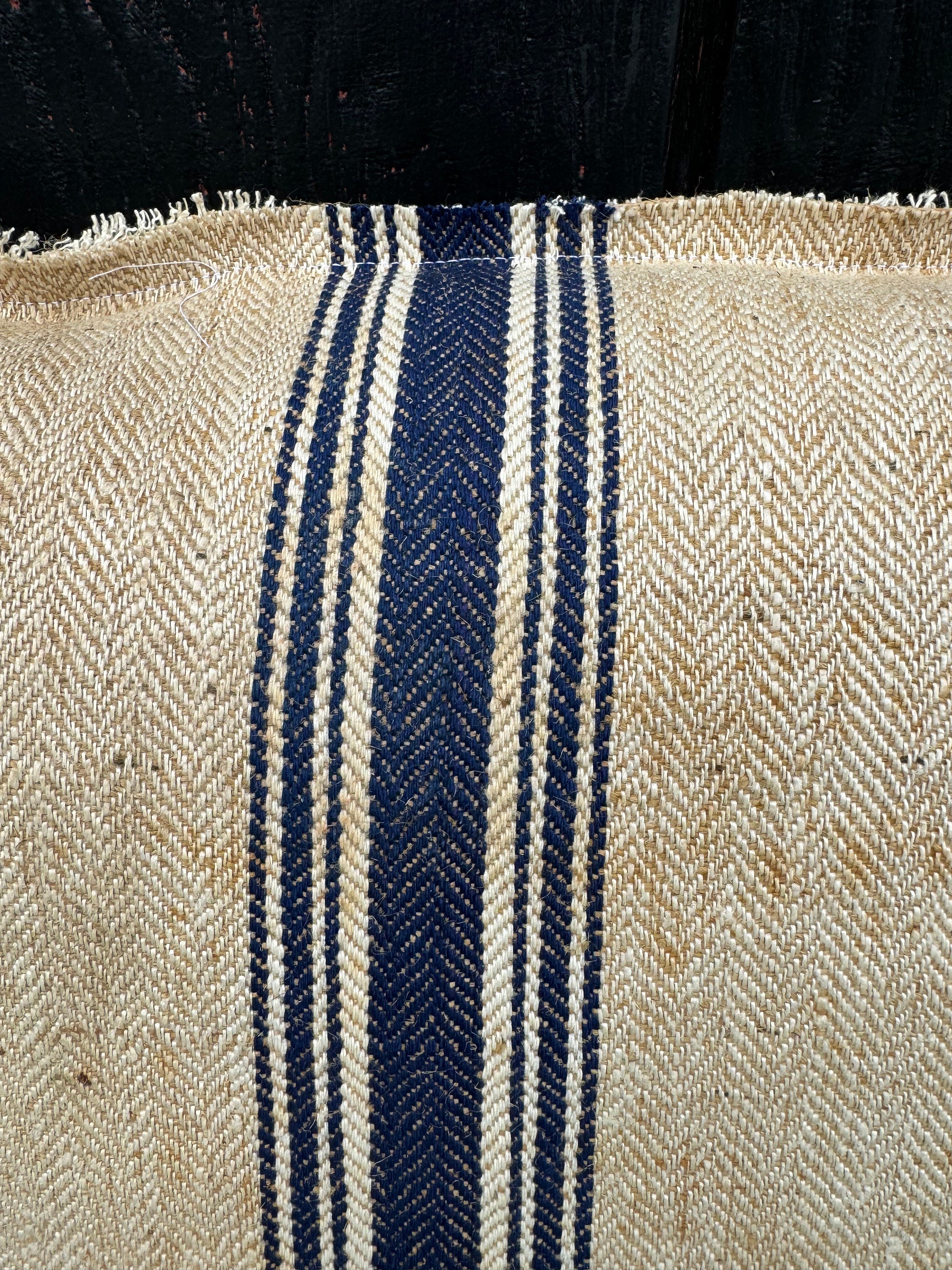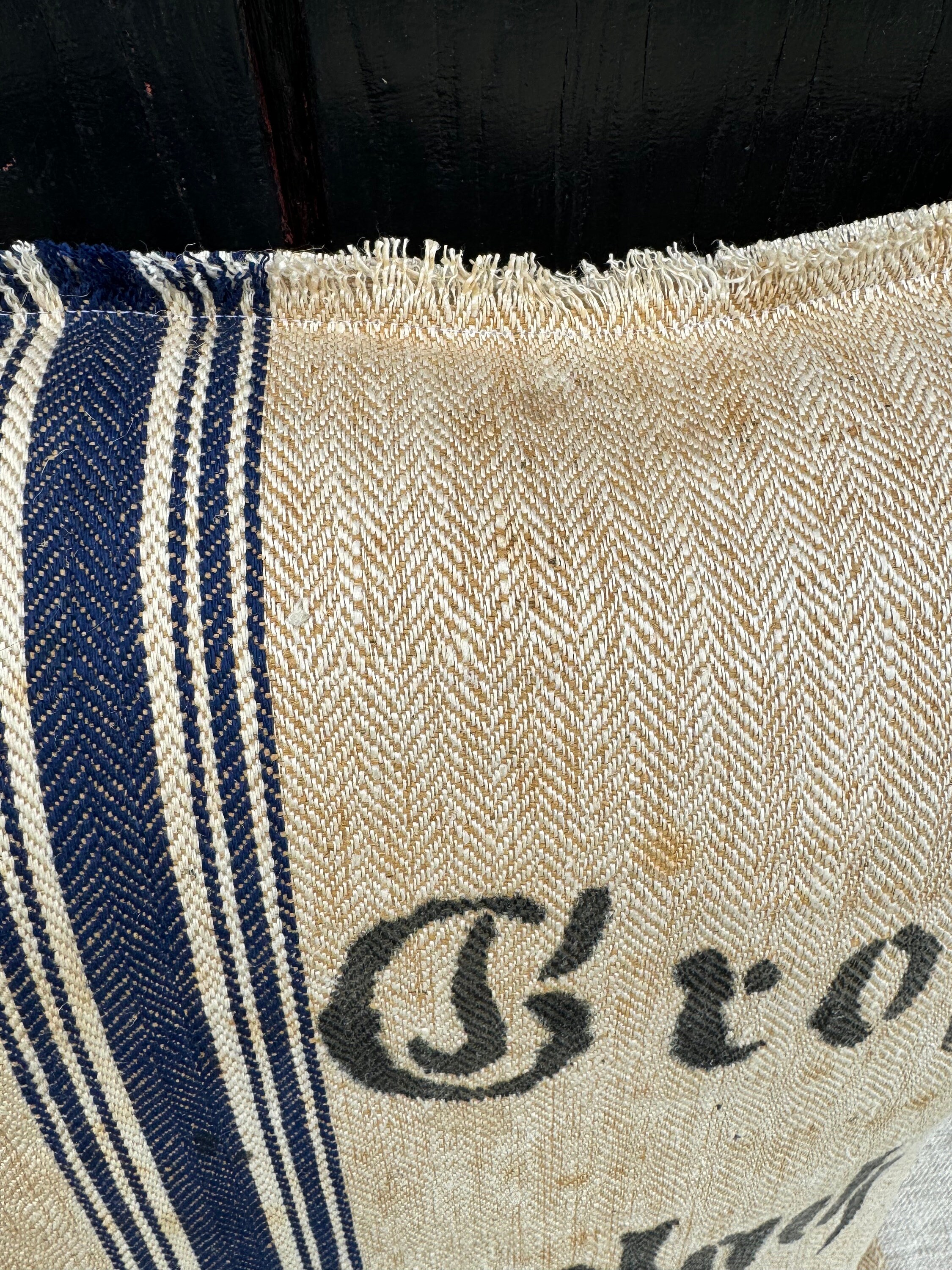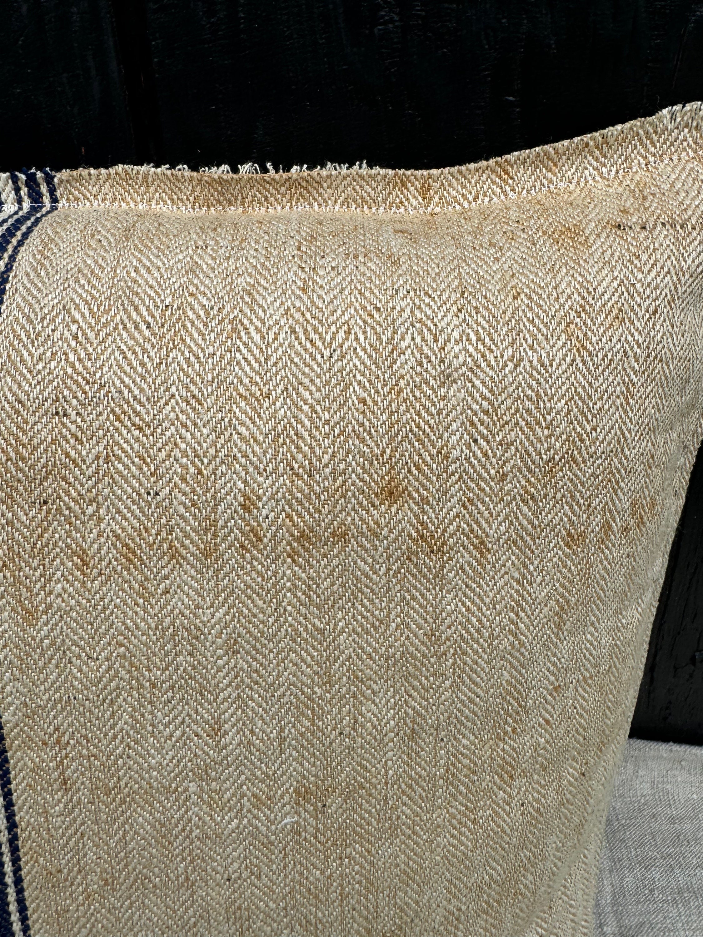 I have just returned from a buying trip to Europe and I found this incredibly RARE grain sack in a pristine herringbone with tones of khaki/beige and stripes of indigo. This charming, textured antique German grain sack has been made into a stunning 21” sofa pillow here in my 1787 farmhouse studio: I'm completely smitten with this grain sack and I have never seen one quite like it - so I snapped it up in Berlin. I jsut could not believe the timeworn color and rustic distressed textures. I really liked the super charming and bold "D. Grob, Oberdornach" stamp on the front of grain sack. When I made this pillow, I left the top and bottom of it rugged and frayed which adds to its charm. The reverse is also stamped and the same grain sack but faded: ""timothy S. Lest 47 12197."