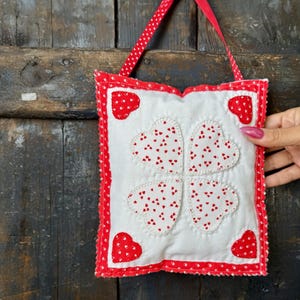 8 inch vintage RedWork quilt heart pillow depicts charming nursery rhyme ducks. It is a rare Pink embroidered Red Work quilt which is perfect for farmhouse decor or shabby cottage. Please note: this heart has been entirely hand sewn by me. This redwork quilt is just so softly worn and tattered- it is so RARE as it is embroidered in the lovliest pink. The reverse is also a quilt which adds to the charm, design and cost of the item.
