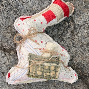 Bunny - Antique Quilt Bowl Filler, Farmhouse Cottage Easter Rabbit, Spring Home Decor, Red & Pink Distressed Quilt, charmingly tattered 10”