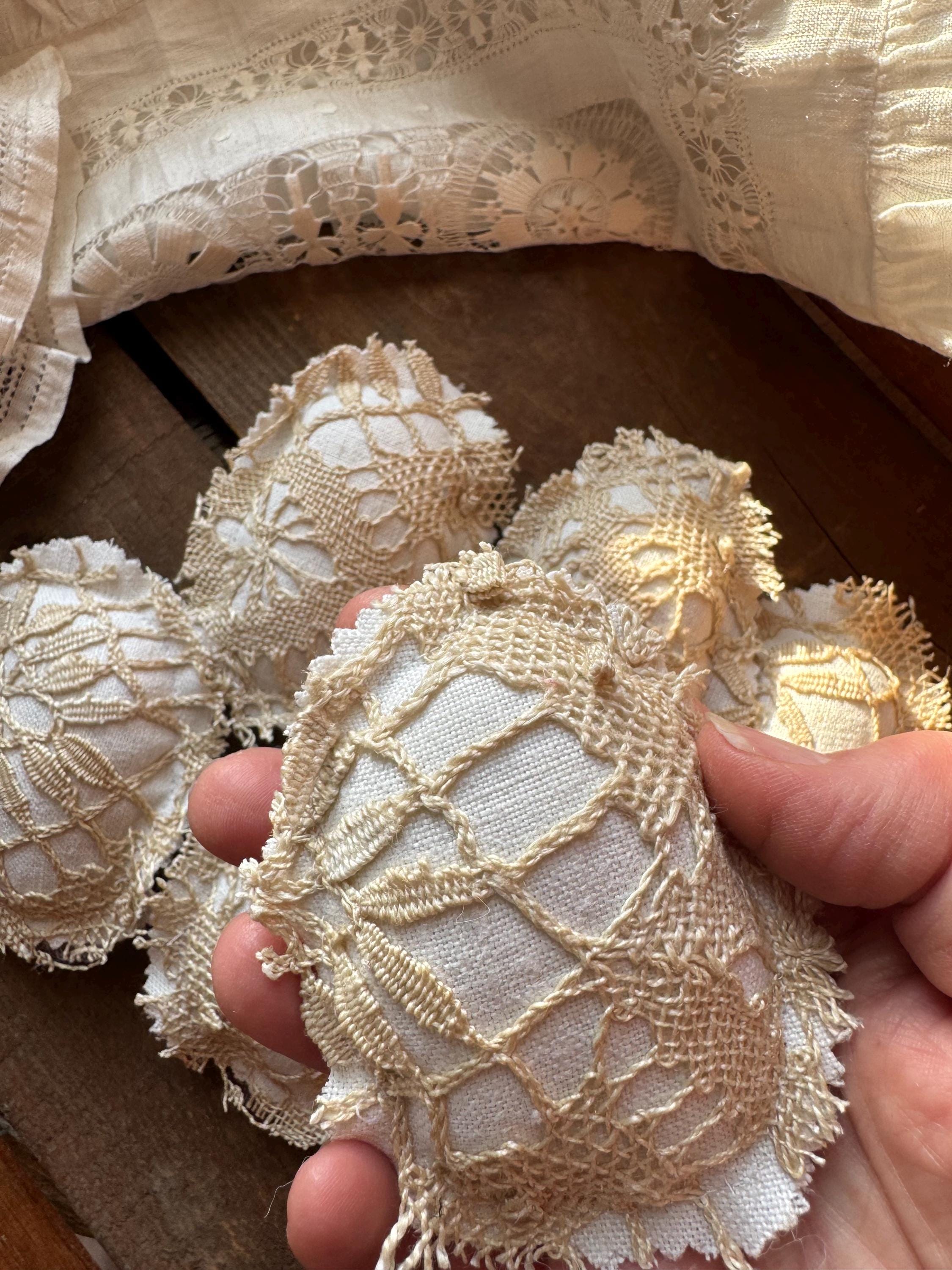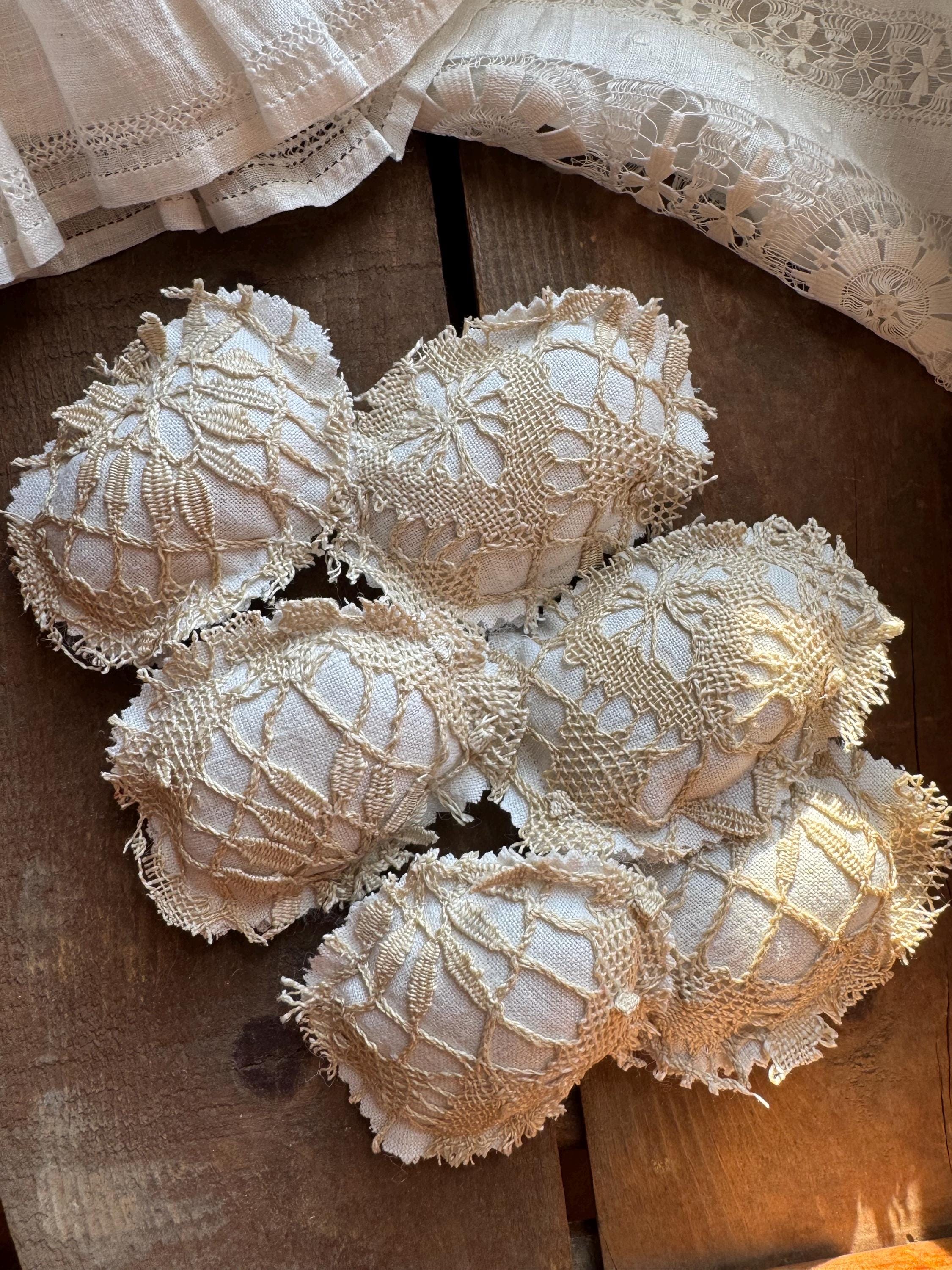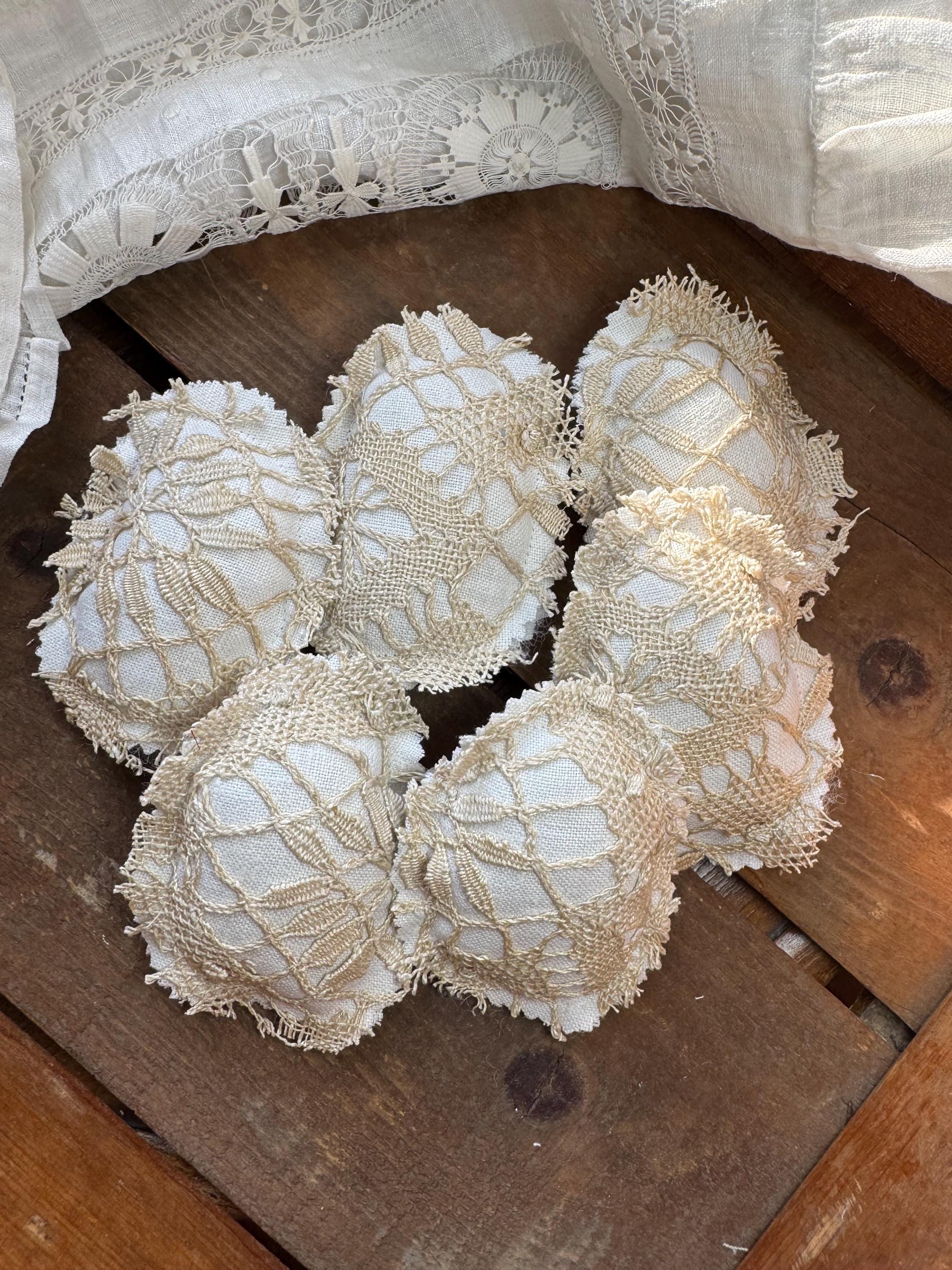 Victorian lace Easter eggs - set of 6 to fill a bow with! These charming and sweet eggs are perfect for Easter/Spring farmhouse neutral home decor, or, for a shabby cottage centerpiece tiered tray table. The eggs are hand crafted with luxe Victorian handmade beige lace and backed with the finest antique white linen (also on the reverse which adds to the charm, cost and design of these special eggs). Each 'egg' is approximately 4 inches tall and 3 inches wide.