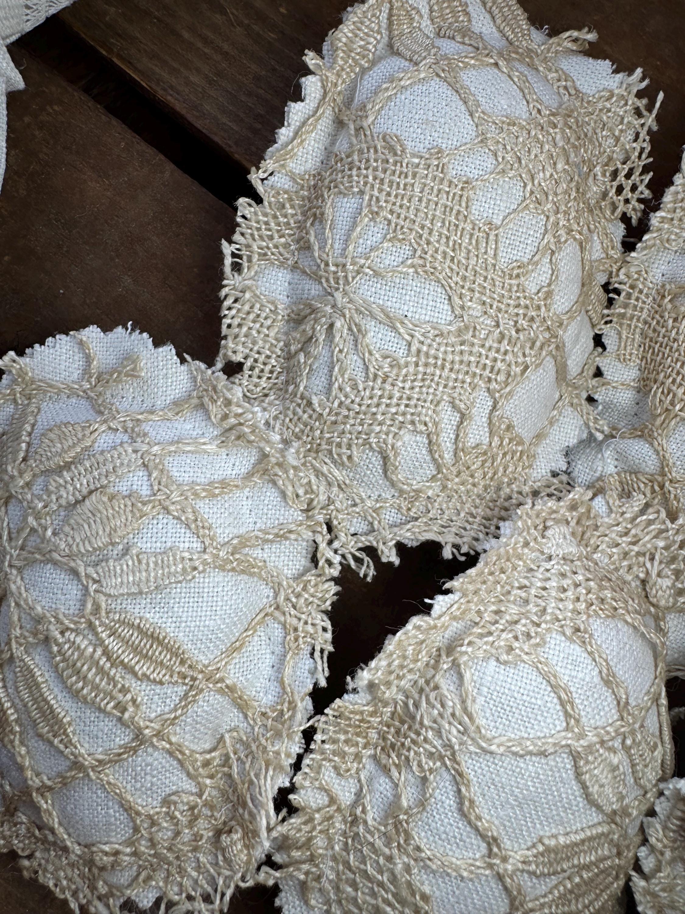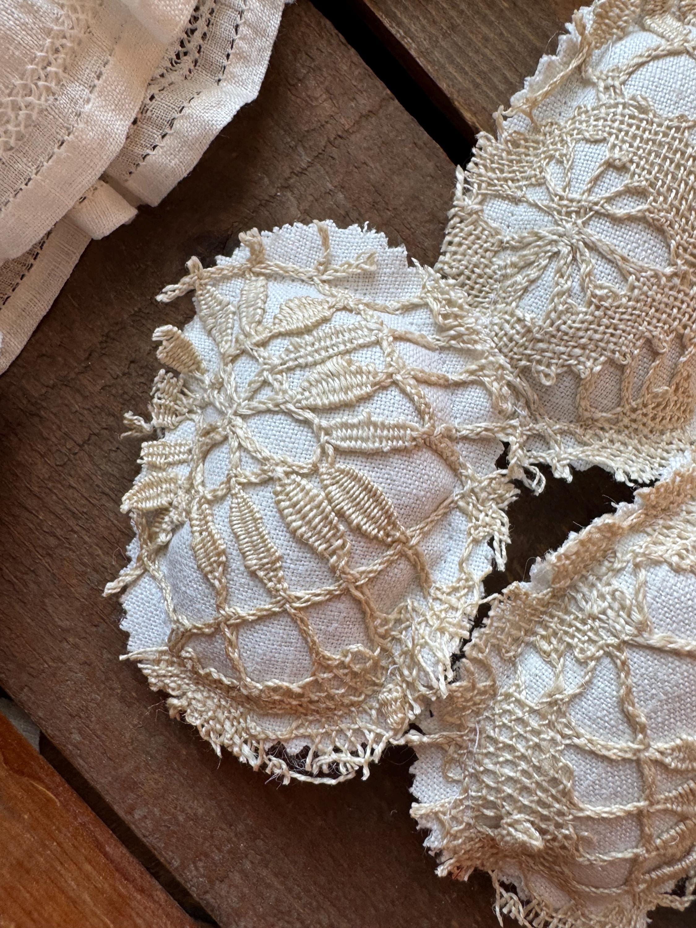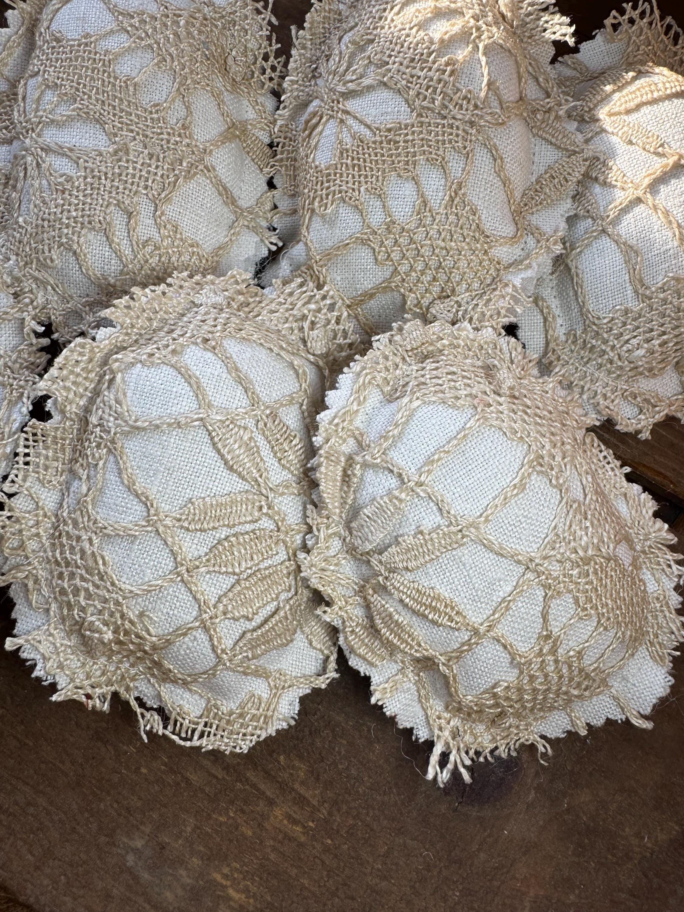 Victorian lace Easter eggs - set of 6 to fill a bow with! These charming and sweet eggs are perfect for Easter/Spring farmhouse neutral home decor, or, for a shabby cottage centerpiece tiered tray table. The eggs are hand crafted with luxe Victorian handmade beige lace and backed with the finest antique white linen (also on the reverse which adds to the charm, cost and design of these special eggs). Each 'egg' is approximately 4 inches tall and 3 inches wide.