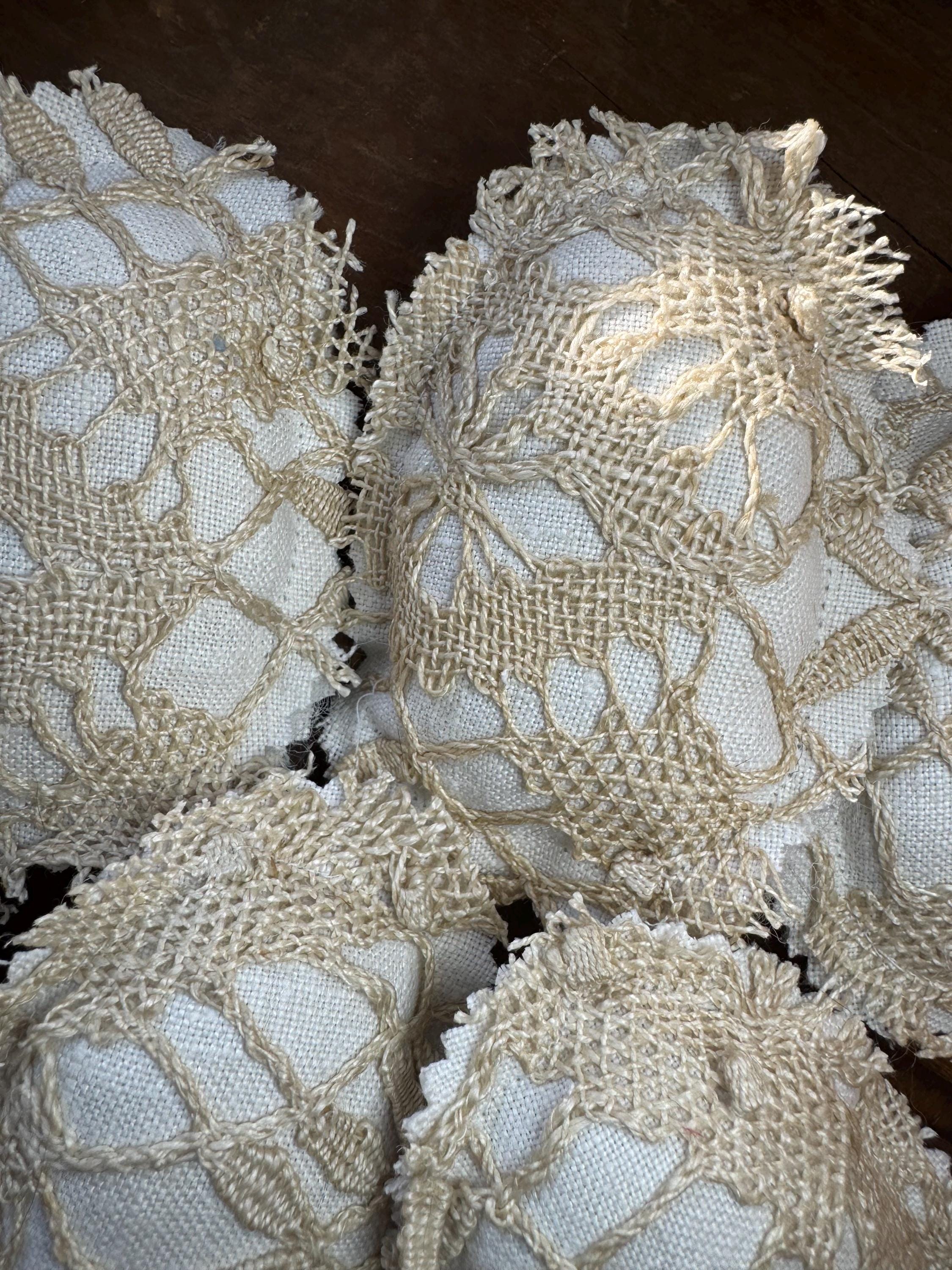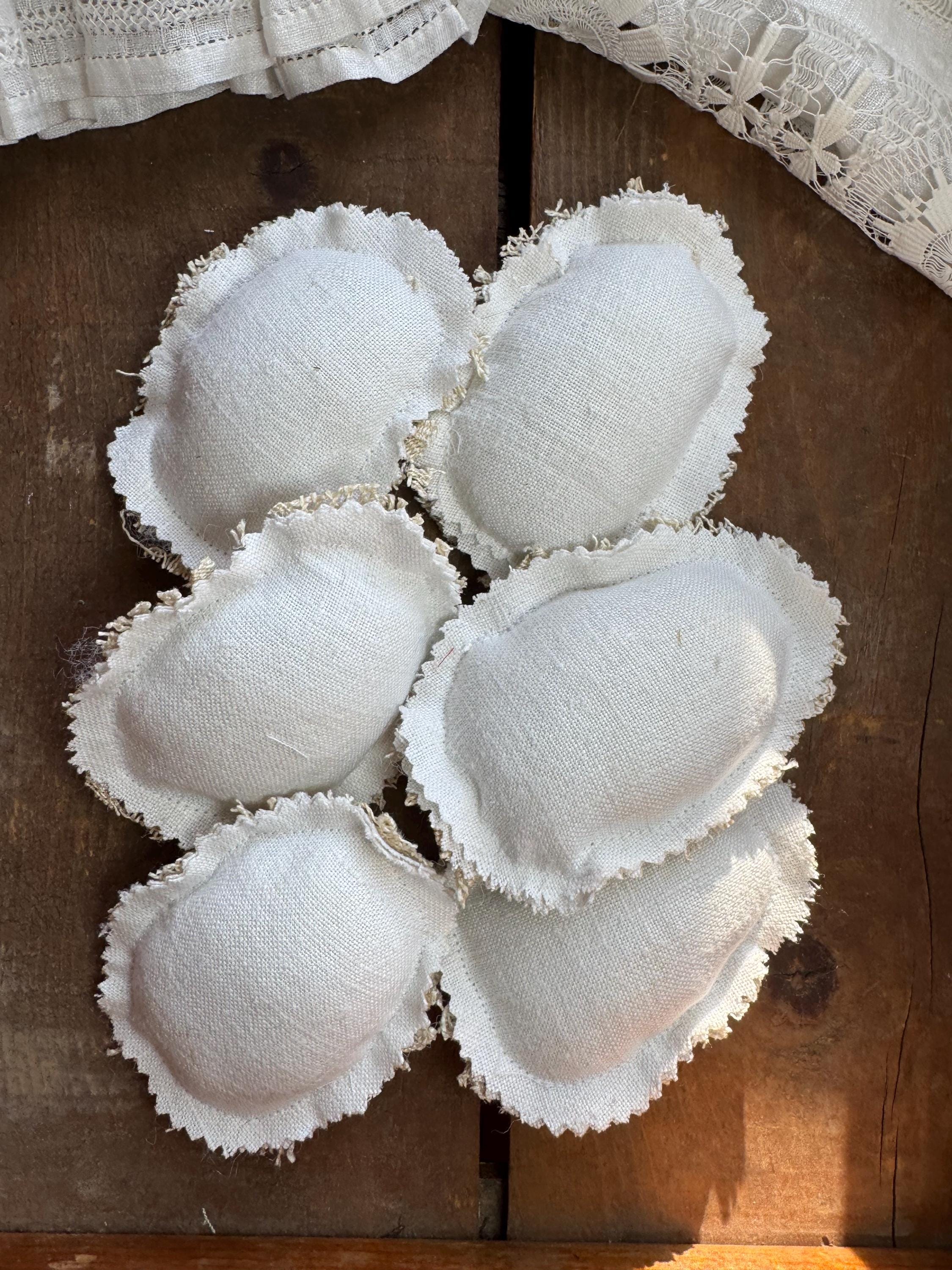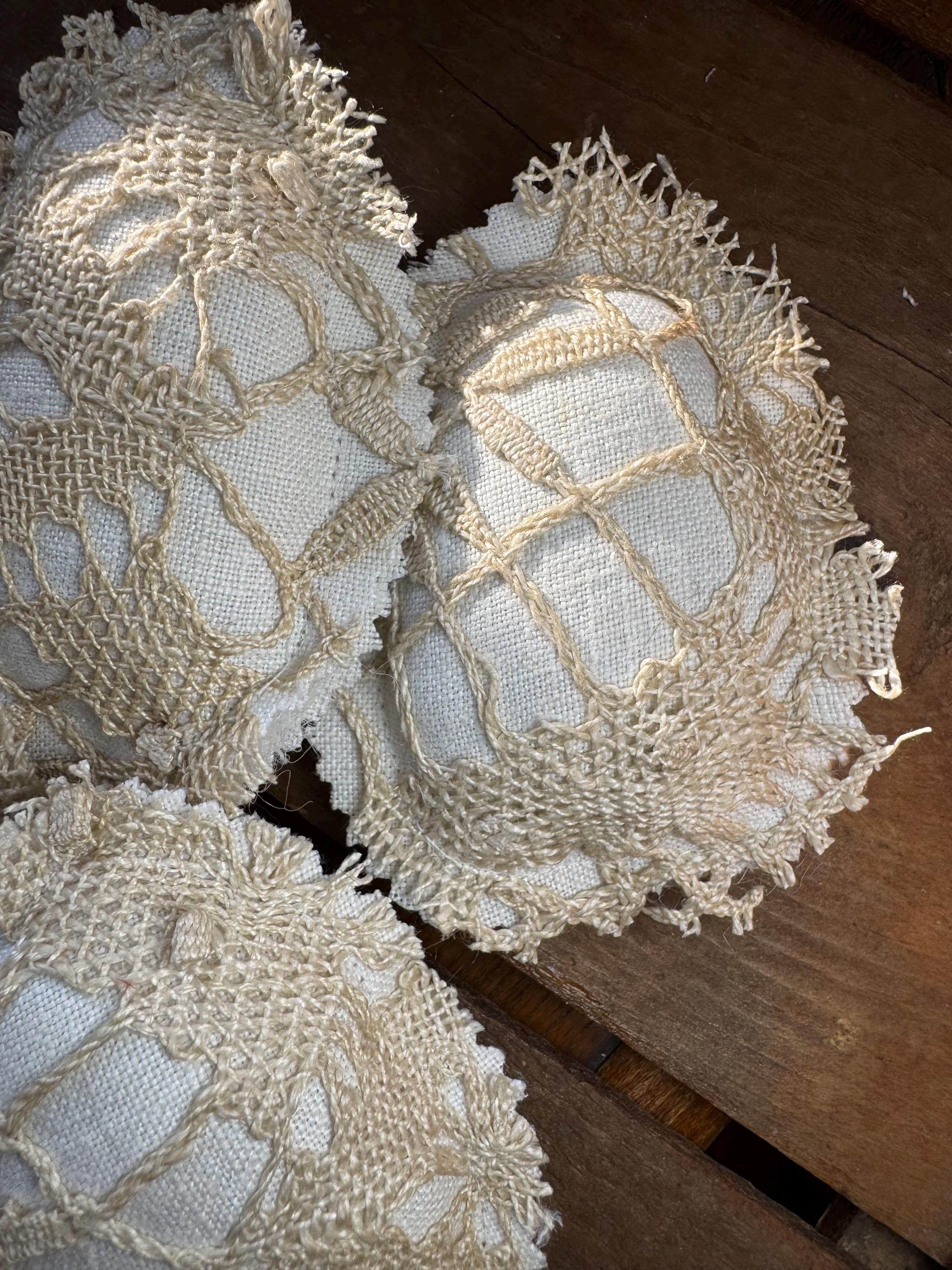 Please note: there are worn or tatters/gentle tea stains which adds to the charm of these antique eggs. Not toys. Returns not accepted for vintage textile items such as these.