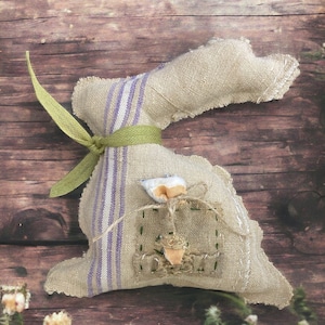 This rabbit will compliment any farmhouse, shabby cottage or Spring/Easter decor. It also would make a thoughtful gift. Approximately 18 inches tall and 9 inches wide. Please note the worn nature of the antique quilt as there is some tea staining, worn areas or tatters which adds to its charm. The price reflects the rarity of antique and textiles which are getting increasingly hard to find - and as I added a large piece of a vintage chenille quilt to the reverse, the textiles to make this one of a kind bunny are more costly.