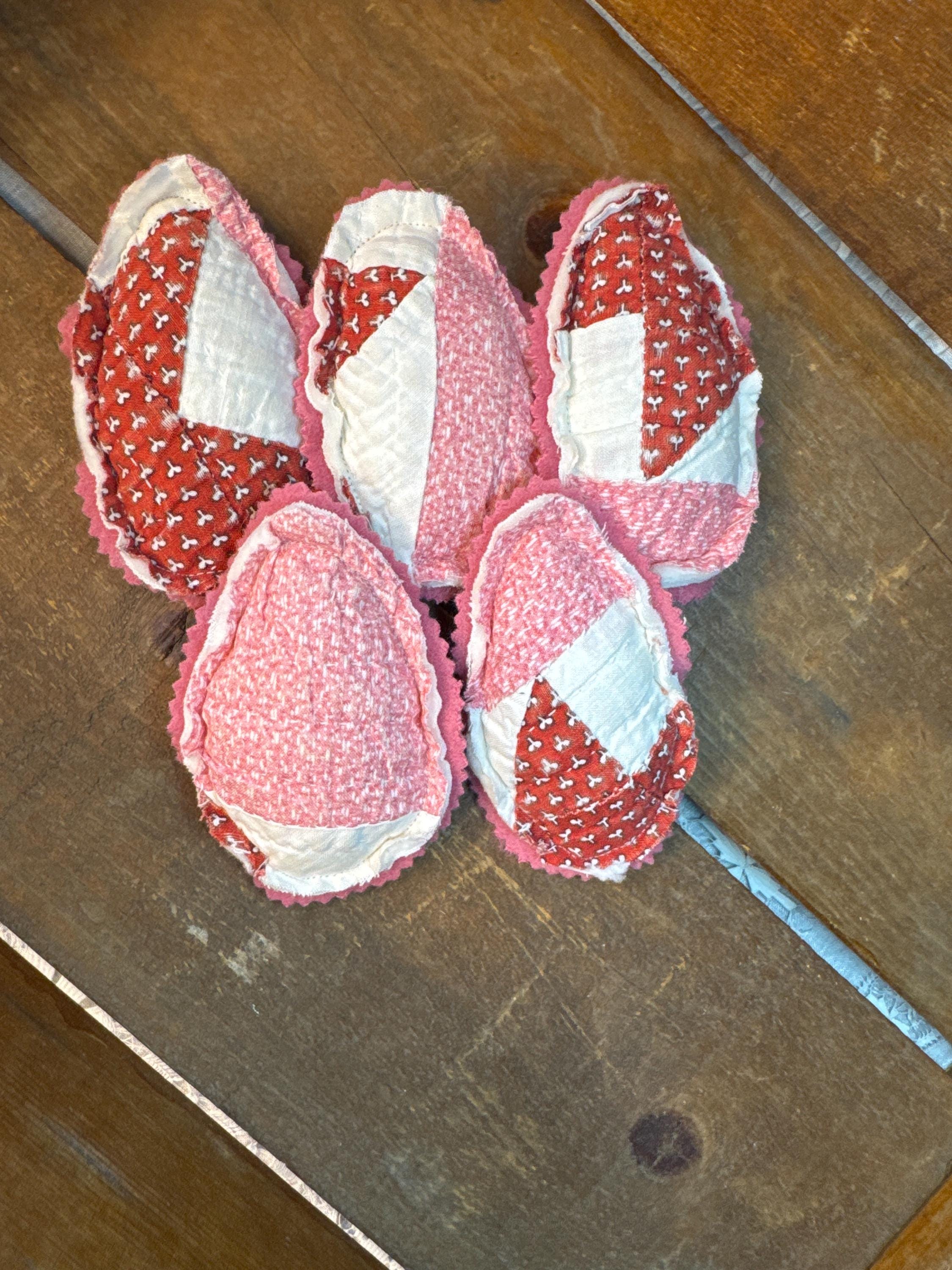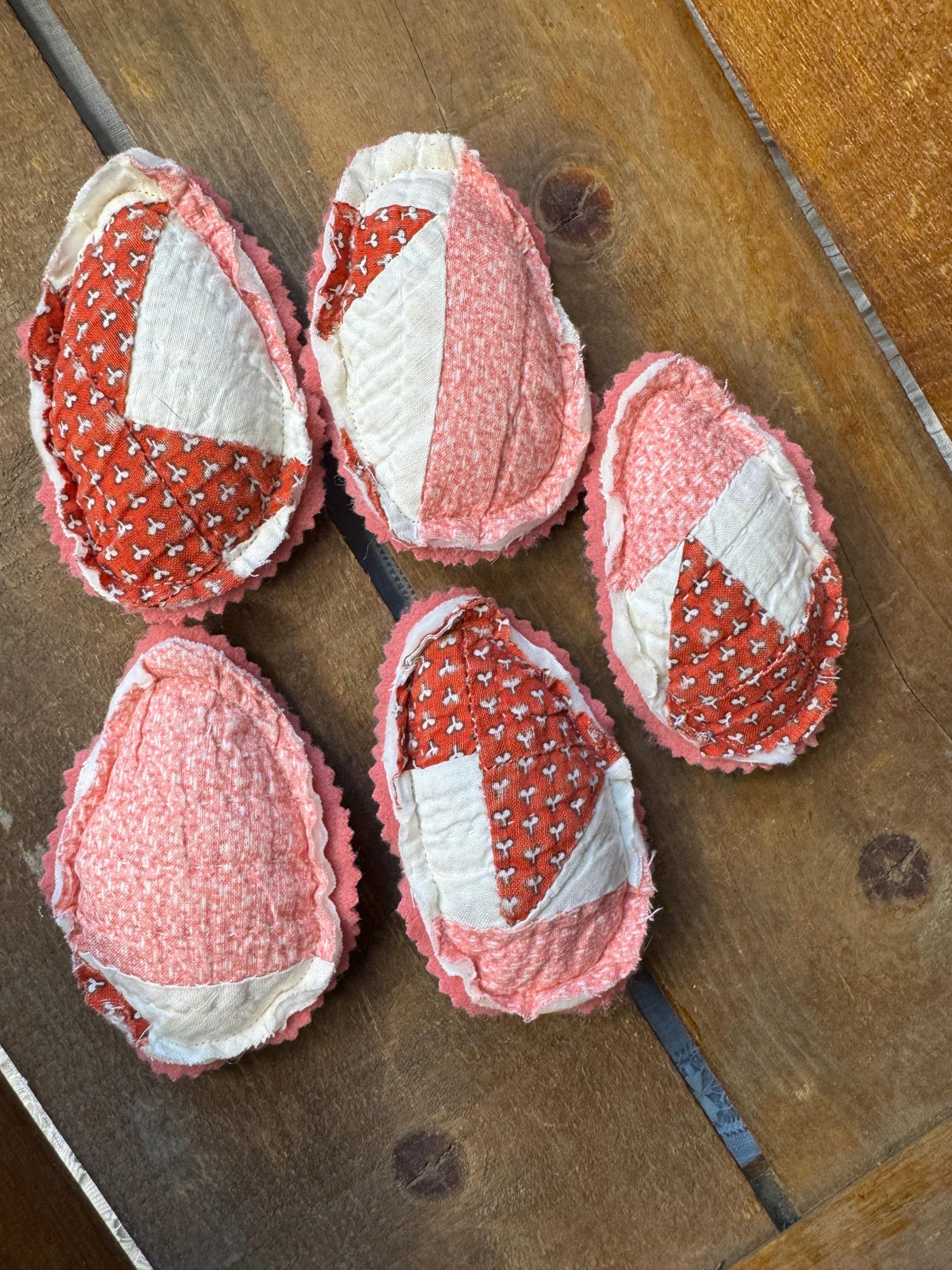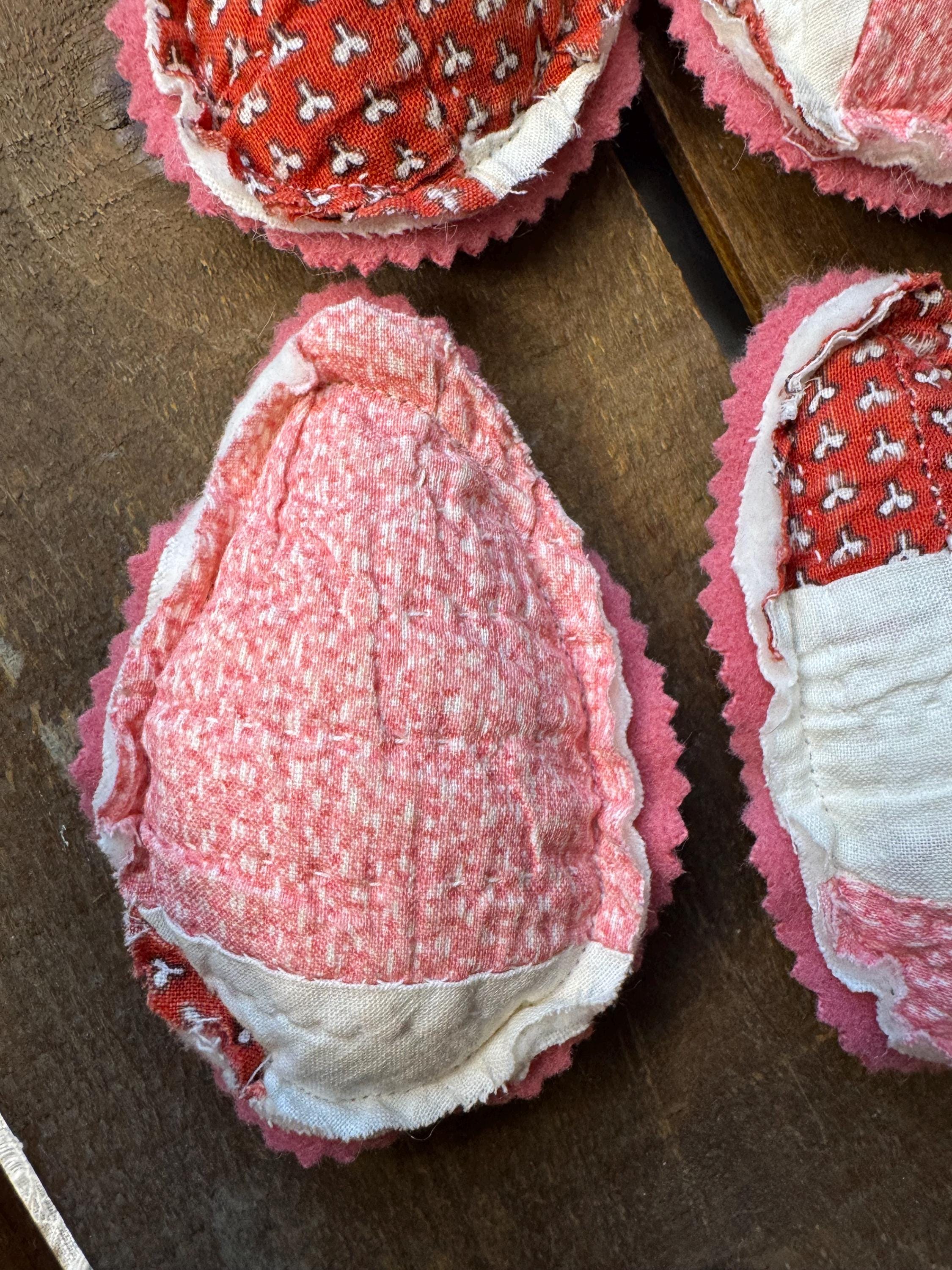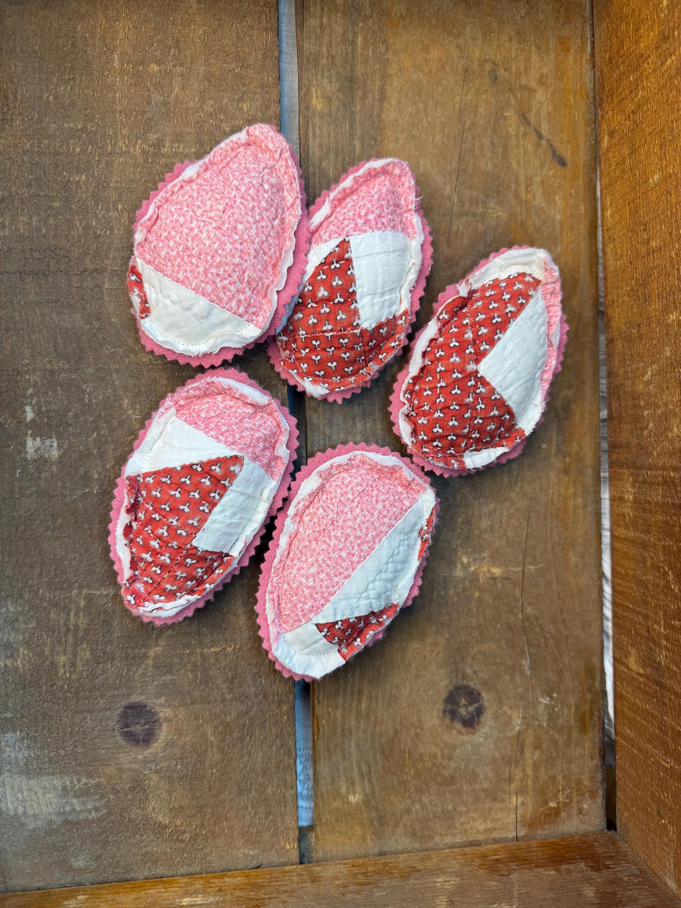 Set of FIVE antique quilt Easter eggs- charmingly tattered set to fill a bowl with them! Easter or Spring farmhouse home decor - so adorable. Perfect for any shabby centerpiece tier tray, as a wedding or event favor, or a handmade gift. Just cute! Each 'egg' made from a antique old quilt and is approximately 4 inches tall and 3 inches wide. The reverse for each egg is a pretty pink vintage wool.