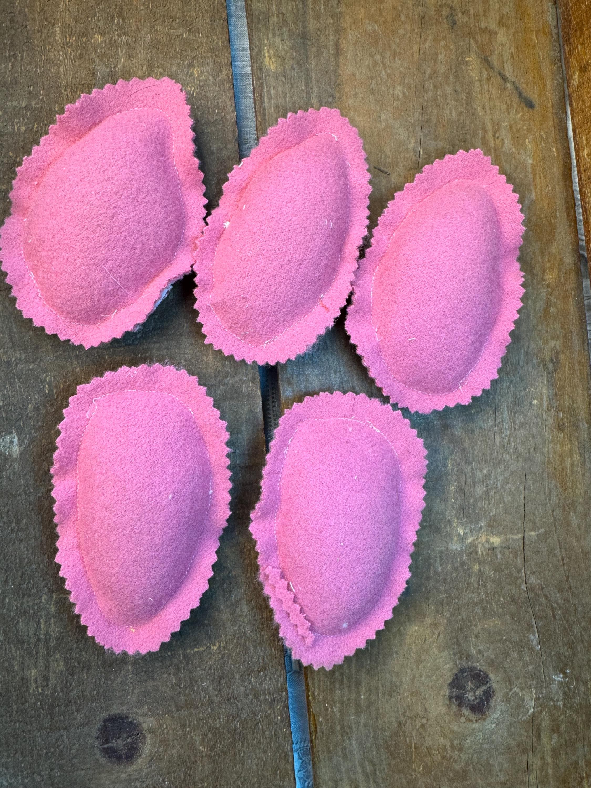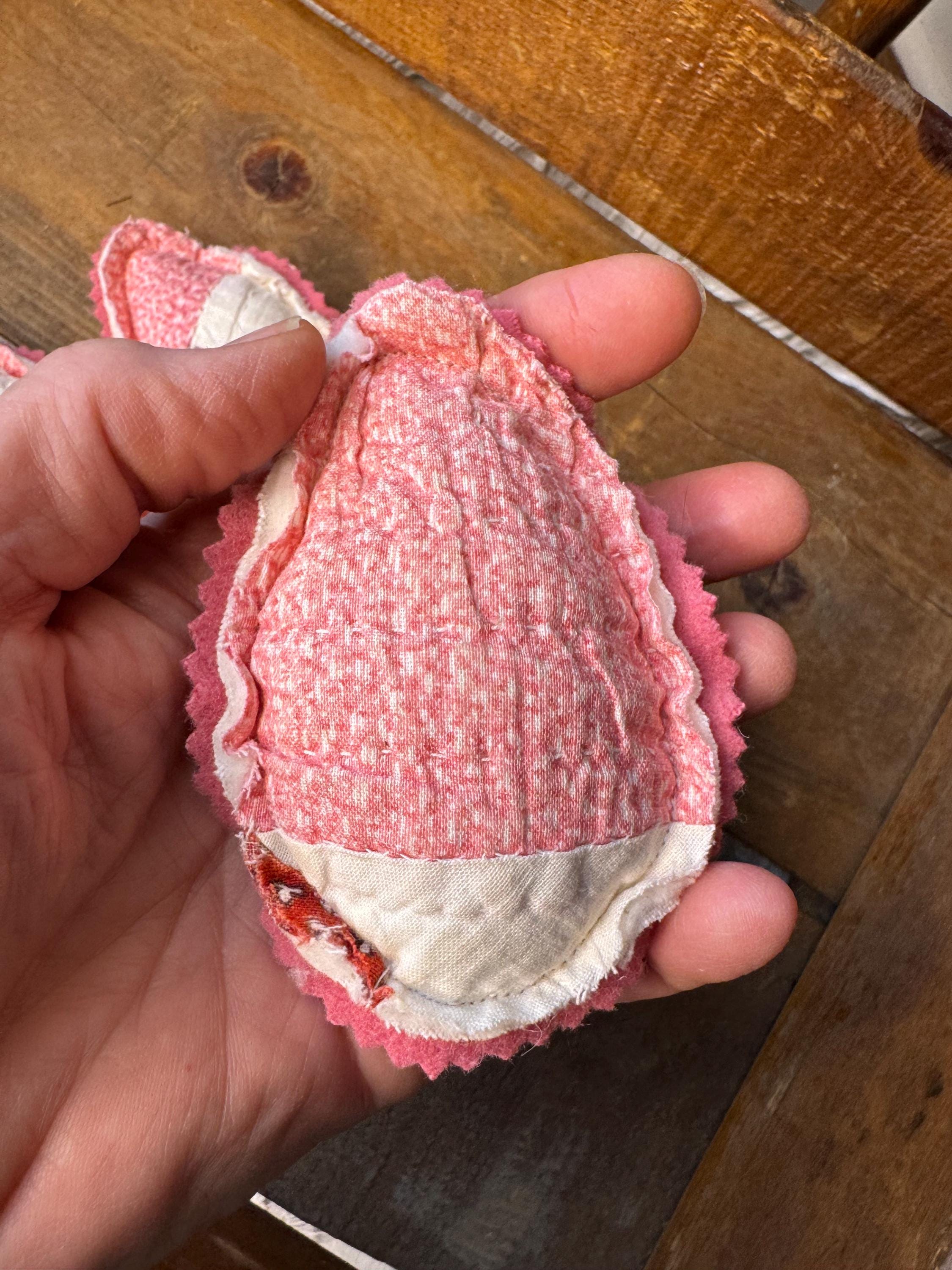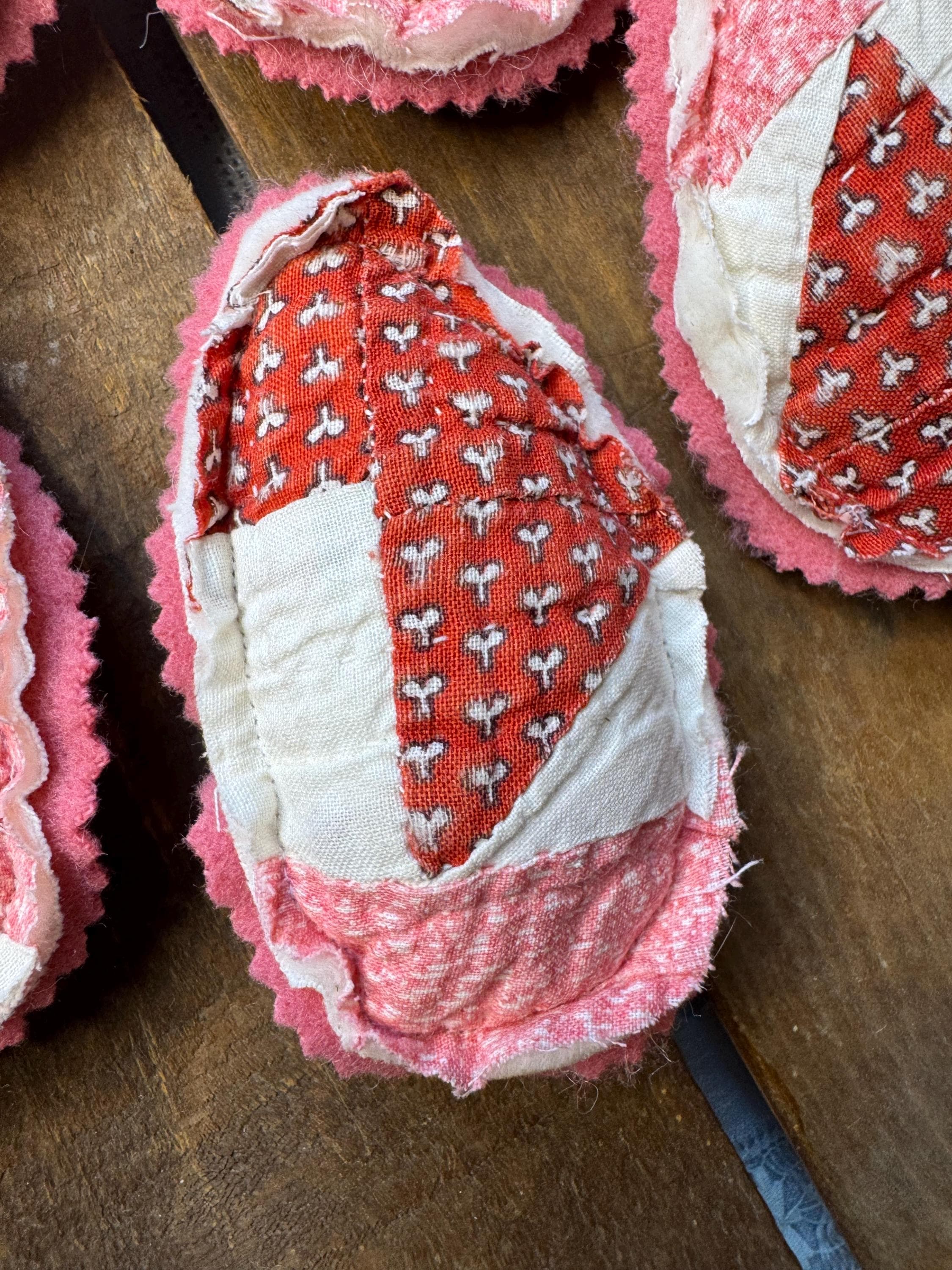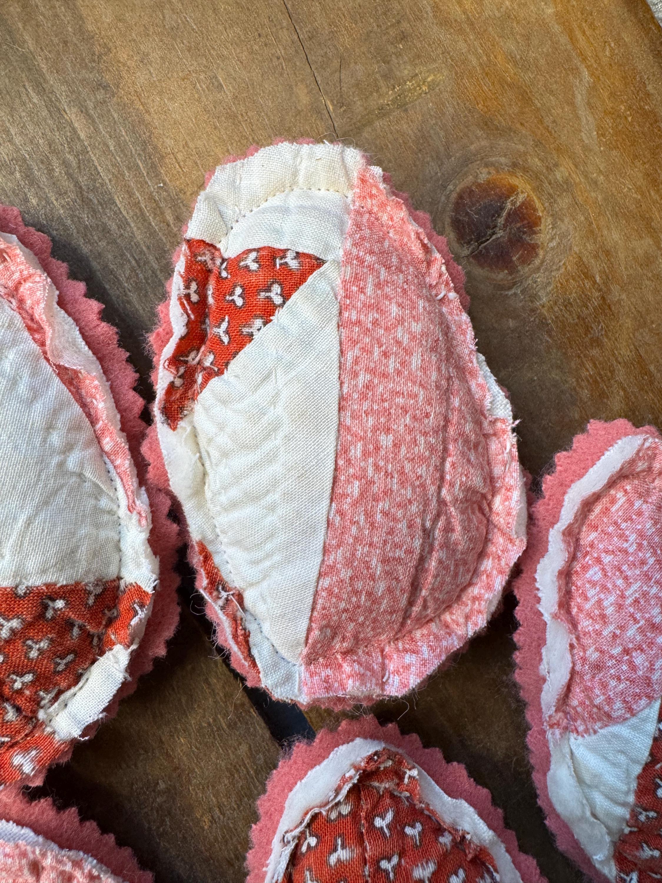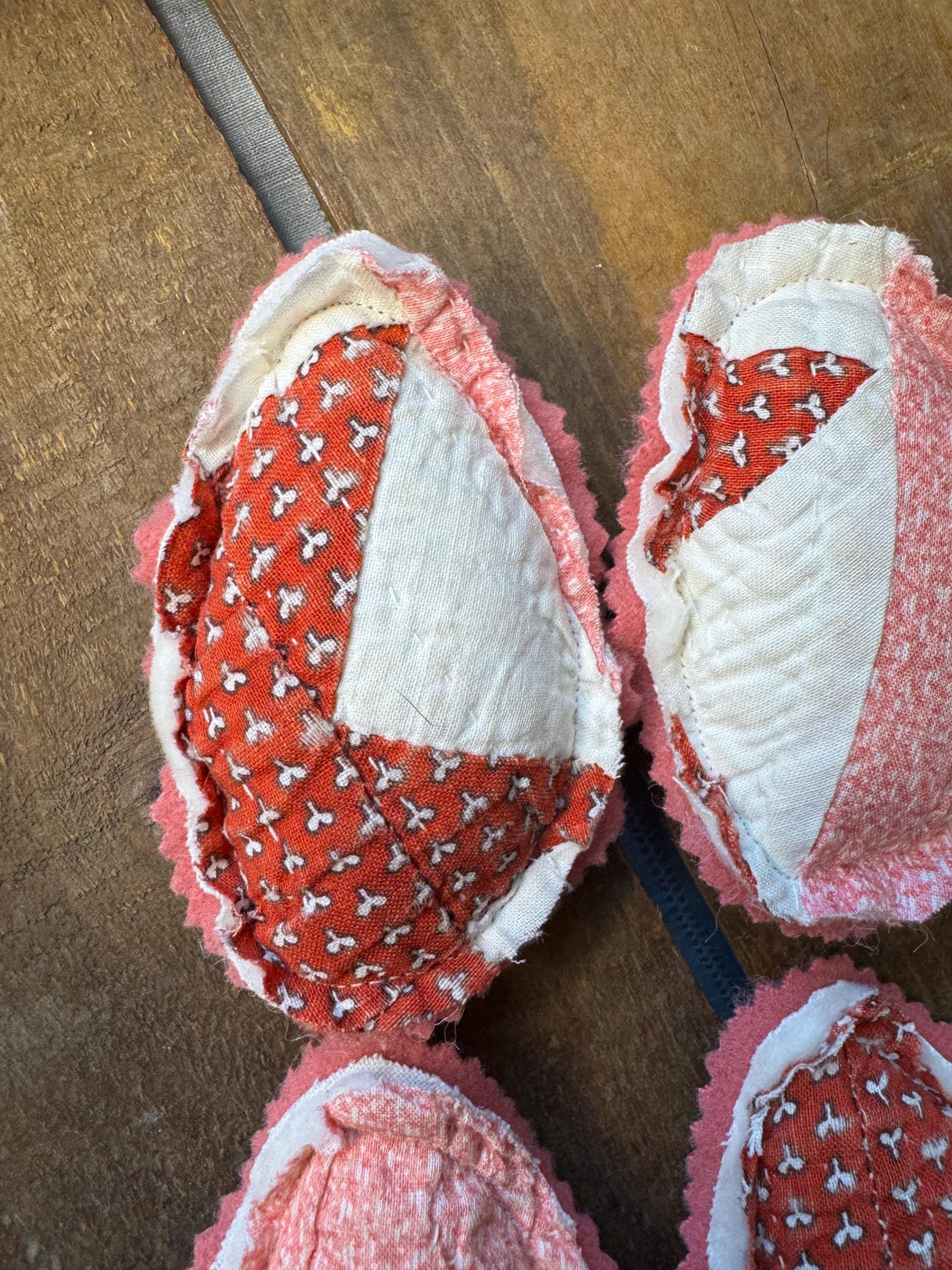 Set of FIVE antique quilt Easter eggs- charmingly tattered set to fill a bowl with them! Easter or Spring farmhouse home decor - so adorable. Perfect for any shabby centerpiece tier tray, as a wedding or event favor, or a handmade gift. Just cute! Each 'egg' made from a antique old quilt and is approximately 4 inches tall and 3 inches wide. The reverse for each egg is a pretty pink vintage wool.