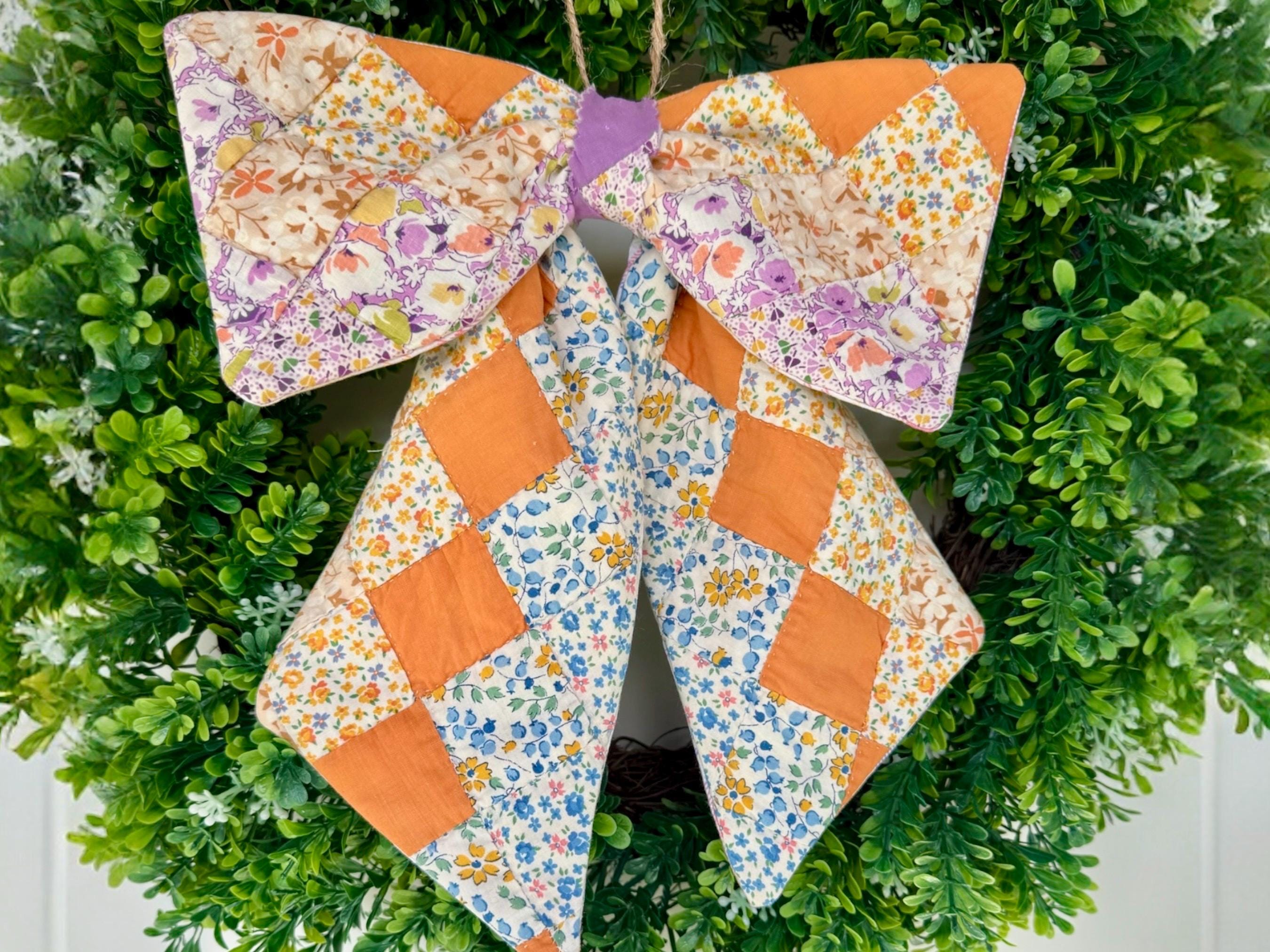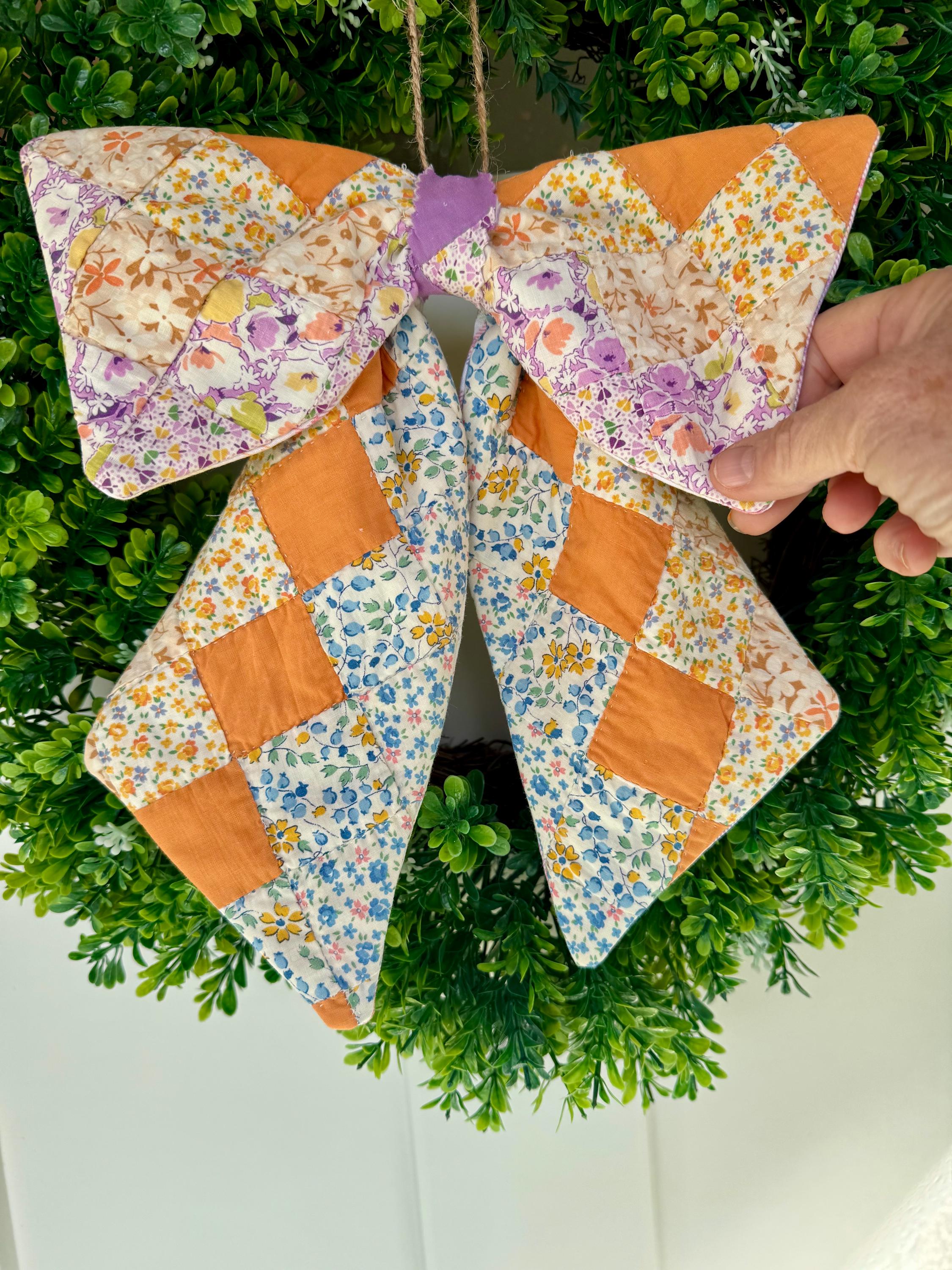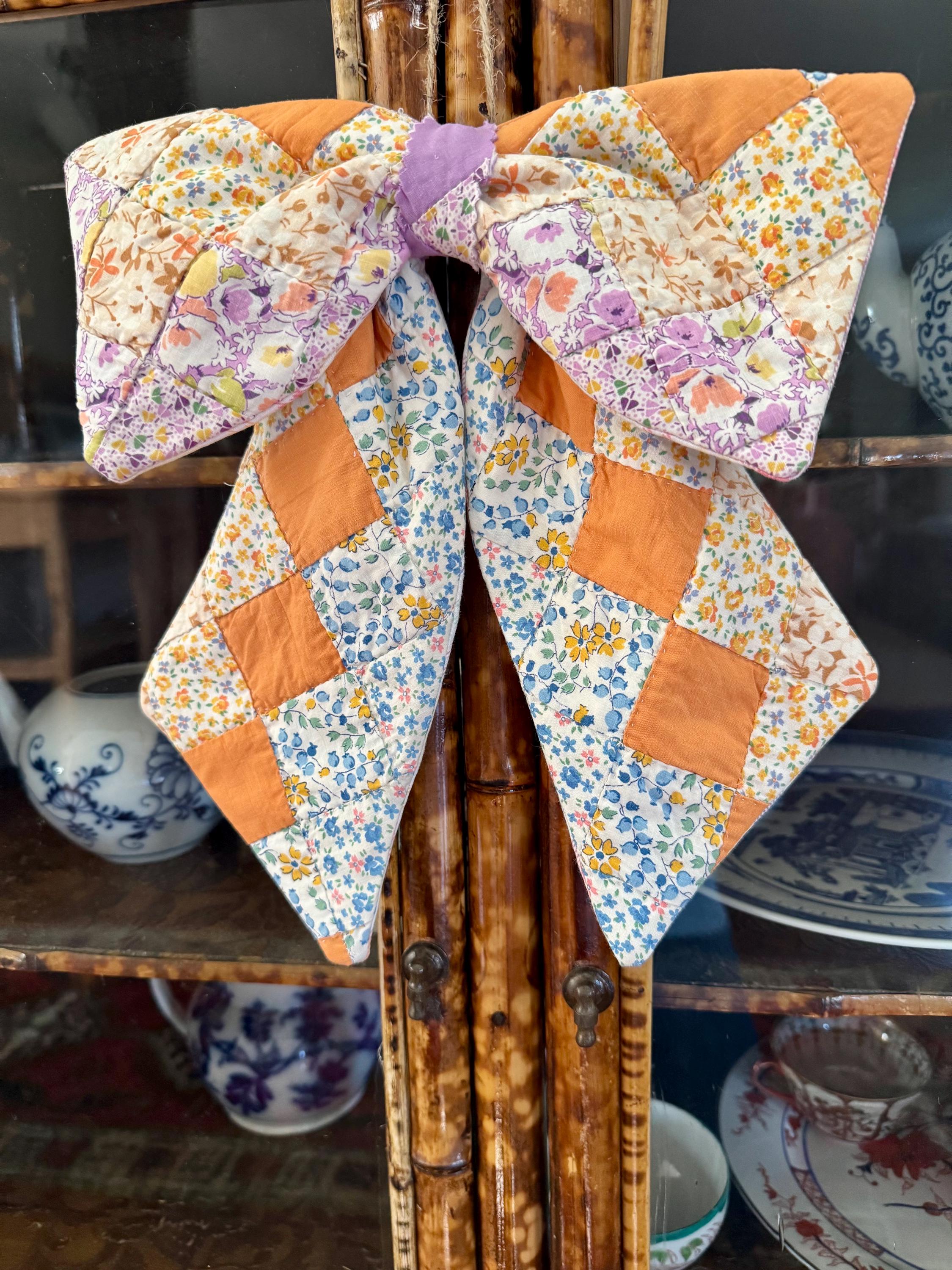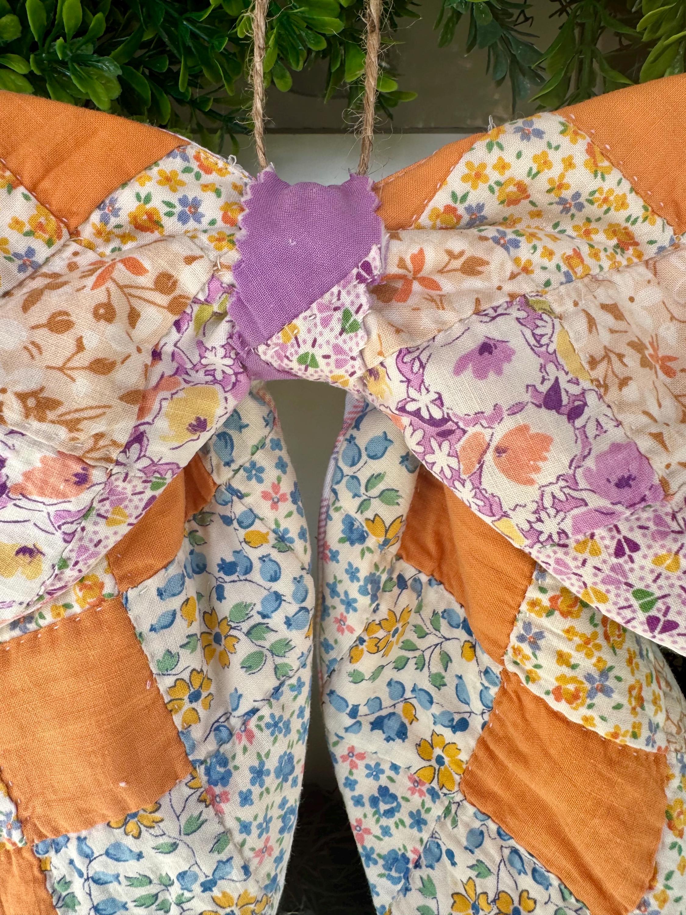 Vintage quilt hanging wreath bow is so charming in fresh pastel patchwork fall colors- so pretty and welcoming for fall, Thanksgiving or any time. I’ve lined the reverse in a matching and charming plaid cotton which adds to its design and charm. This door wreath bow sash is perfect for for anytime front door decor and is lovely for any farmhouse, cottage, shabby chic or fall/Thanksgiving styles and home decors - not everything has to be just harvest orange!!!. It comes with a matching beige jute removable hanger for peg rack hanging so you can hang it anywhere or you can affix to your wreath (not included) with the jute string or your wreath wire for door hanging. The material is SO pretty- but as it is antique/vintage it is not weather proof so it’s recommended for indoor use or behind a storm door as an outdoor sash or bow! This vintage bow wreath scarf is in fresh orange, white, blue and purple and you can change the many I make for your mood or the season. lovely for you- or gift one for a housewarming, realtor, wedding shower, birthday or any other gift! The bow is approximately 11” across and the tails are 12”. if you love me- check out my matching bow bag charm at
