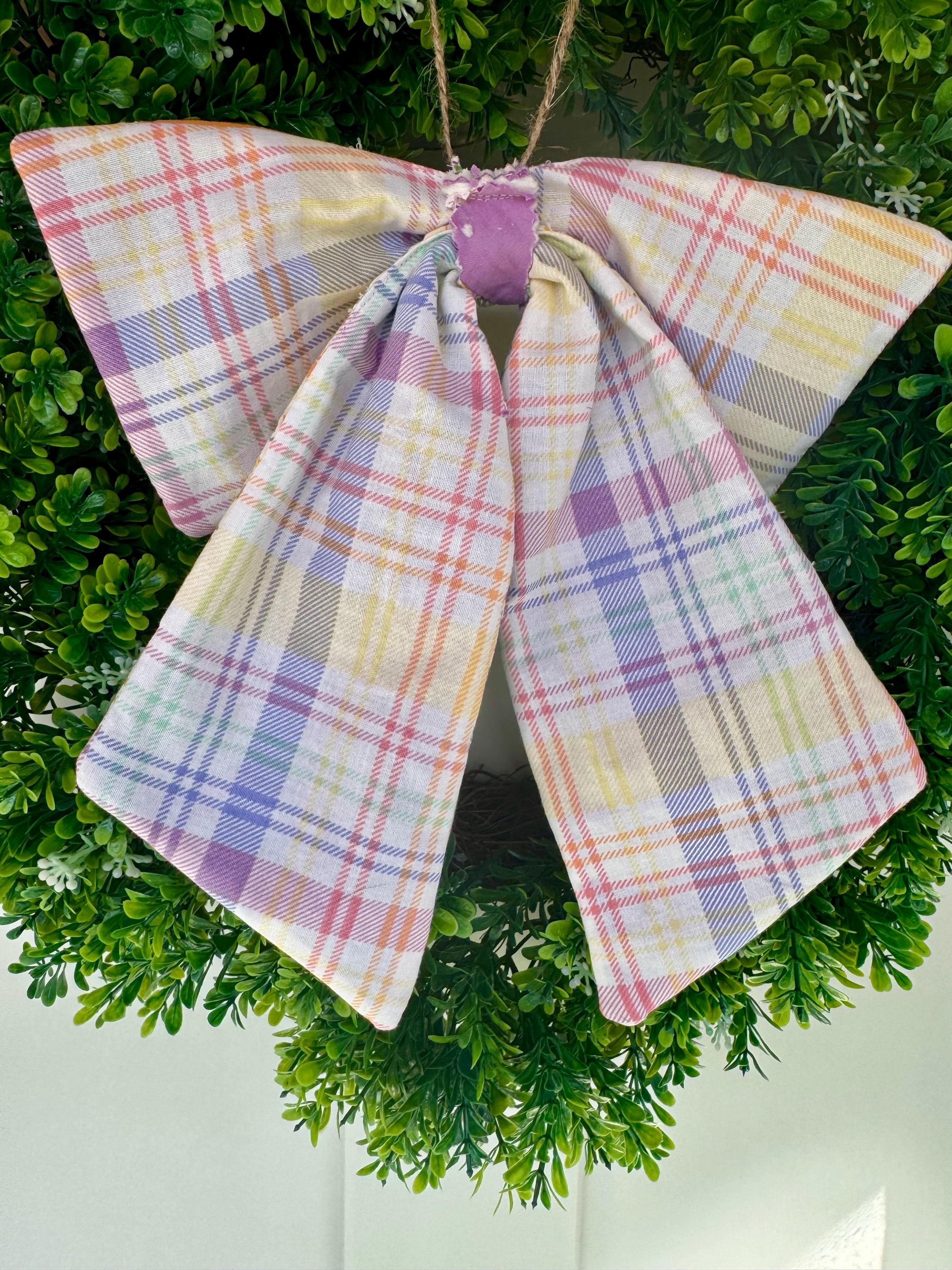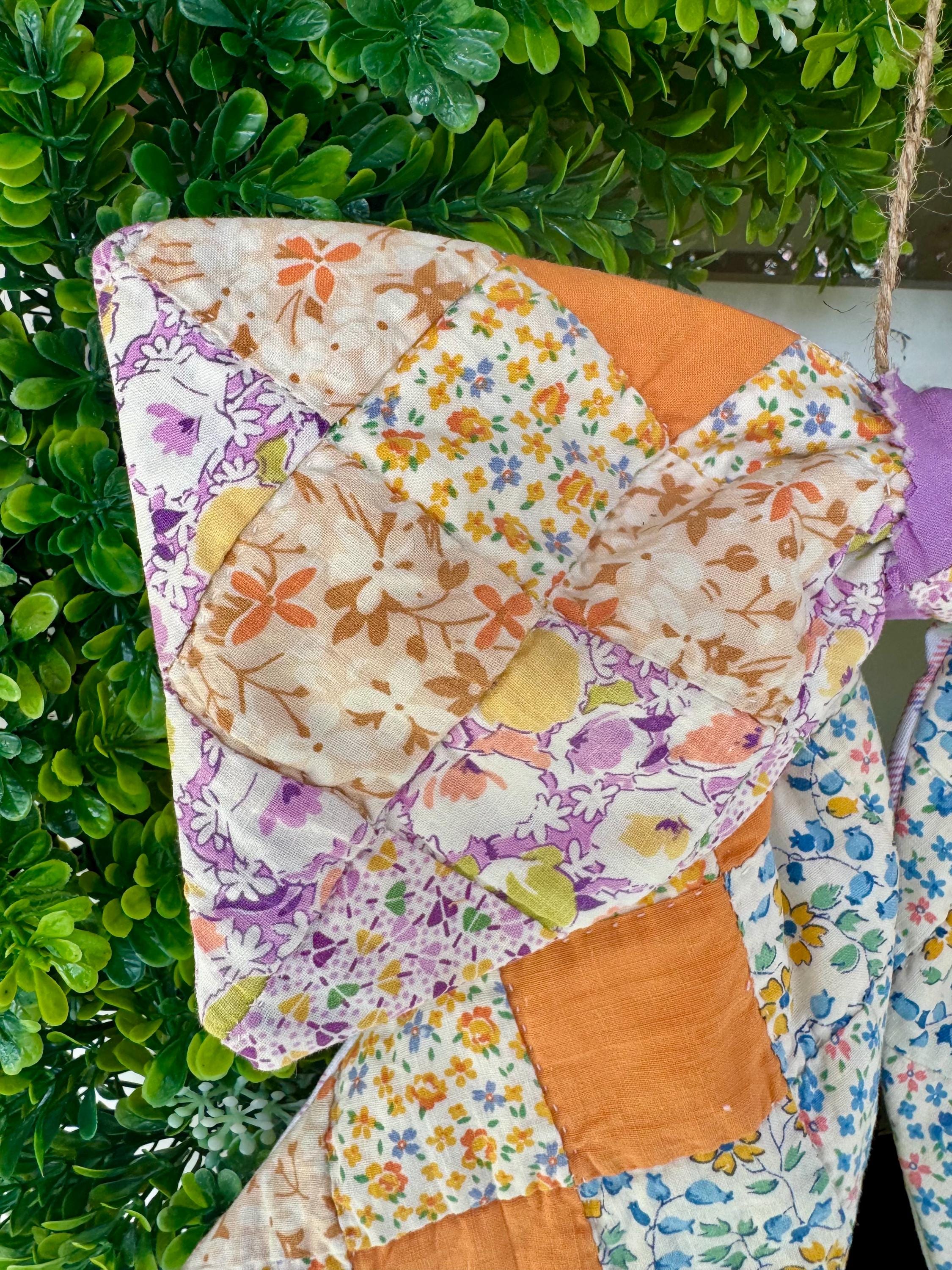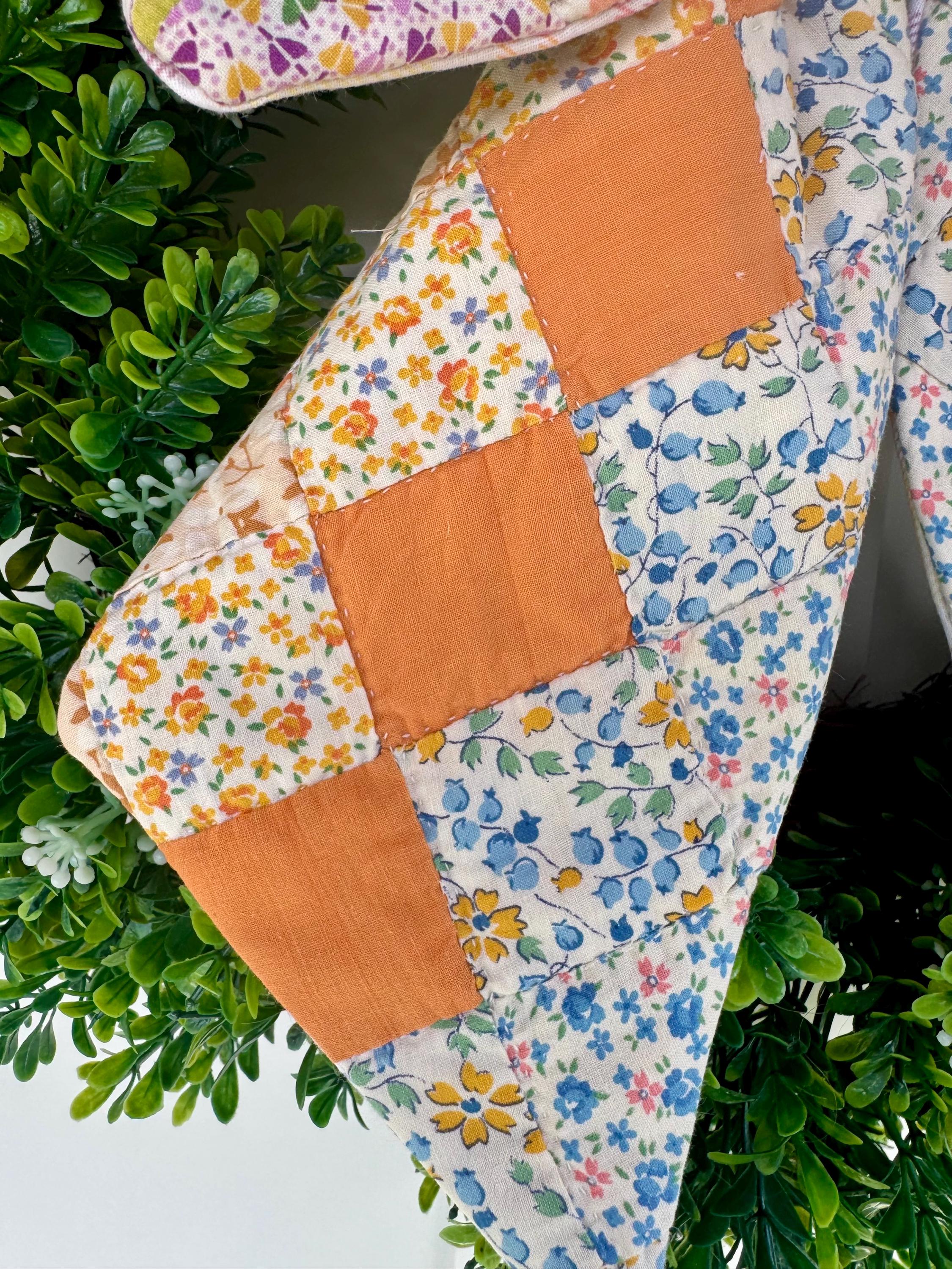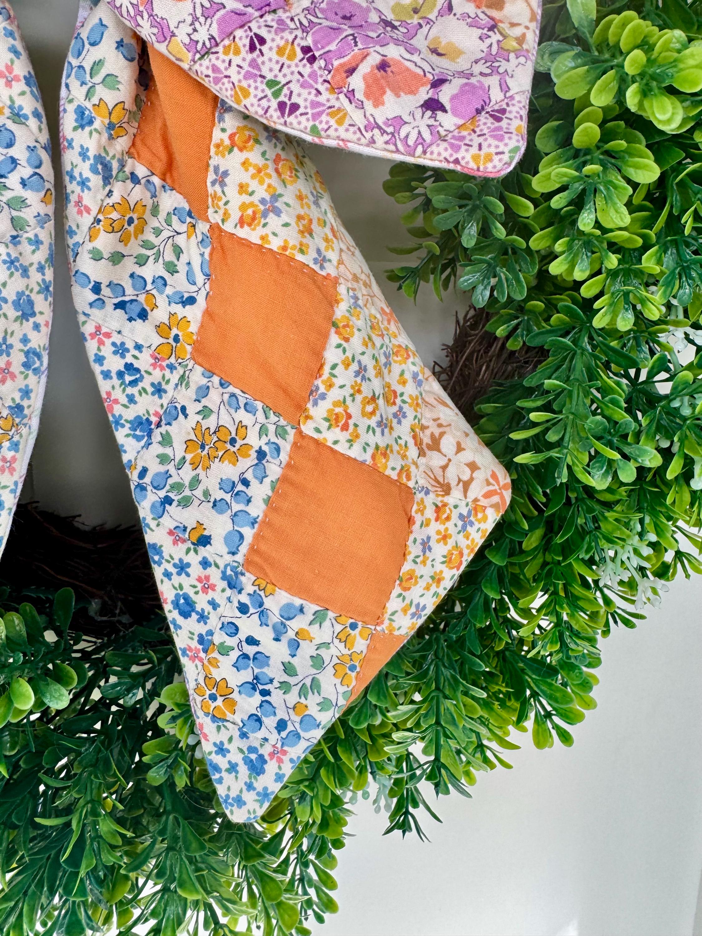 Vintage quilt hanging wreath bow is so charming in fresh pastel patchwork fall colors- so pretty and welcoming for fall, Thanksgiving or any time. I’ve lined the reverse in a matching and charming plaid cotton which adds to its design and charm. This door wreath bow sash is perfect for for anytime front door decor and is lovely for any farmhouse, cottage, shabby chic or fall/Thanksgiving styles and home decors - not everything has to be just harvest orange!!!. It comes with a matching beige jute removable hanger for peg rack hanging so you can hang it anywhere or you can affix to your wreath (not included) with the jute string or your wreath wire for door hanging. The material is SO pretty- but as it is antique/vintage it is not weather proof so it’s recommended for indoor use or behind a storm door as an outdoor sash or bow! This vintage bow wreath scarf is in fresh orange, white, blue and purple and you can change the many I make for your mood or the season. lovely for you- or gift one for a housewarming, realtor, wedding shower, birthday or any other gift! The bow is approximately 11” across and the tails are 12”. if you love me- check out my matching bow bag charm at