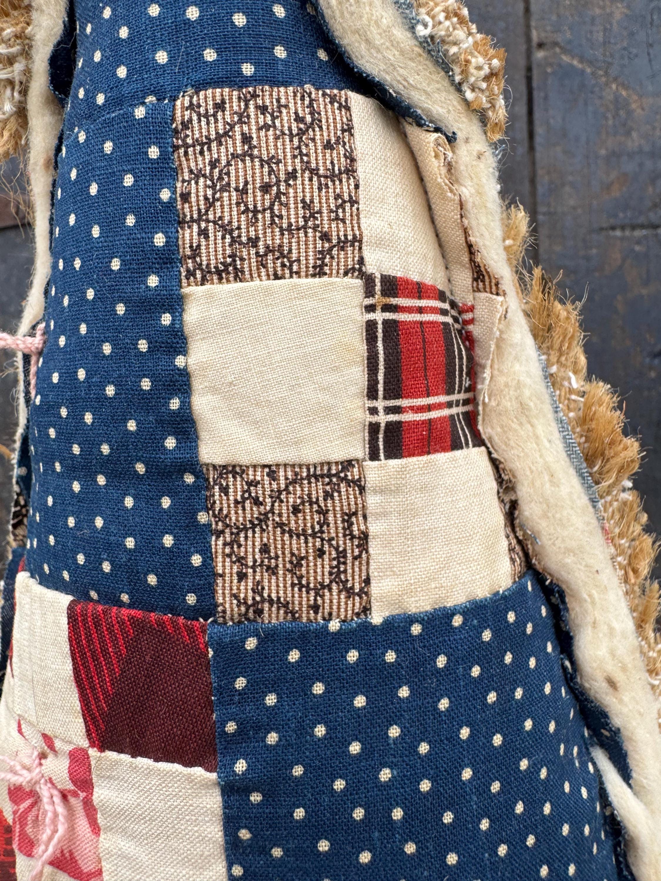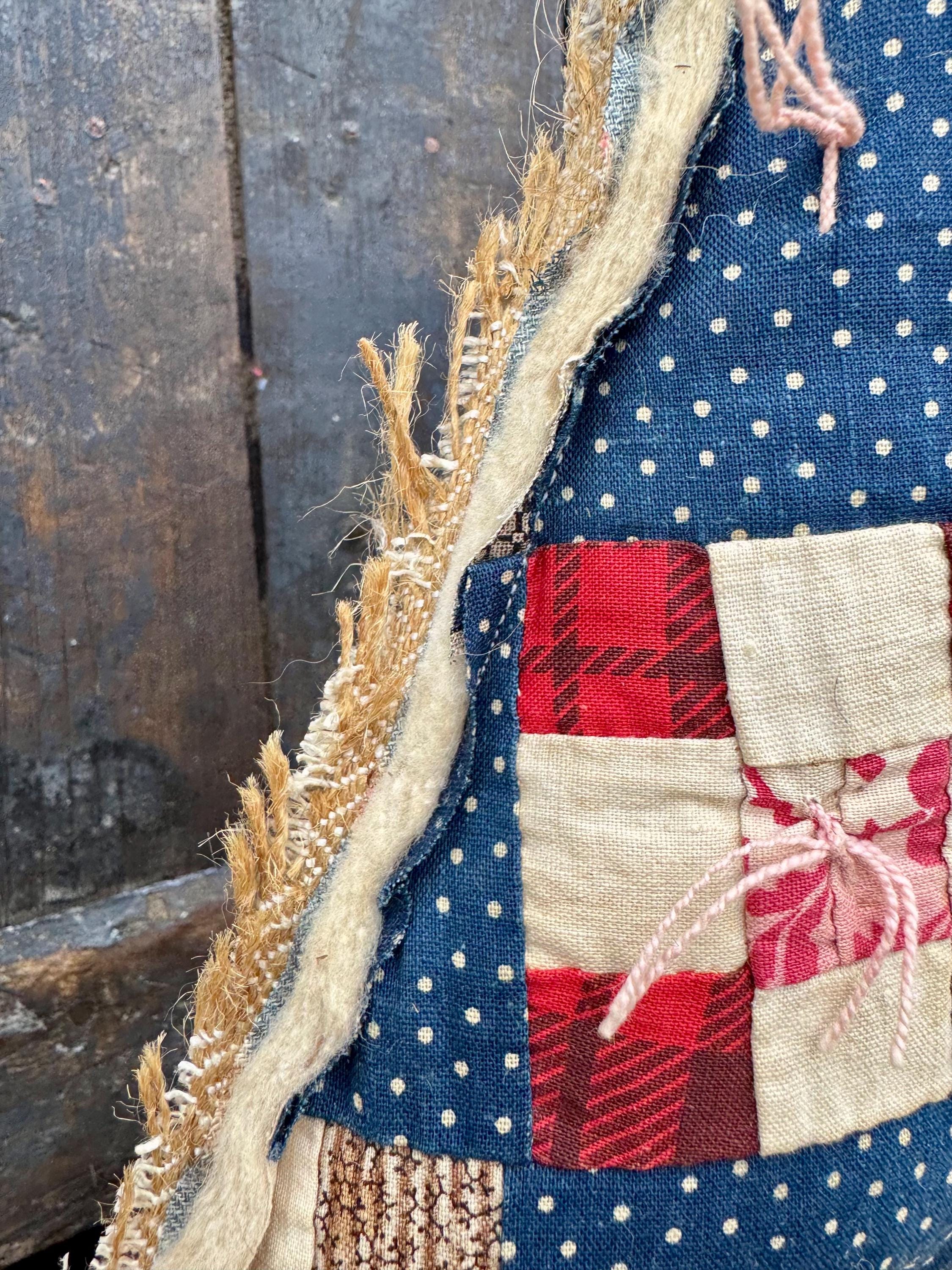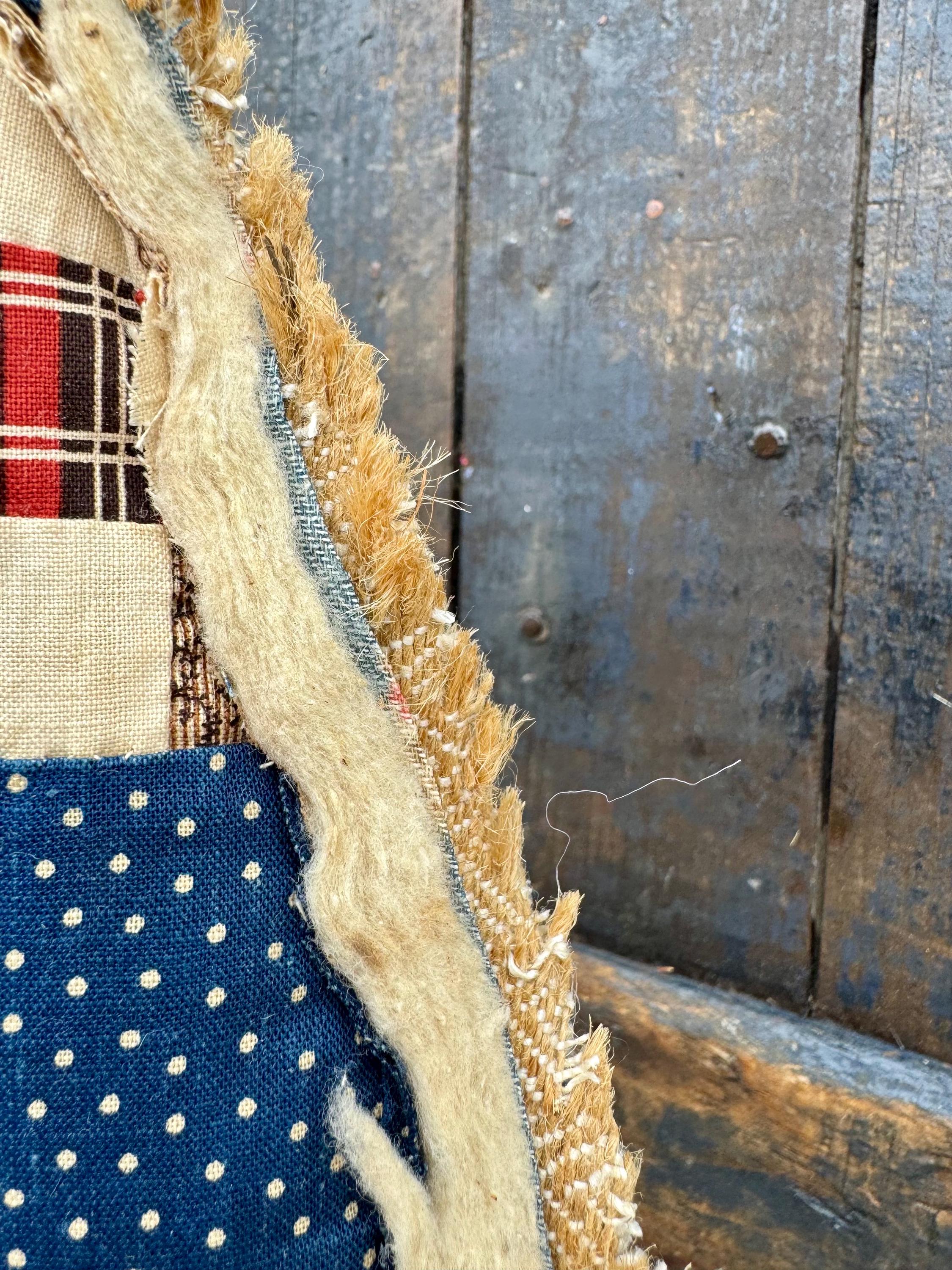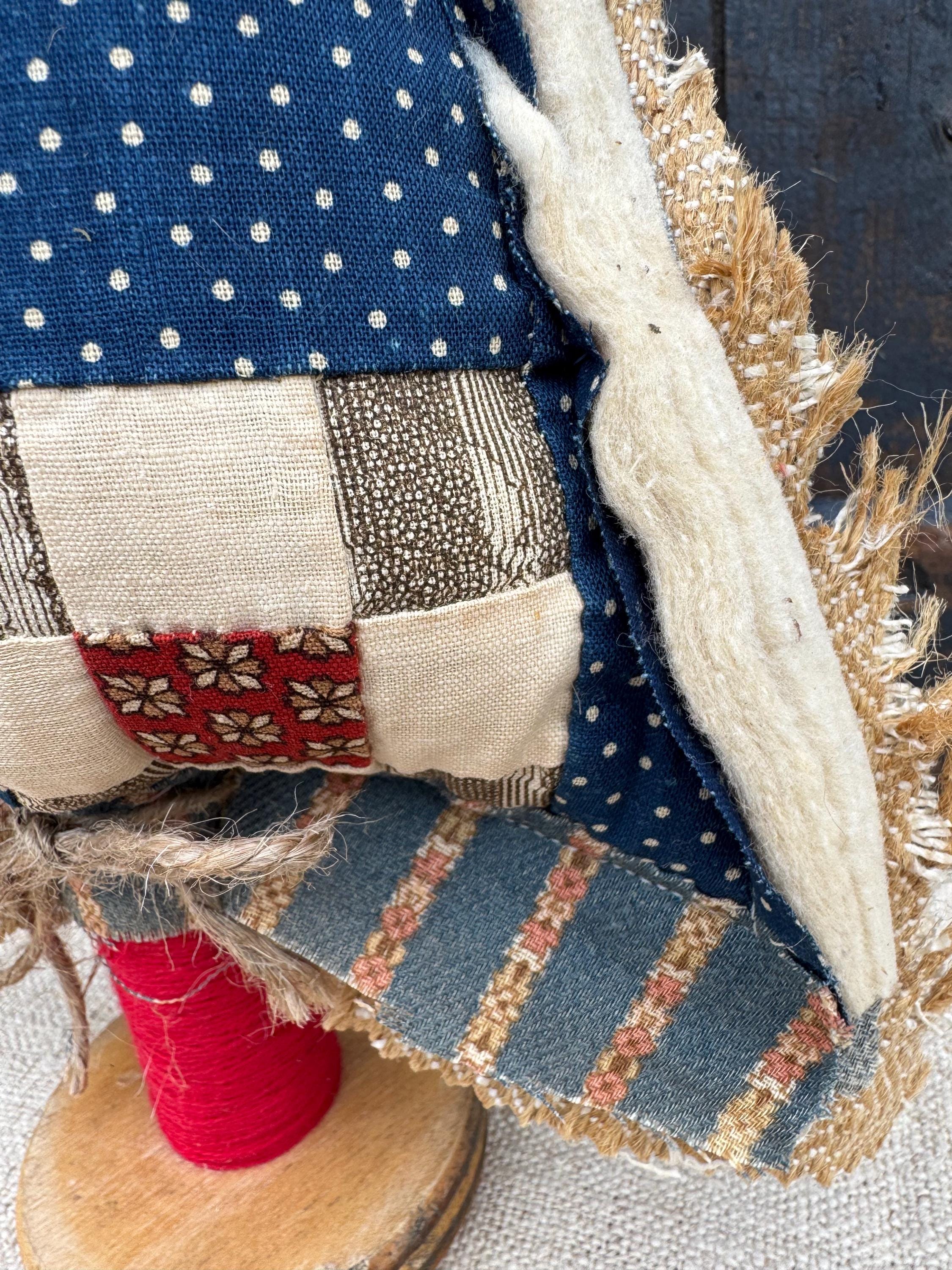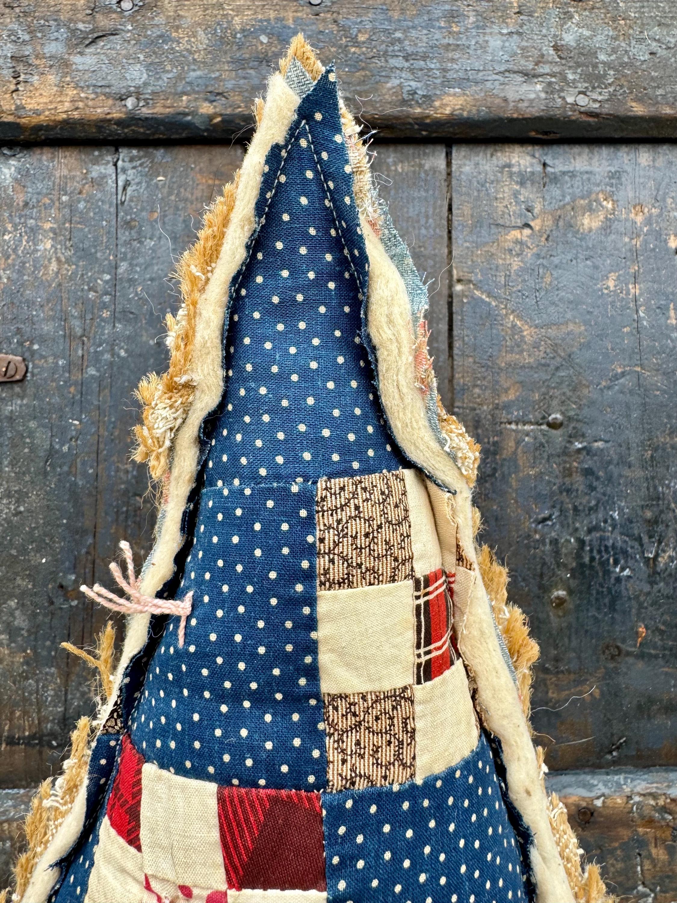 What can I say about this rare 19th century quilt I found at a nearby barn Sale here in Massachusetts? It’s just stunning- the quilt is hand tied, the batting is hand carded sheep’s wool (see photo), the squares are tiny and the indigo is just lovely- it was an expensive color (along with red) to make years ago and it still retains its color. I added a contrasting antique grain sack for the back and placed it atop a vintage textile spool which still has its original red thread. Adding only antique textiles adds to the cost, charm and design of this one of a kind tree. The bottom of the tree is the original quilt edging- a lovely green and blue wool.