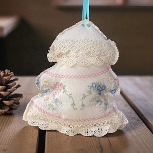 Approximately 13” tall and 9” wide. As with any antique fabrics, there may be wearing, tea staining and distressed areas which adds to its charm. Returns are not accepted for unique items such as this one. Not a toy. Spot clean only