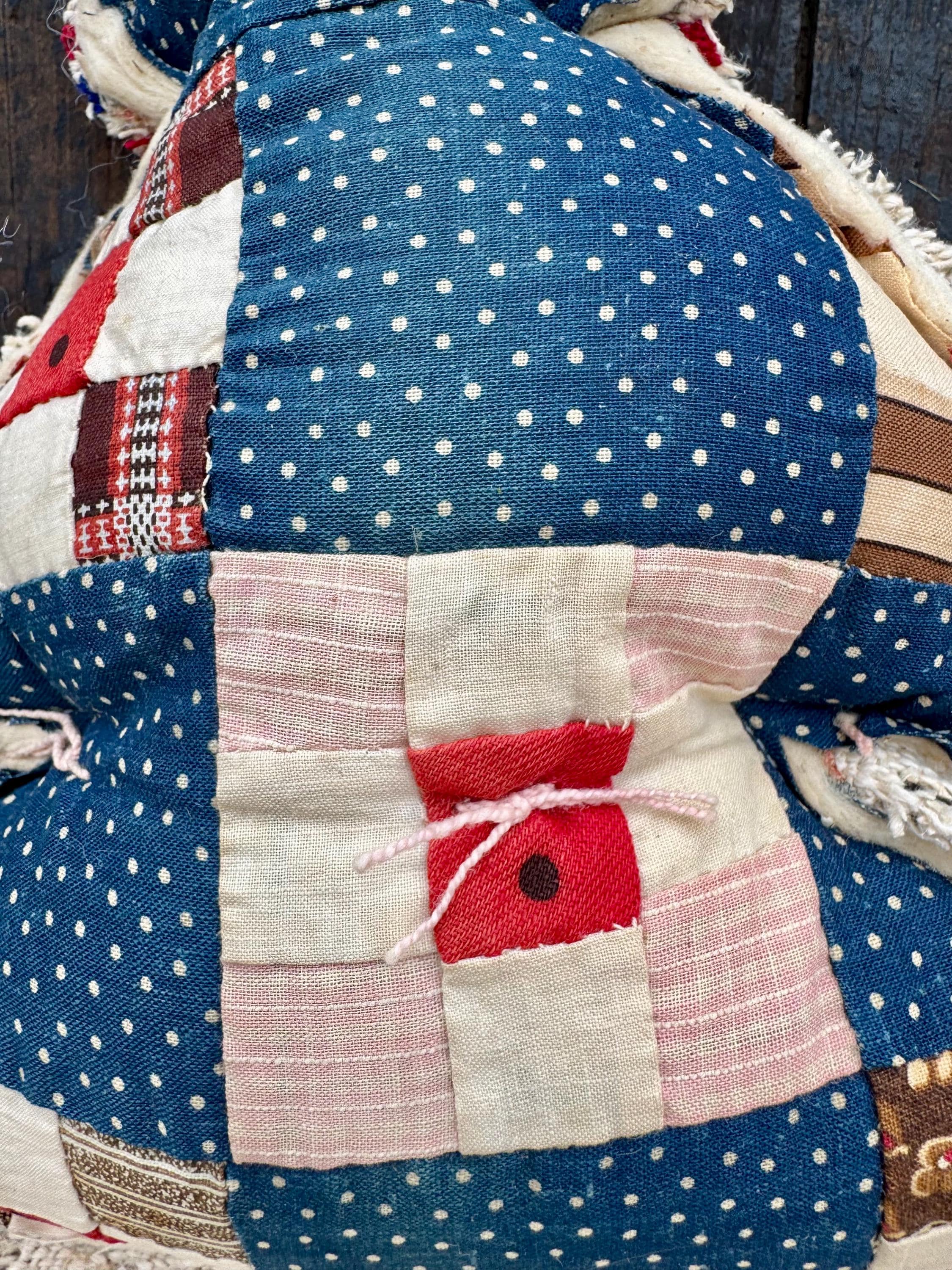What can I say about this rare 19th century quilt I found at a nearby barn Sale here in Massachusetts? It’s just stunning- the quilt is hand tied, the batting is hand carded sheep’s wool (see photo), the squares are tiny and the indigo is just lovely- it was an expensive color (along with red) to make years ago and it still retains its color. I added a red and blue striped antique grain sack for the back. Adding only antique textiles adds to the cost, charm and design of this one of a kind tree.