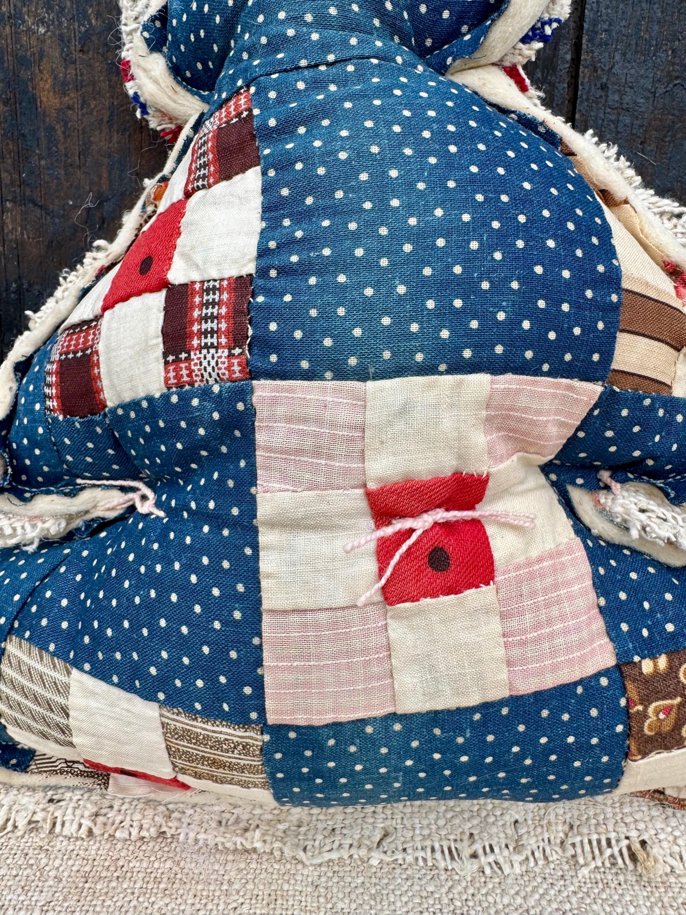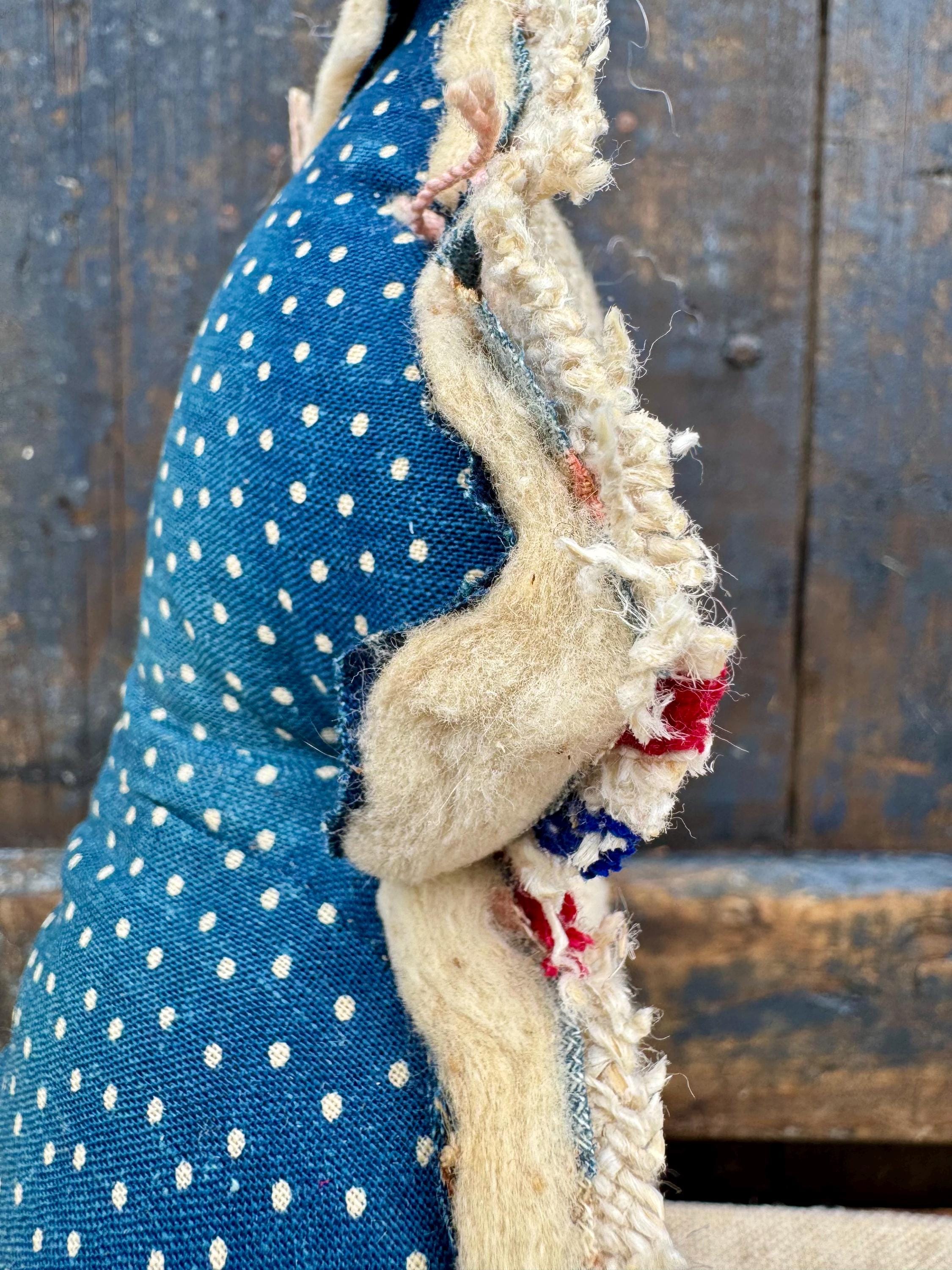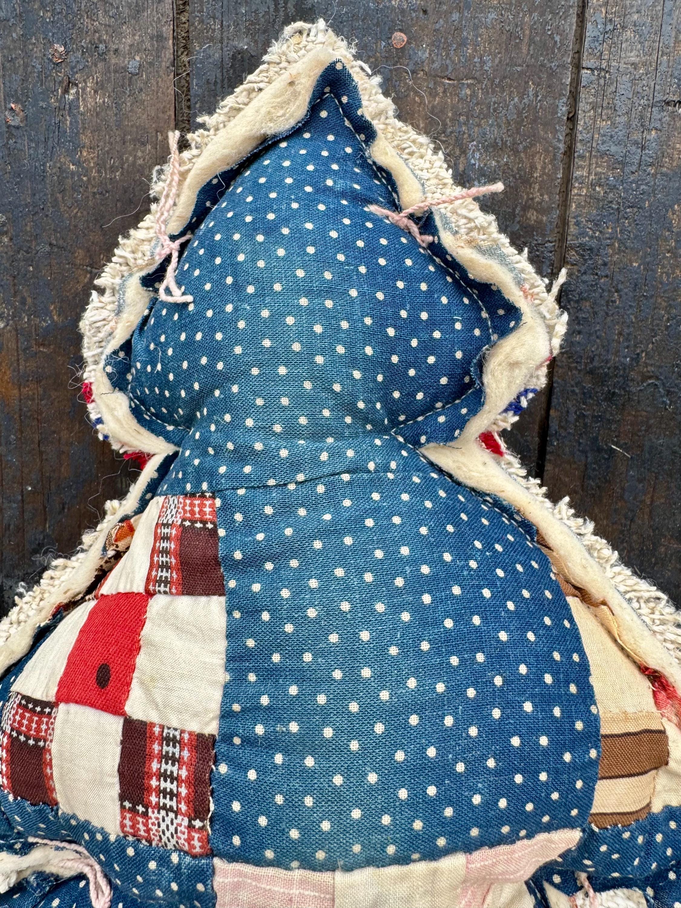 Approximately 12” tall and 10” wide. As with any antique fabrics, there may be wearing, tea staining and distressed areas which adds to its charm. Returns are not accepted for unique items such as this one. Not a toy. Spot clean only