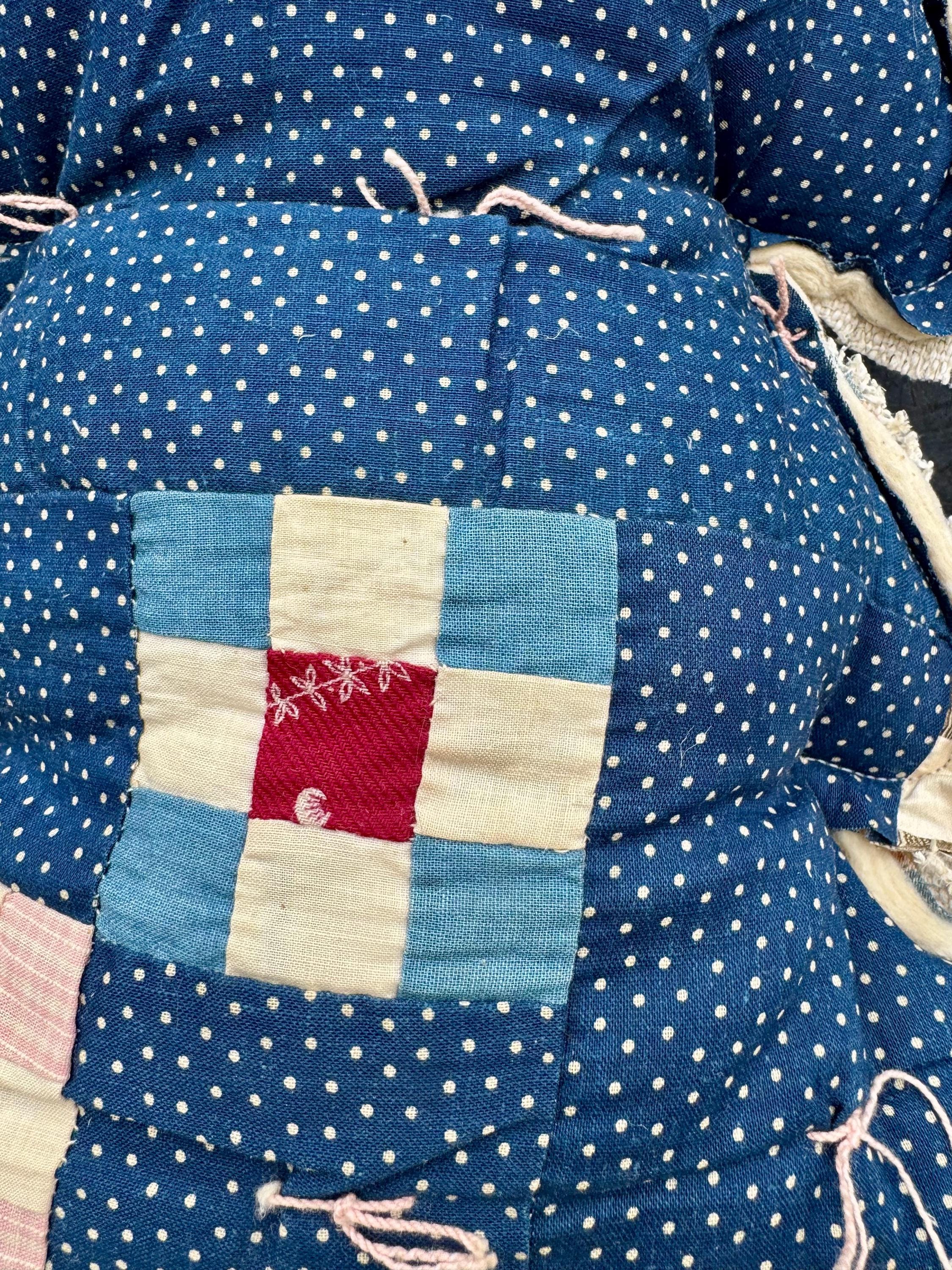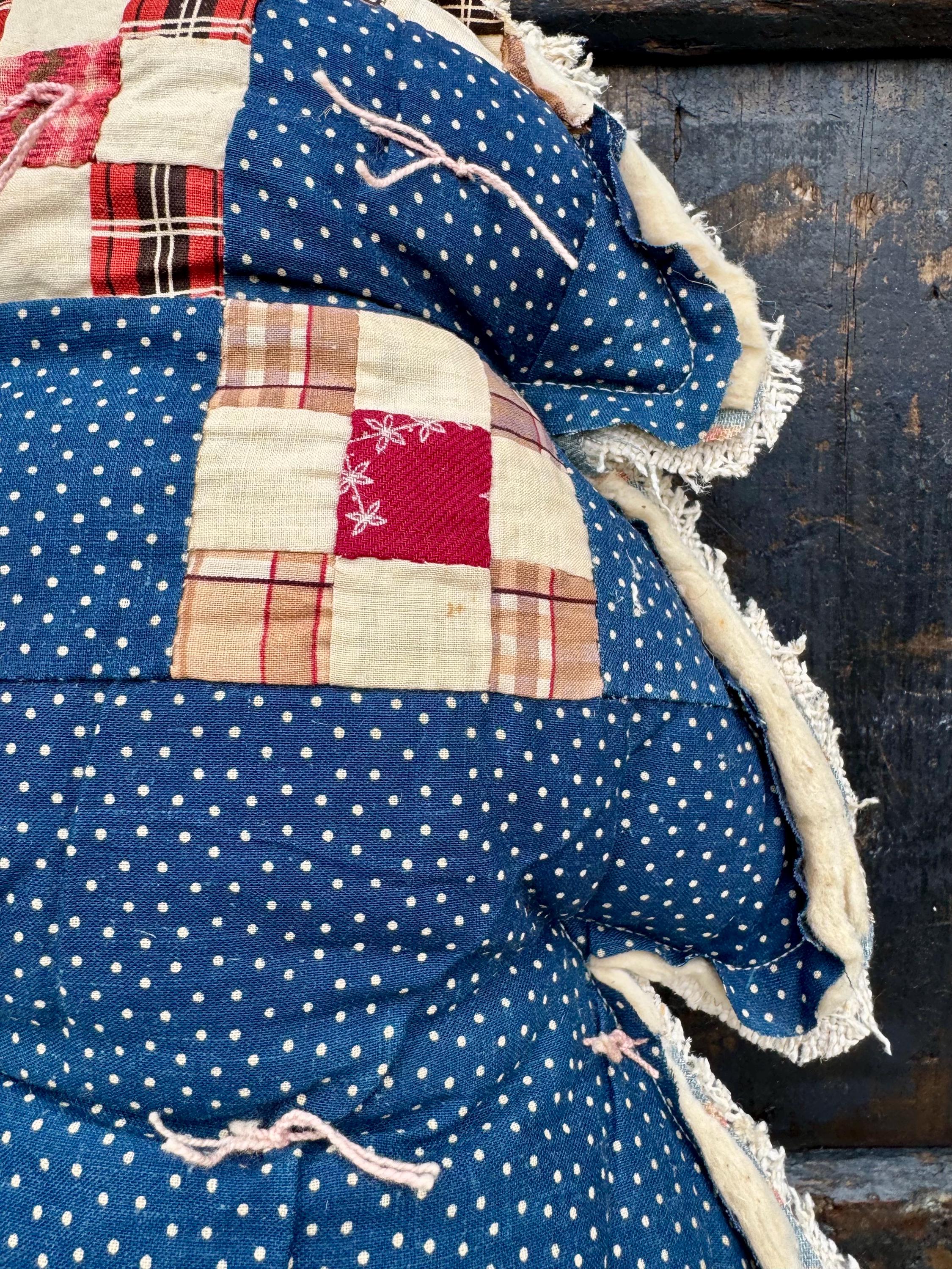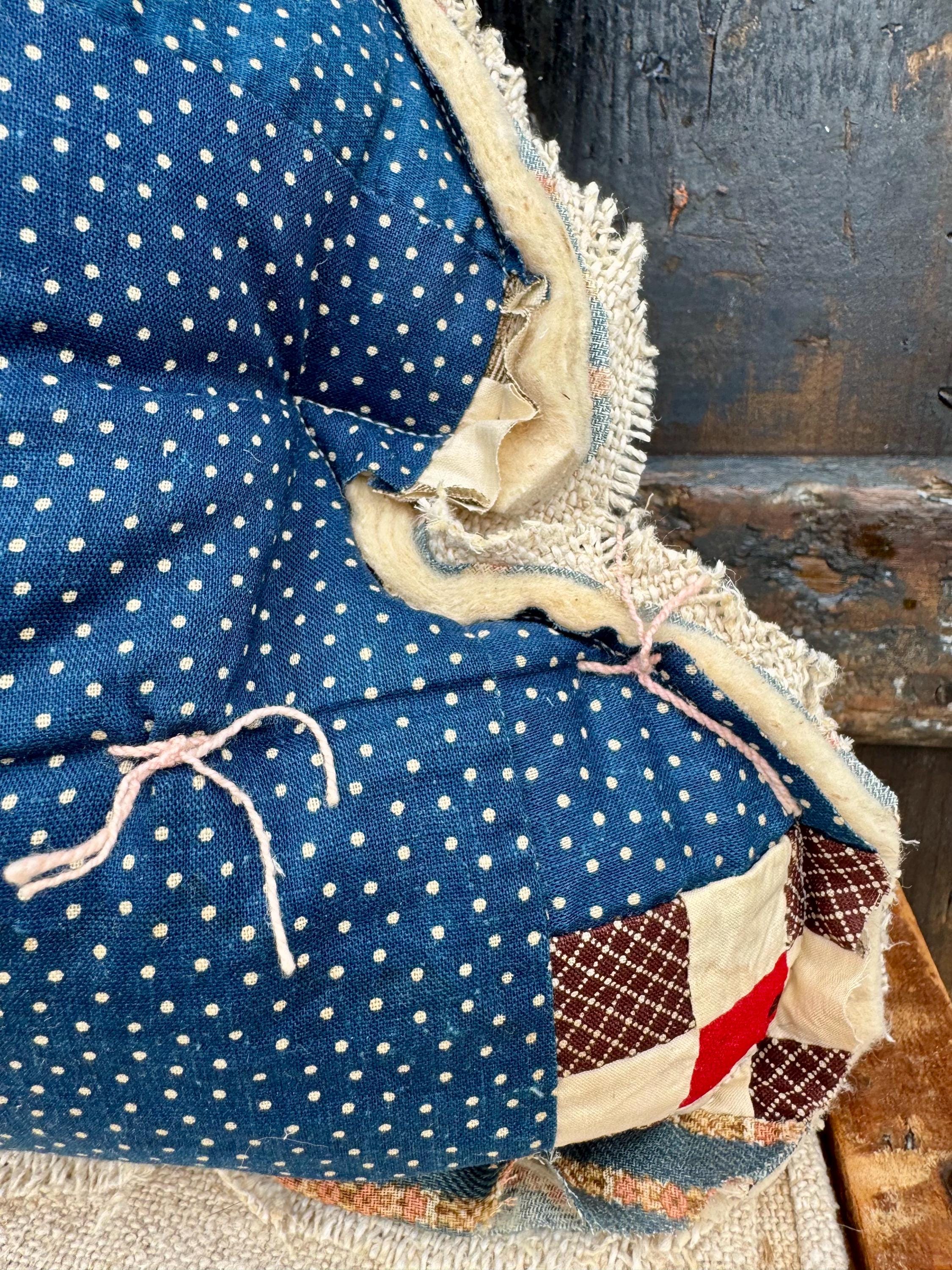 What can I say about this rare 19th century quilt I found at a nearby barn Sale here in Massachusetts? It’s just stunning- the quilt is hand tied, the batting is hand carded sheep’s wool (see photo), the squares are tiny and the indigo is just lovely- it was an expensive color (along with red) to make years ago and it still retains its color. I added a red and blue striped antique grain sack for the back. Adding only antique textiles adds to the cost, charm and design of this one of a kind tree.