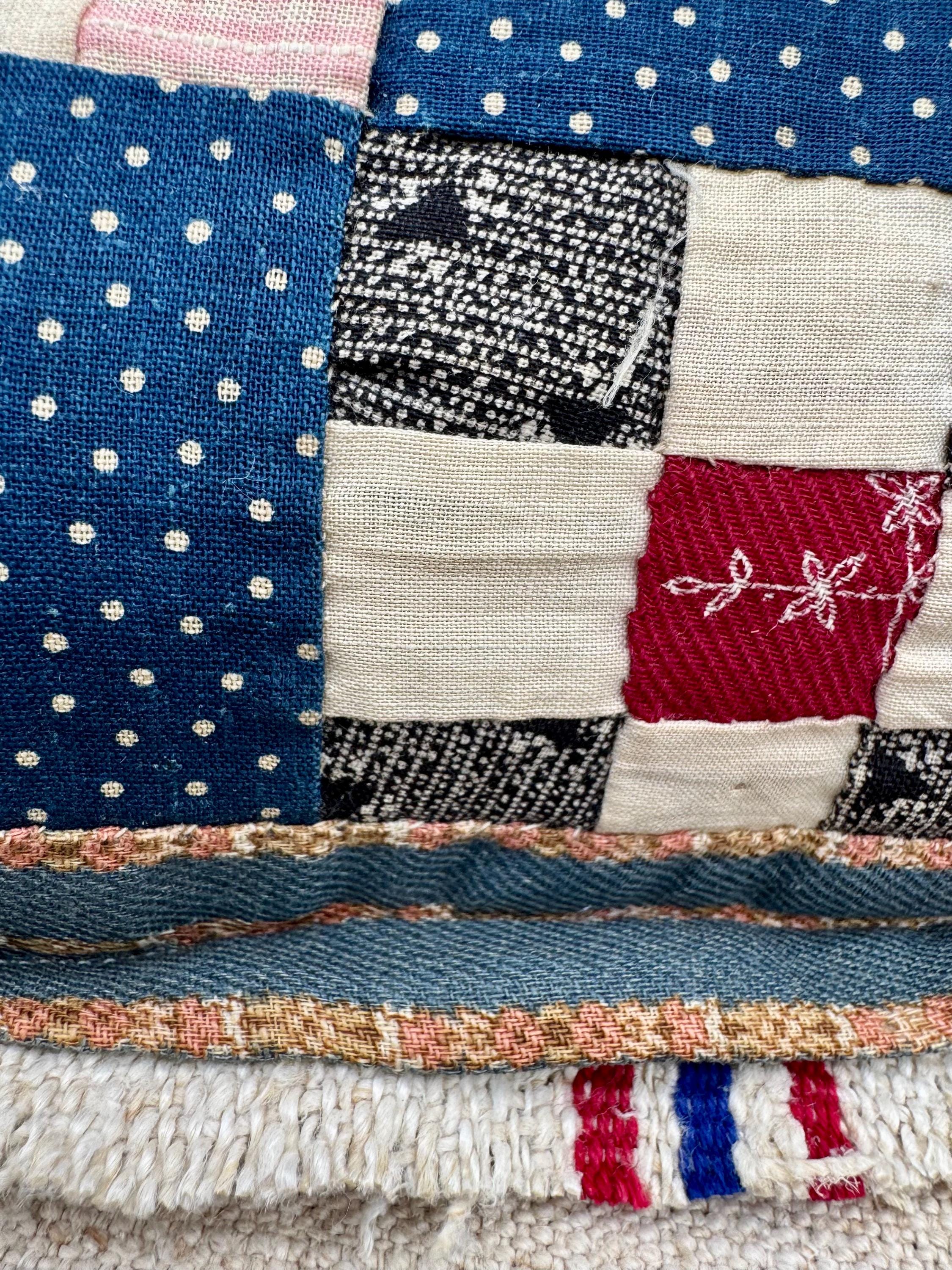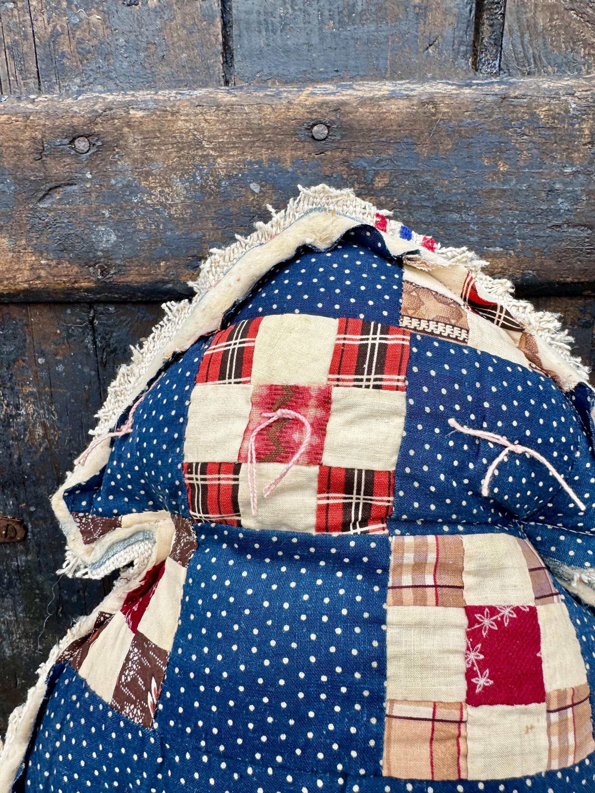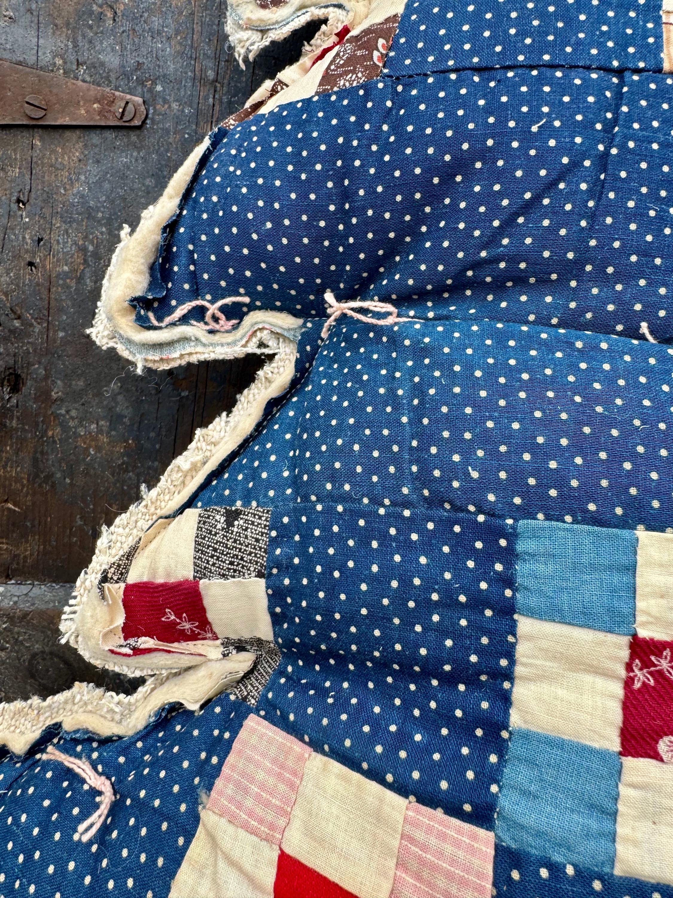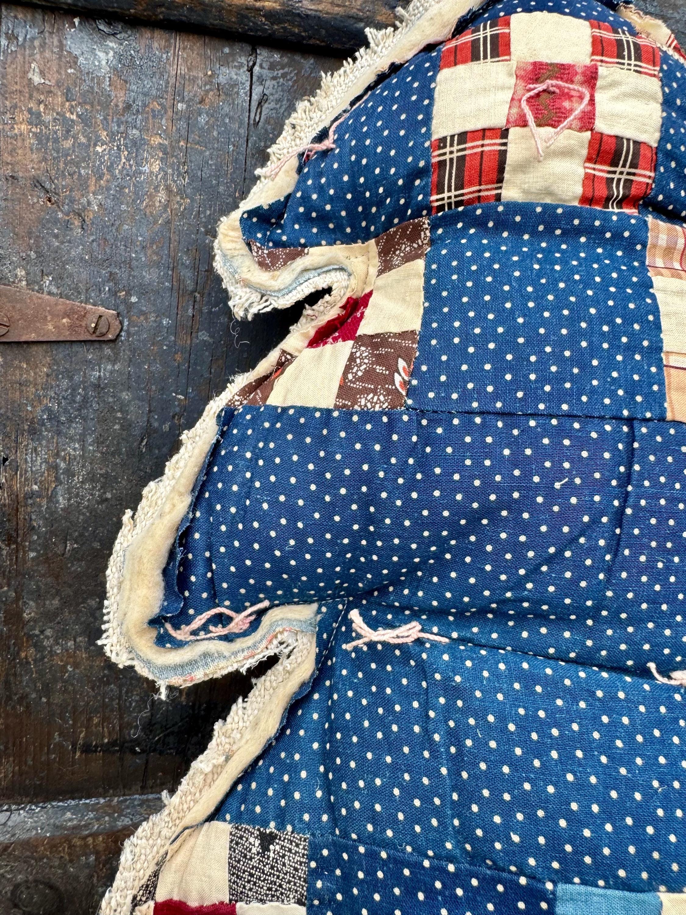 What can I say about this rare 19th century quilt I found at a nearby barn Sale here in Massachusetts? It’s just stunning- the quilt is hand tied, the batting is hand carded sheep’s wool (see photo), the squares are tiny and the indigo is just lovely- it was an expensive color (along with red) to make years ago and it still retains its color. I added a red and blue striped antique grain sack for the back. Adding only antique textiles adds to the cost, charm and design of this one of a kind tree.