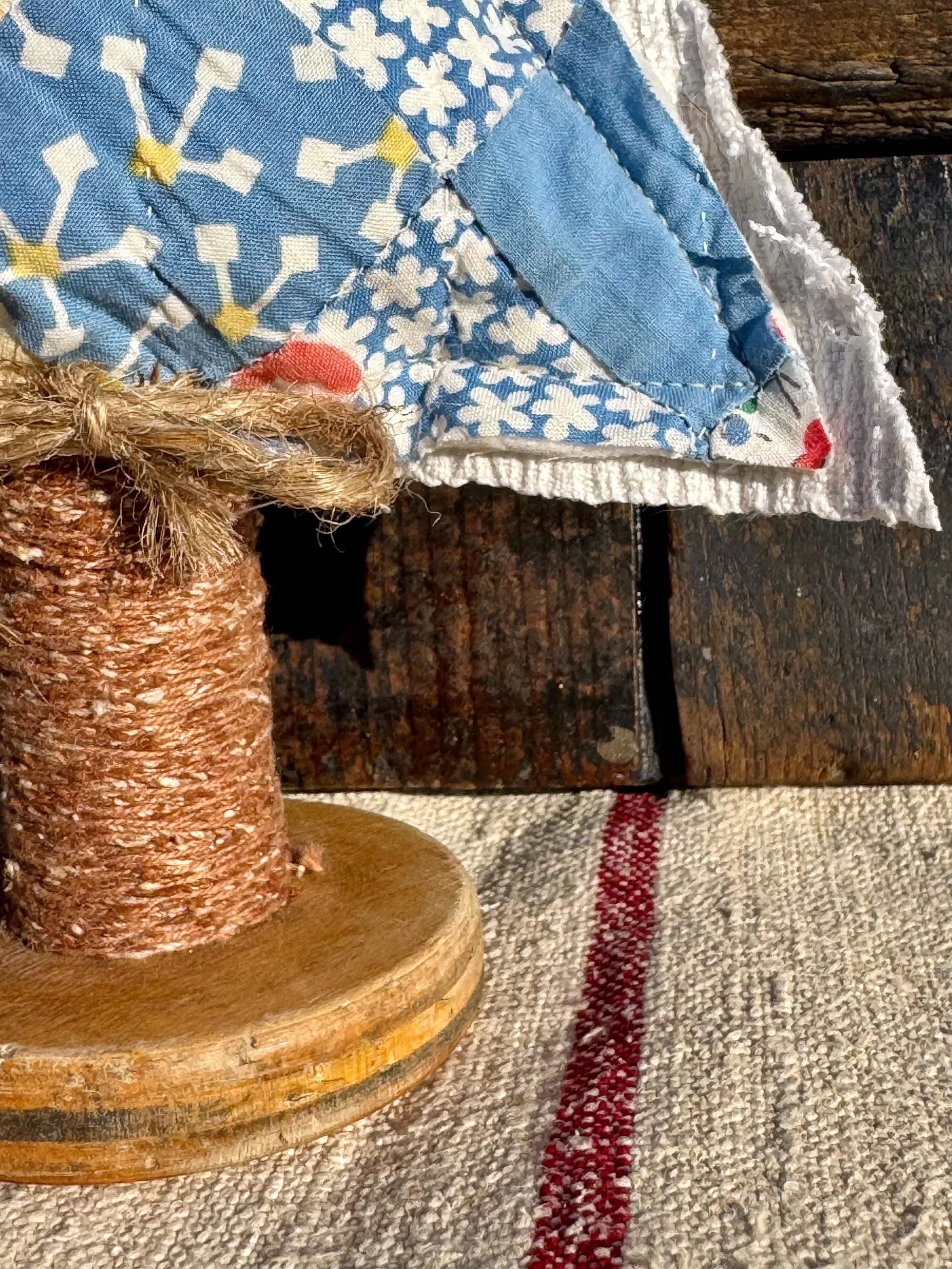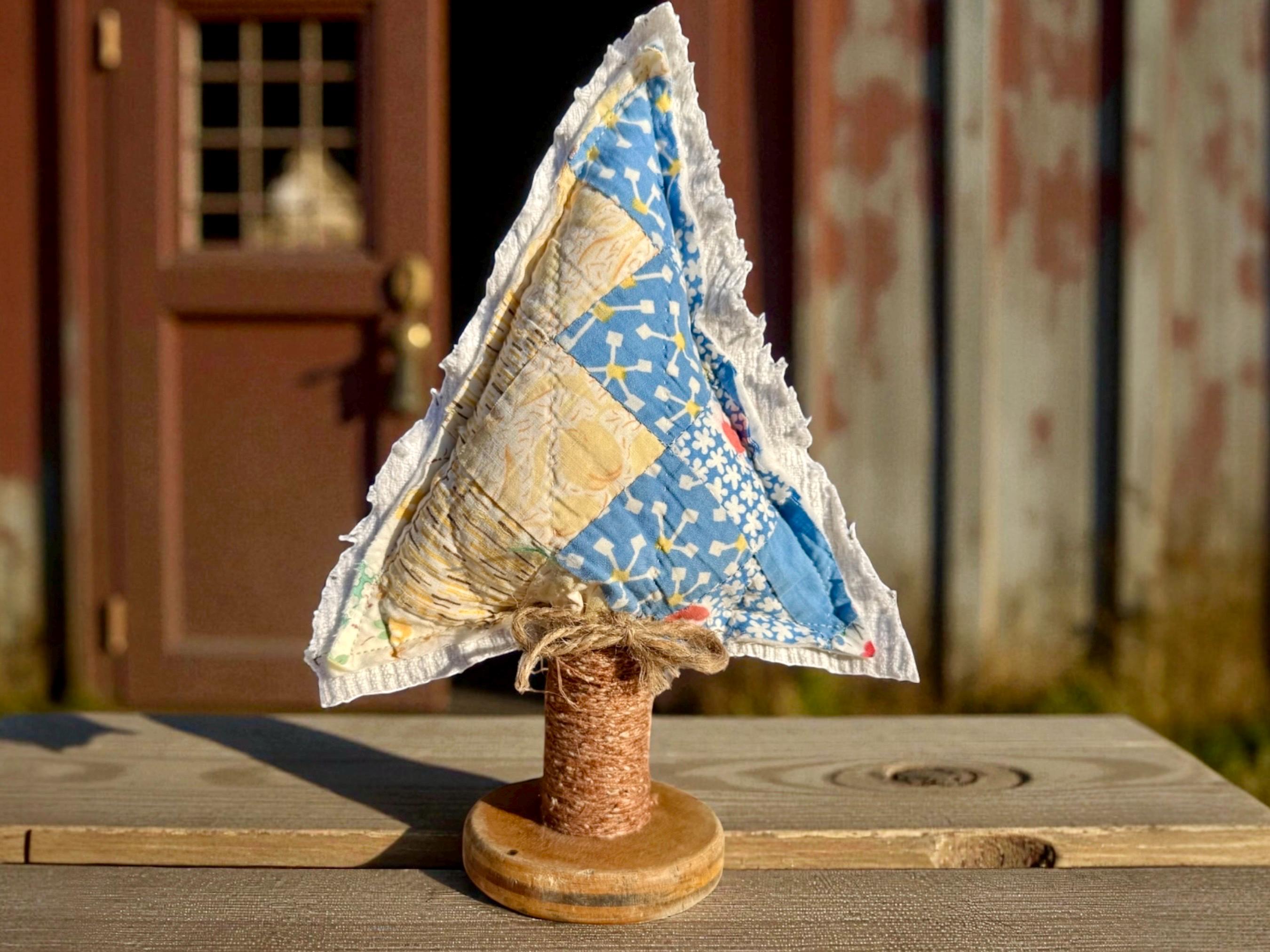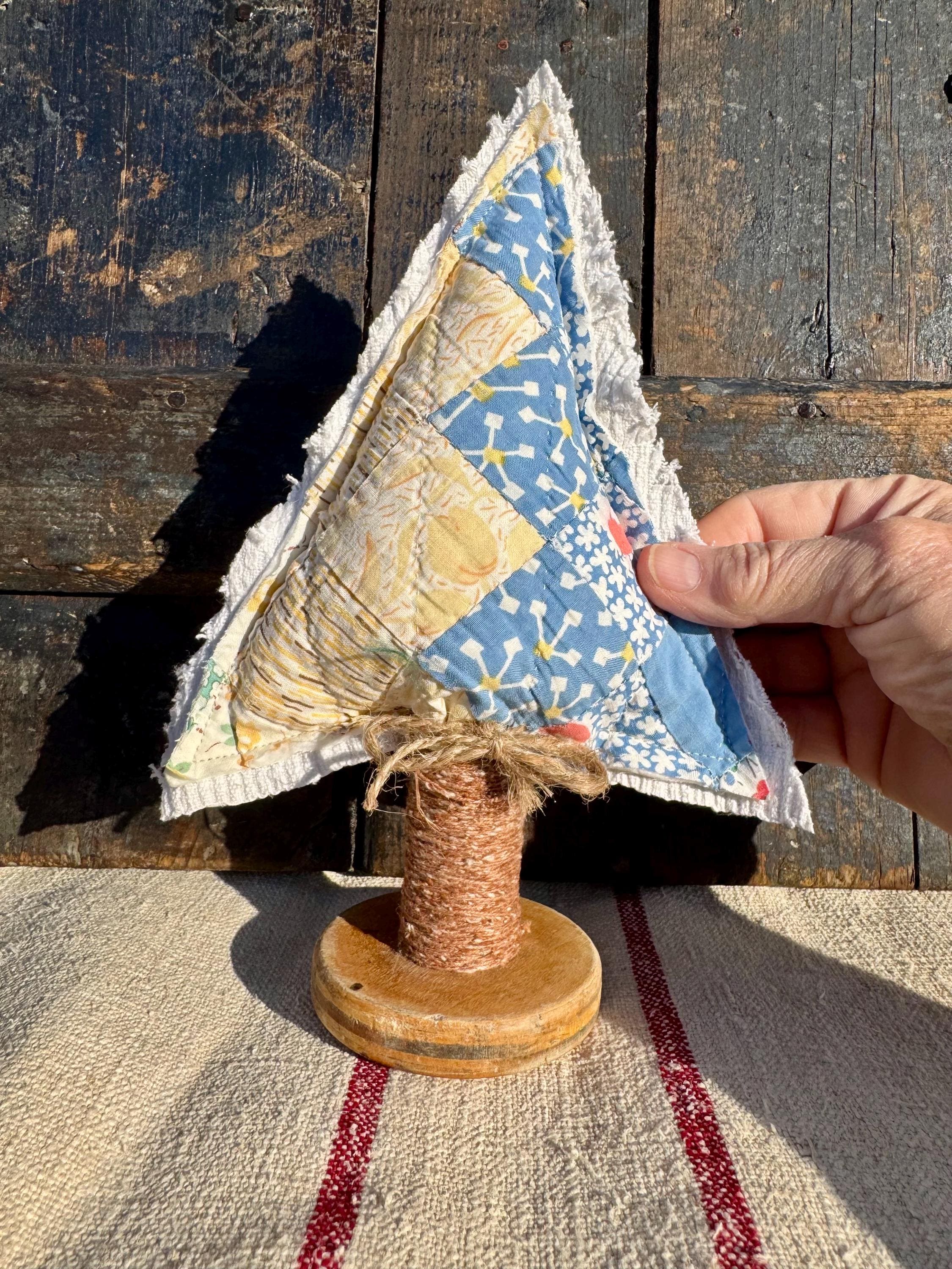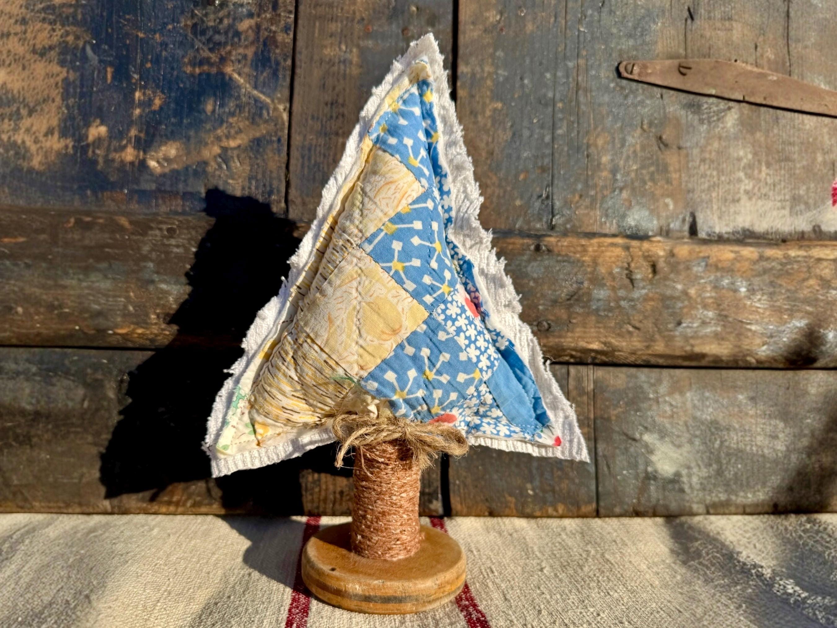 Tree - Antique Quilt Christmas Tree on Vintage Spool, Farmhouse cottage patchwork tree, grain sack on back! handmade Holiday Decor, 10”