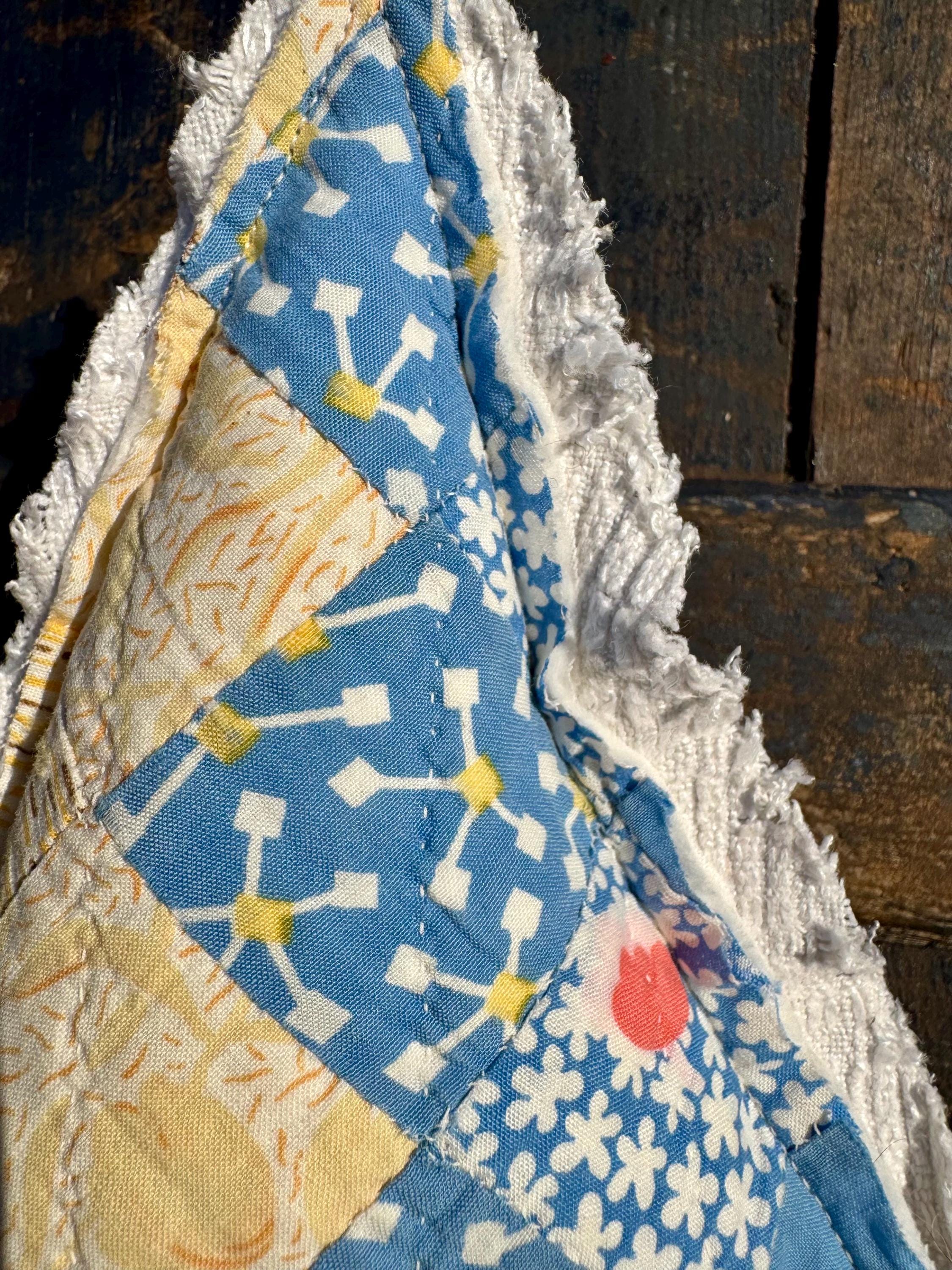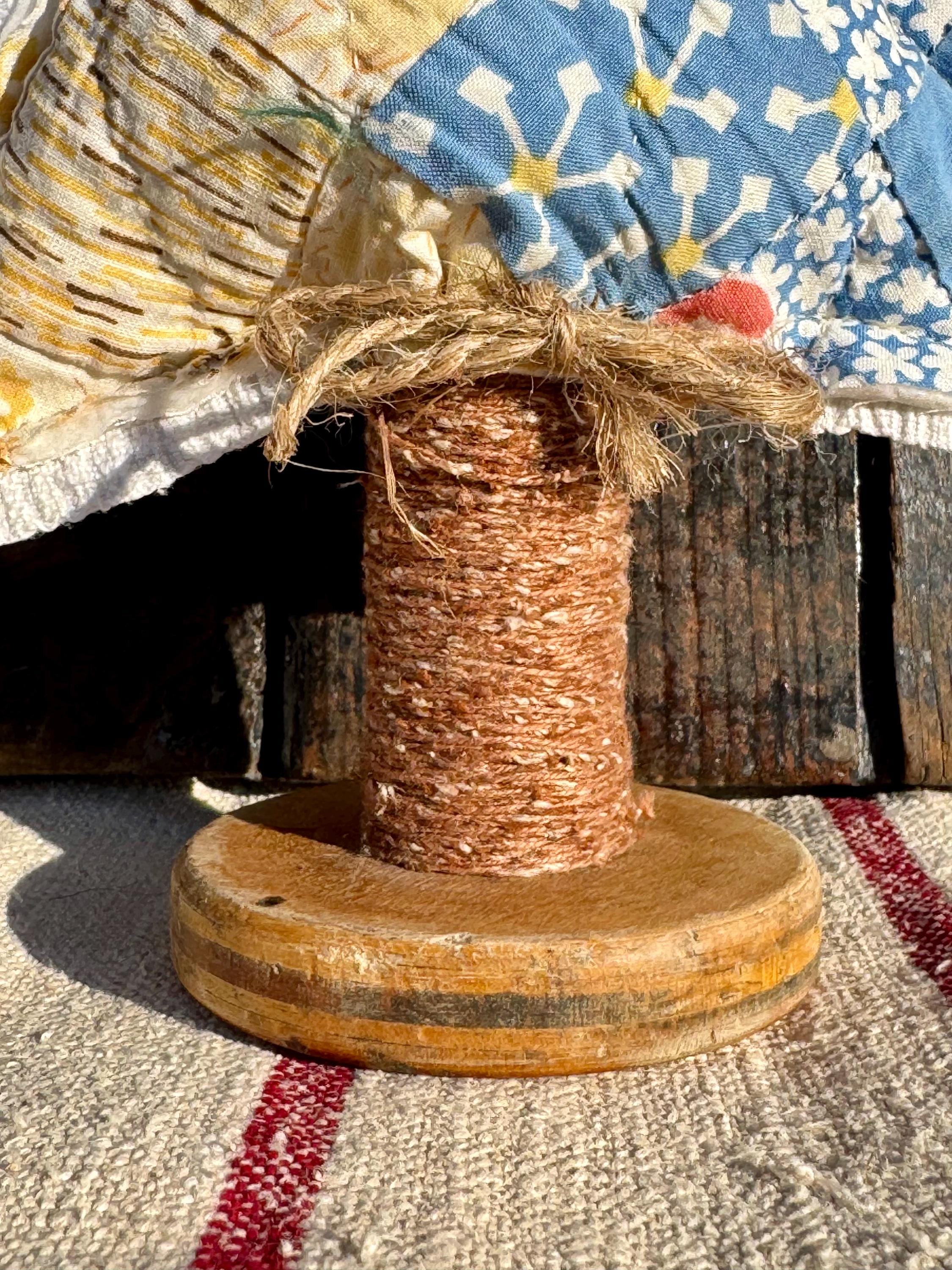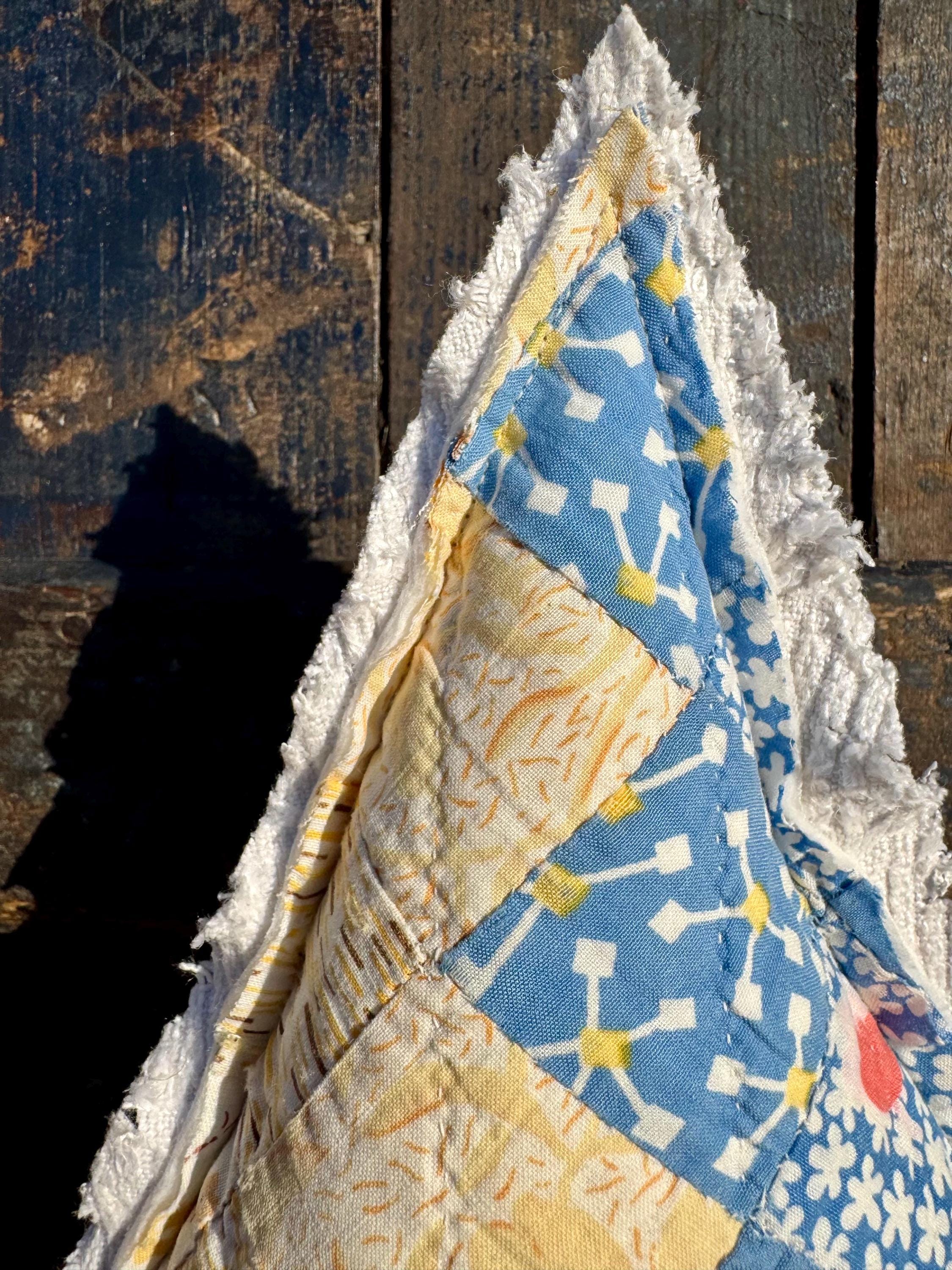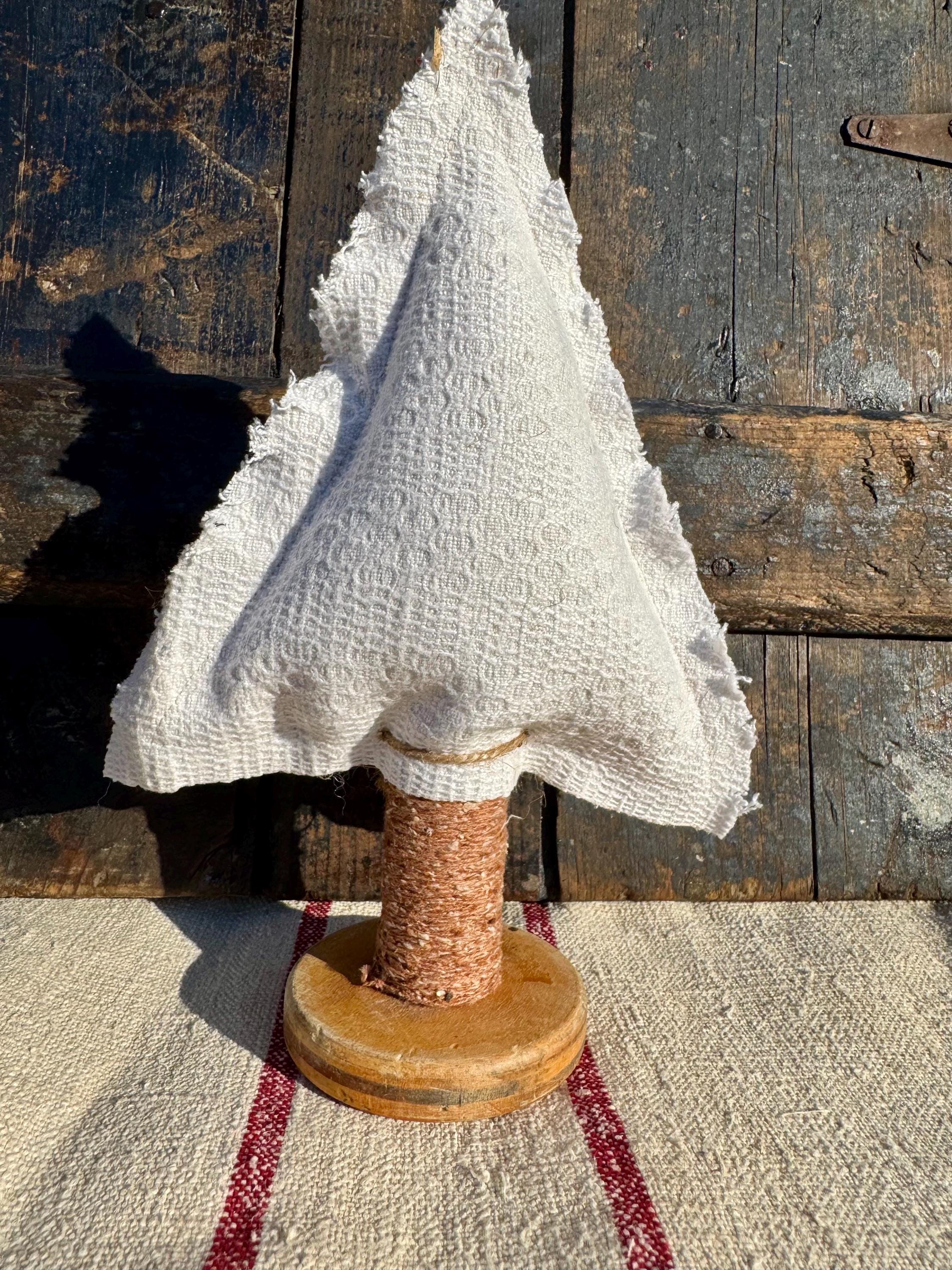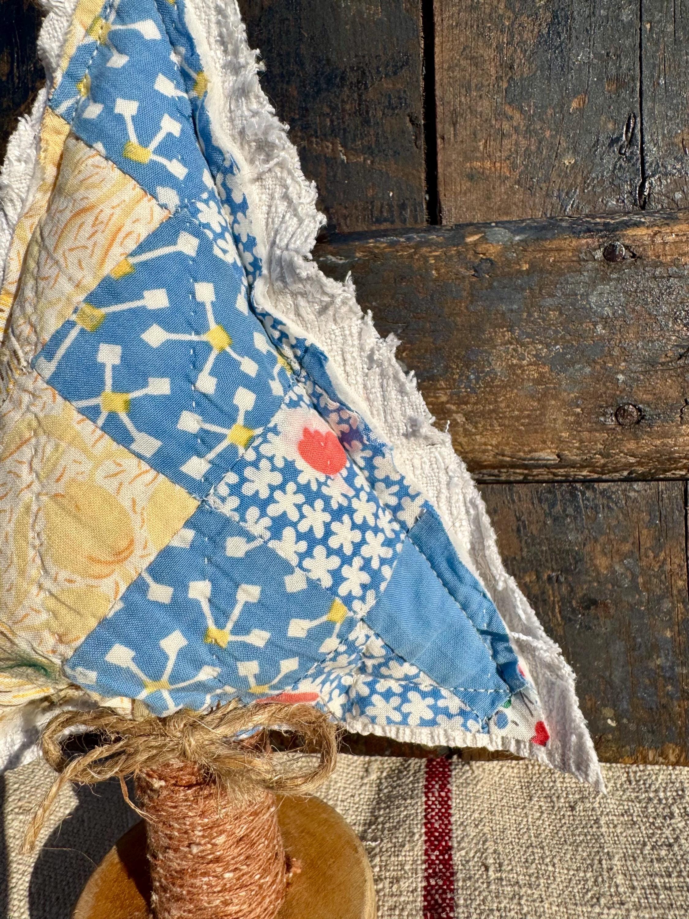 Tree - Antique Quilt Christmas Tree on Vintage Spool, Farmhouse cottage patchwork tree, grain sack on back! handmade Holiday Decor, 10”