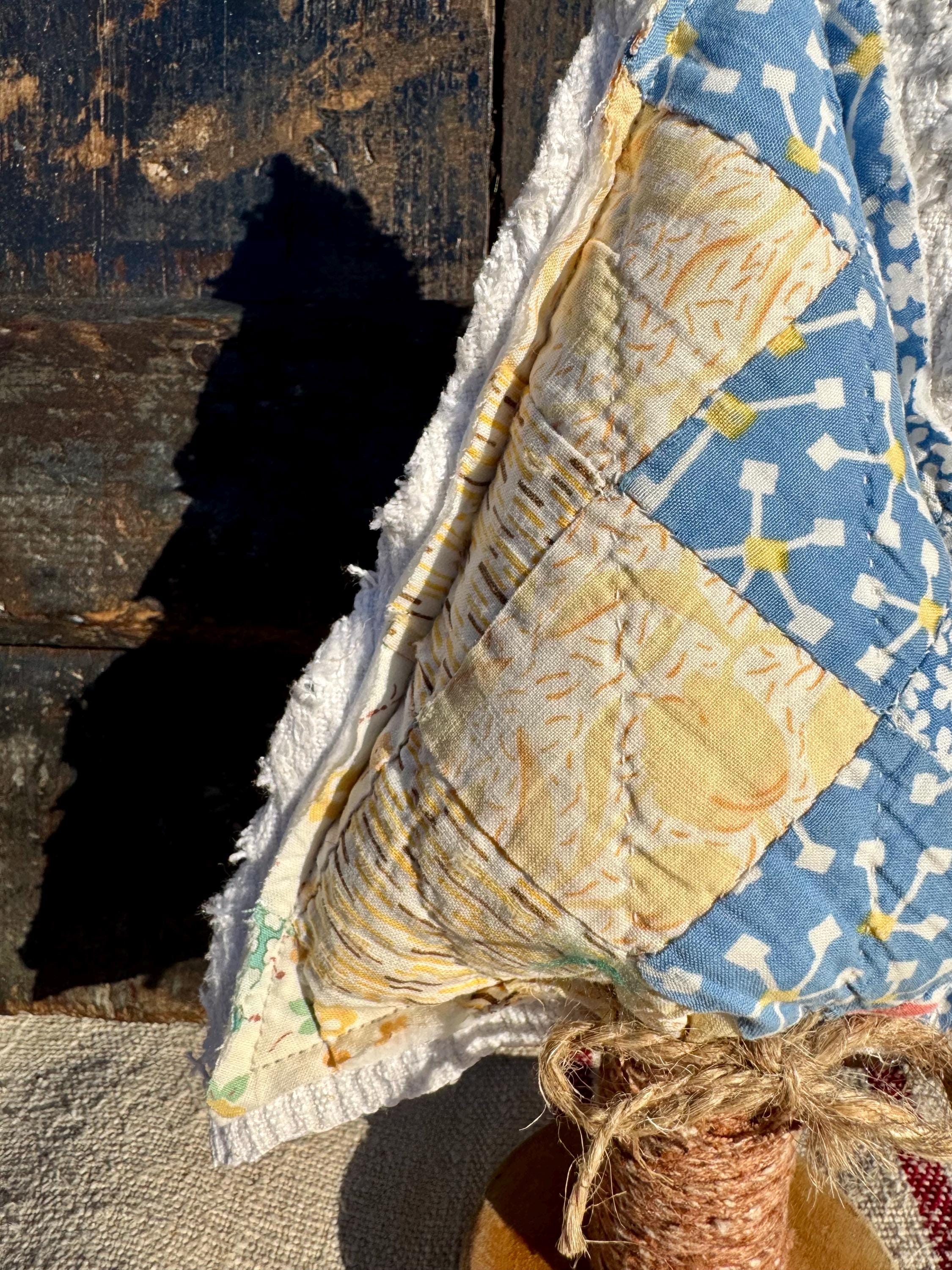 This charming blue and yellow patchwork quilt was found at a nearby Massachusetts barn sale was made into a 10” spool Christmas tree. I added contrasting white grain sack! I placed it atop a vintage textile spool which still has its original matching brown and white thread. Adding only antique and vintage textiles adds to the cost, charm and design of this one of a kind tree..