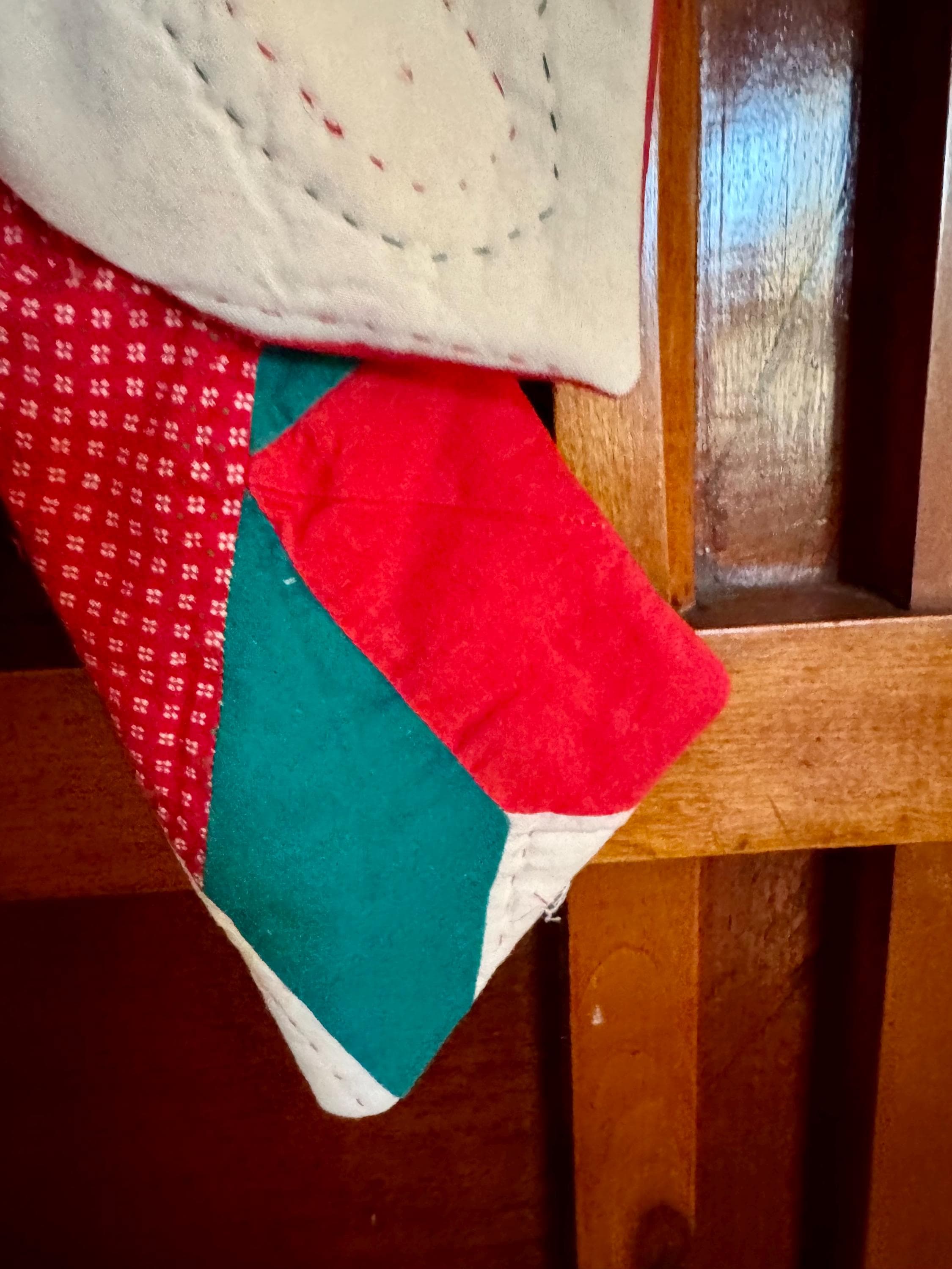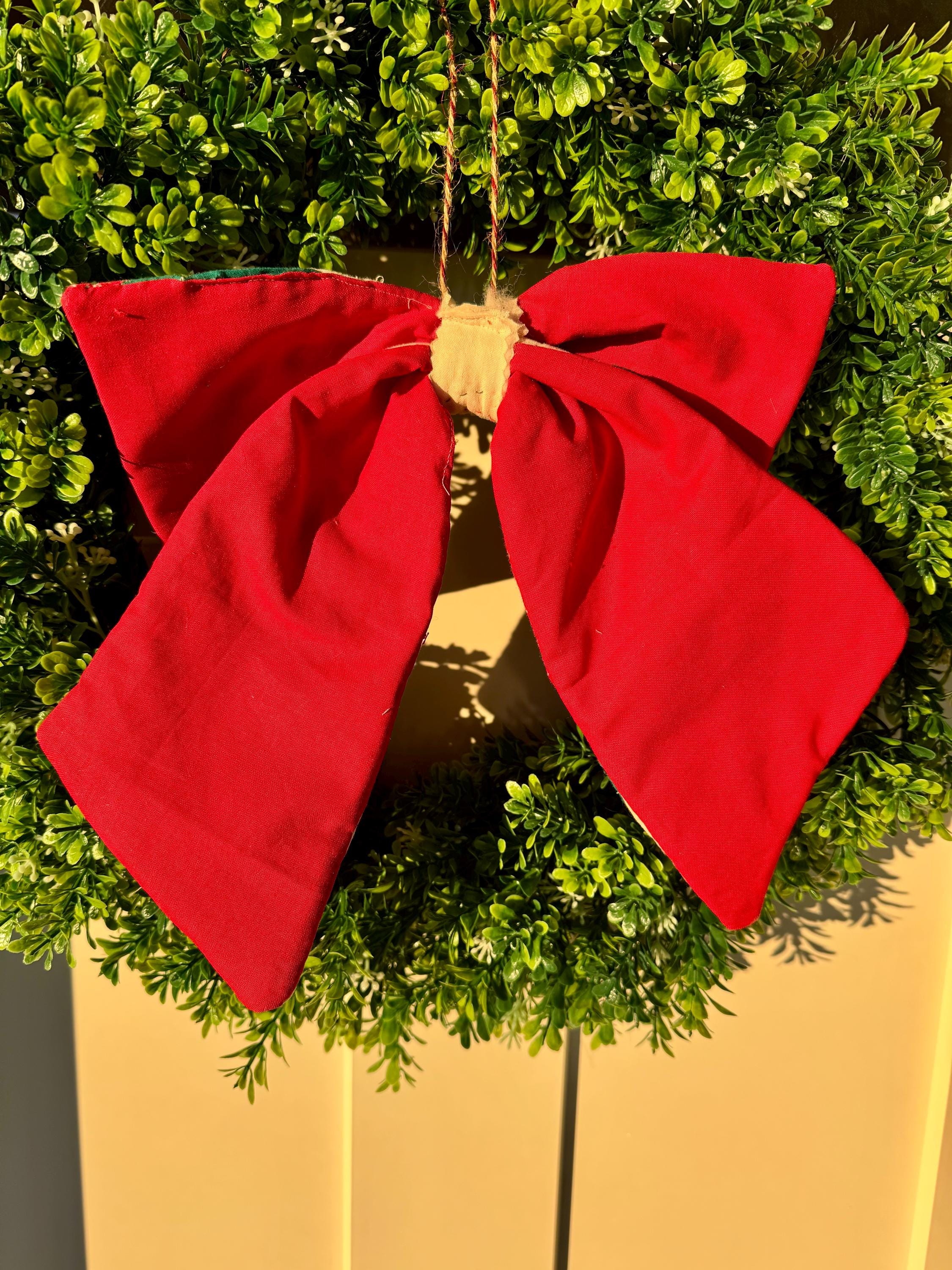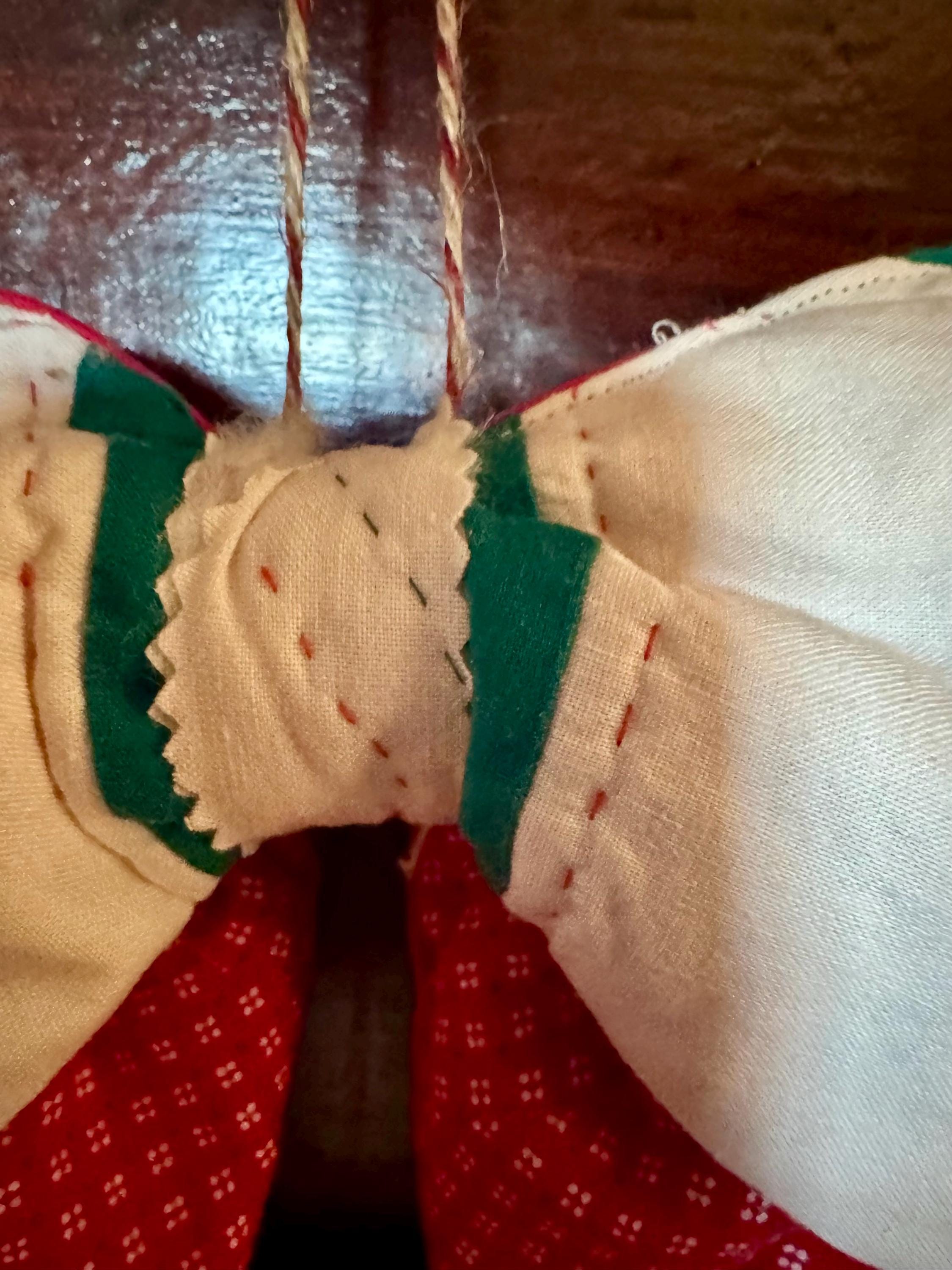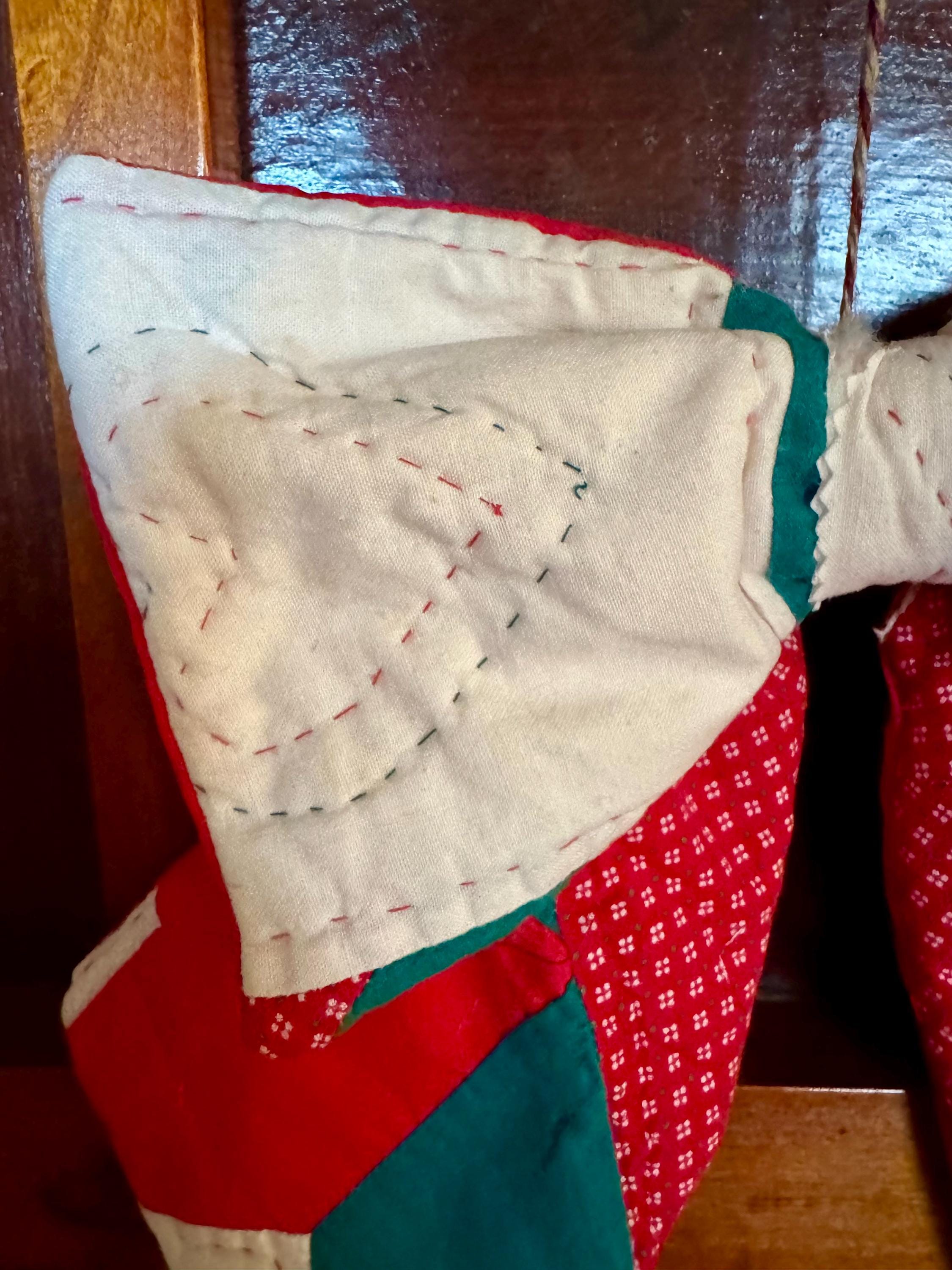 Vintage antique quilt hanging wreath bow is so charming in charming Christmas patchwork colors- and has the most charming original hand stitched red and green hearts - so pretty and welcoming for door decor, wreath bow or a Christmas tree topper - or for any time. I’ve lined the reverse in a matching red cotton which adds to its design. This door wreath bow sash is perfect for welcoming front door decor and is lovely for any farmhouse, cottage, shabby chic, Christmas or anytime styles and home decors! It comes with a matching beige and red jute removable hanger for peg rack hanging so you can hang it anywhere ( see the photo of how you can display it - and to tie on a Christmas tree add wire or tie with the jute string) or you can affix to your wreath (not included) with the jute string or your wreath wire for door hanging. The material is SO pretty- but as it is antique/vintage it is not weather proof so it’s recommended for indoor use or behind a storm door as an outdoor sash or bow! This vintage bow wreath scarf is in green, blues, reds and white and you can change the many I make for your mood or the season. lovely for you- or gift one for a housewarming, realtor, wedding shower, birthday or any other gift! The bow is approximately 11” across and the tails are 12”.