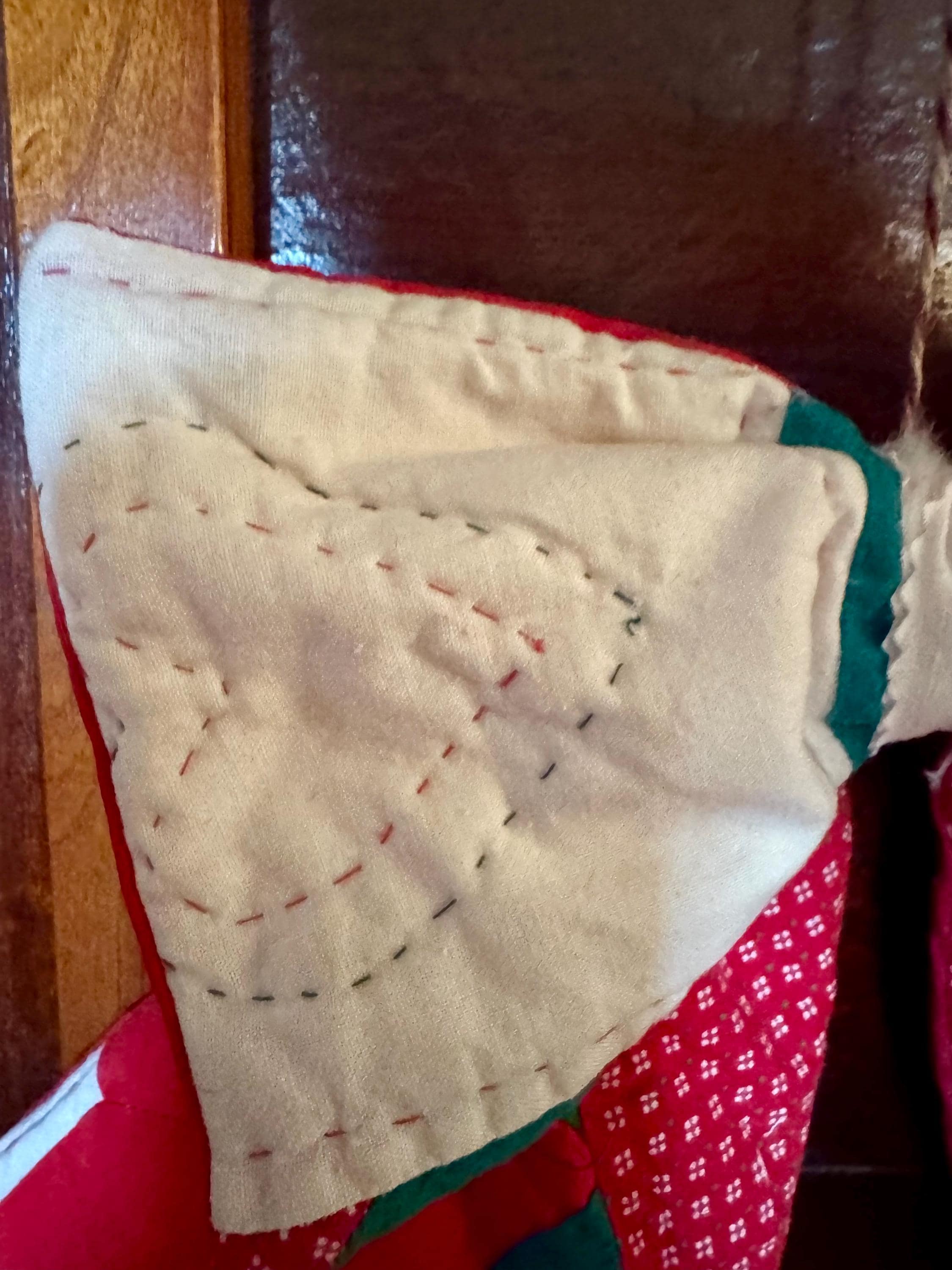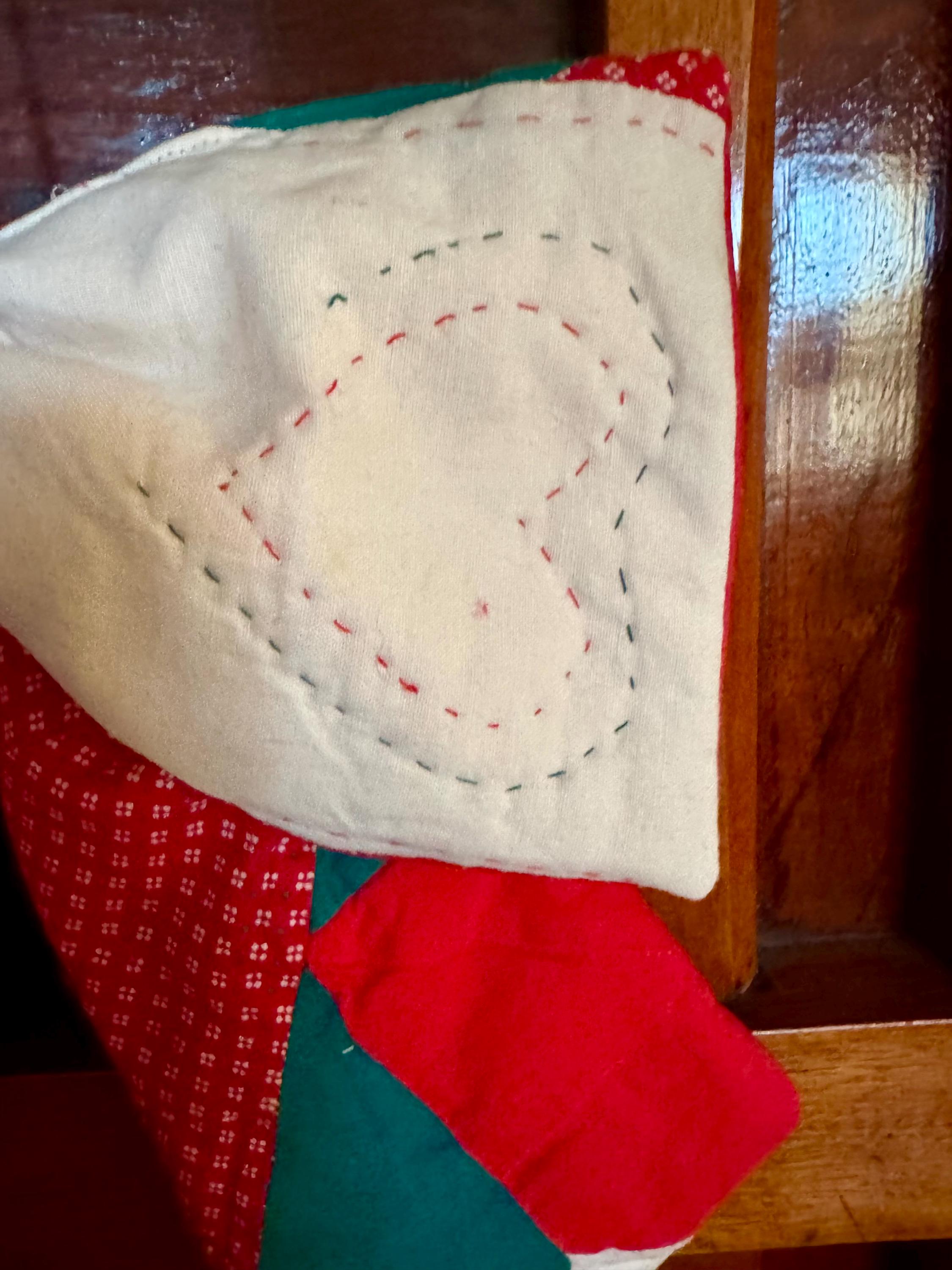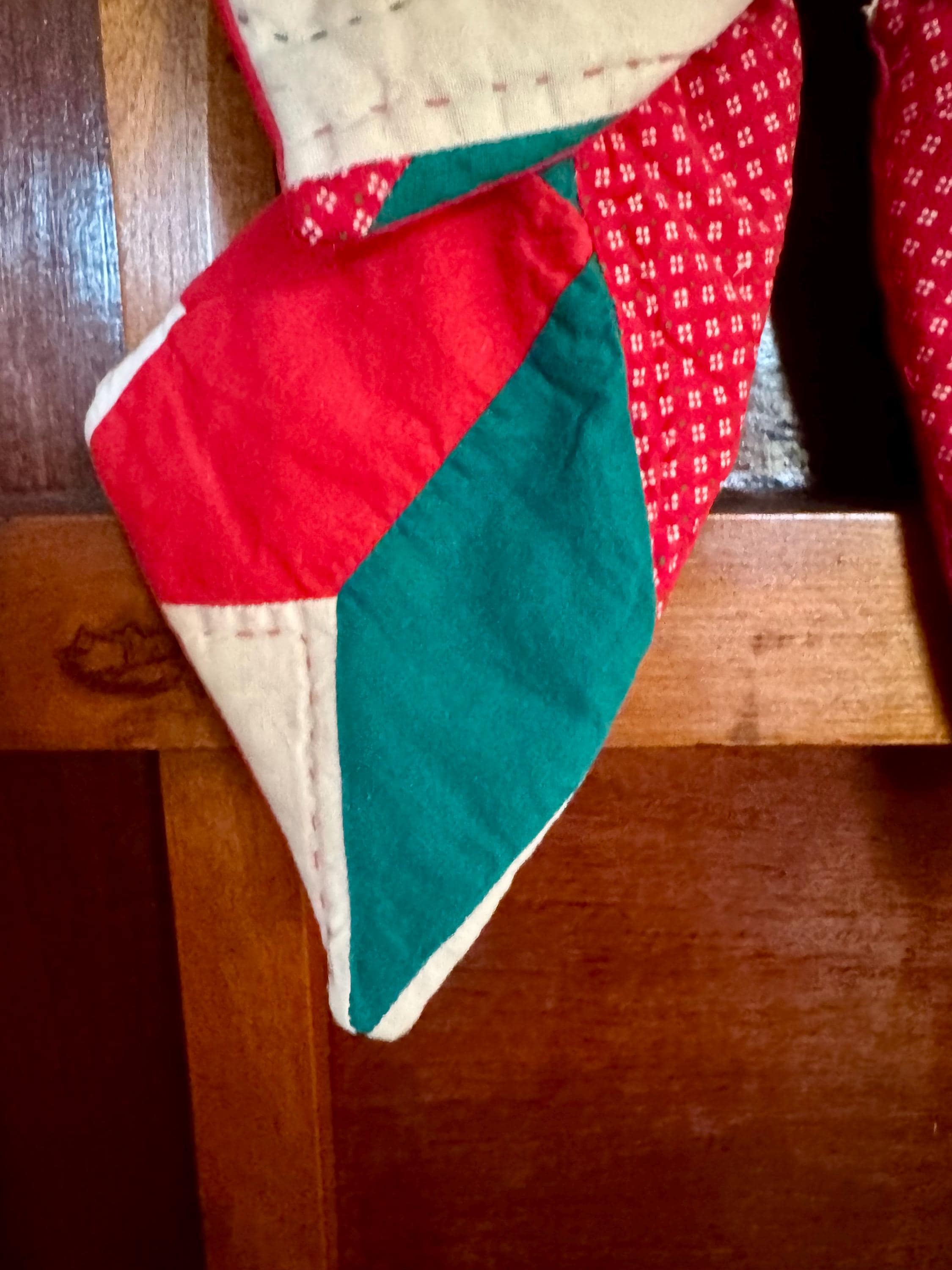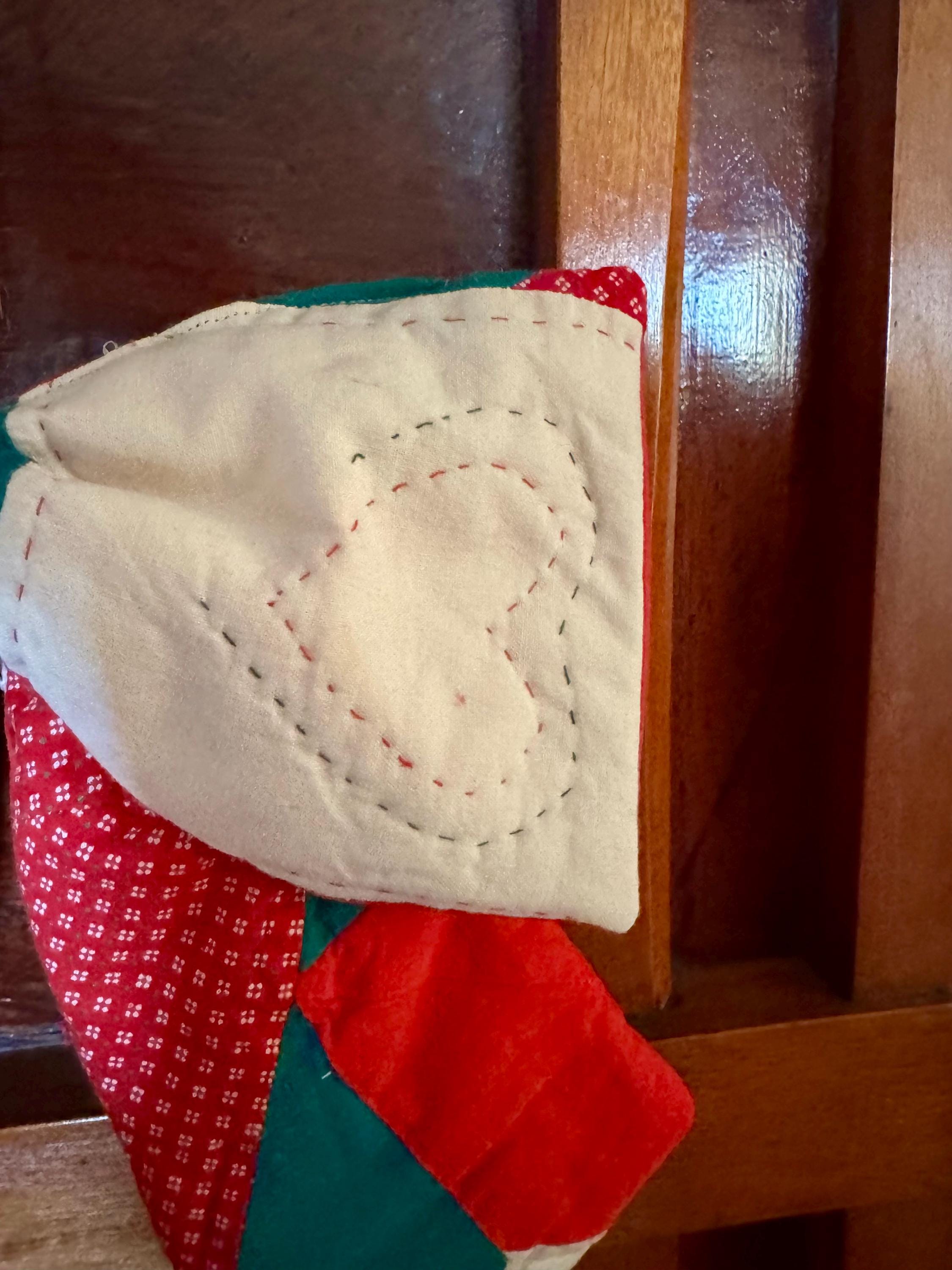 Vintage antique quilt hanging wreath bow is so charming in charming Christmas patchwork colors- and has the most charming original hand stitched red and green hearts - so pretty and welcoming for door decor, wreath bow or a Christmas tree topper - or for any time. I’ve lined the reverse in a matching red cotton which adds to its design. This door wreath bow sash is perfect for welcoming front door decor and is lovely for any farmhouse, cottage, shabby chic, Christmas or anytime styles and home decors! It comes with a matching beige and red jute removable hanger for peg rack hanging so you can hang it anywhere ( see the photo of how you can display it - and to tie on a Christmas tree add wire or tie with the jute string) or you can affix to your wreath (not included) with the jute string or your wreath wire for door hanging. The material is SO pretty- but as it is antique/vintage it is not weather proof so it’s recommended for indoor use or behind a storm door as an outdoor sash or bow! This vintage bow wreath scarf is in green, blues, reds and white and you can change the many I make for your mood or the season. lovely for you- or gift one for a housewarming, realtor, wedding shower, birthday or any other gift! The bow is approximately 11” across and the tails are 12”.