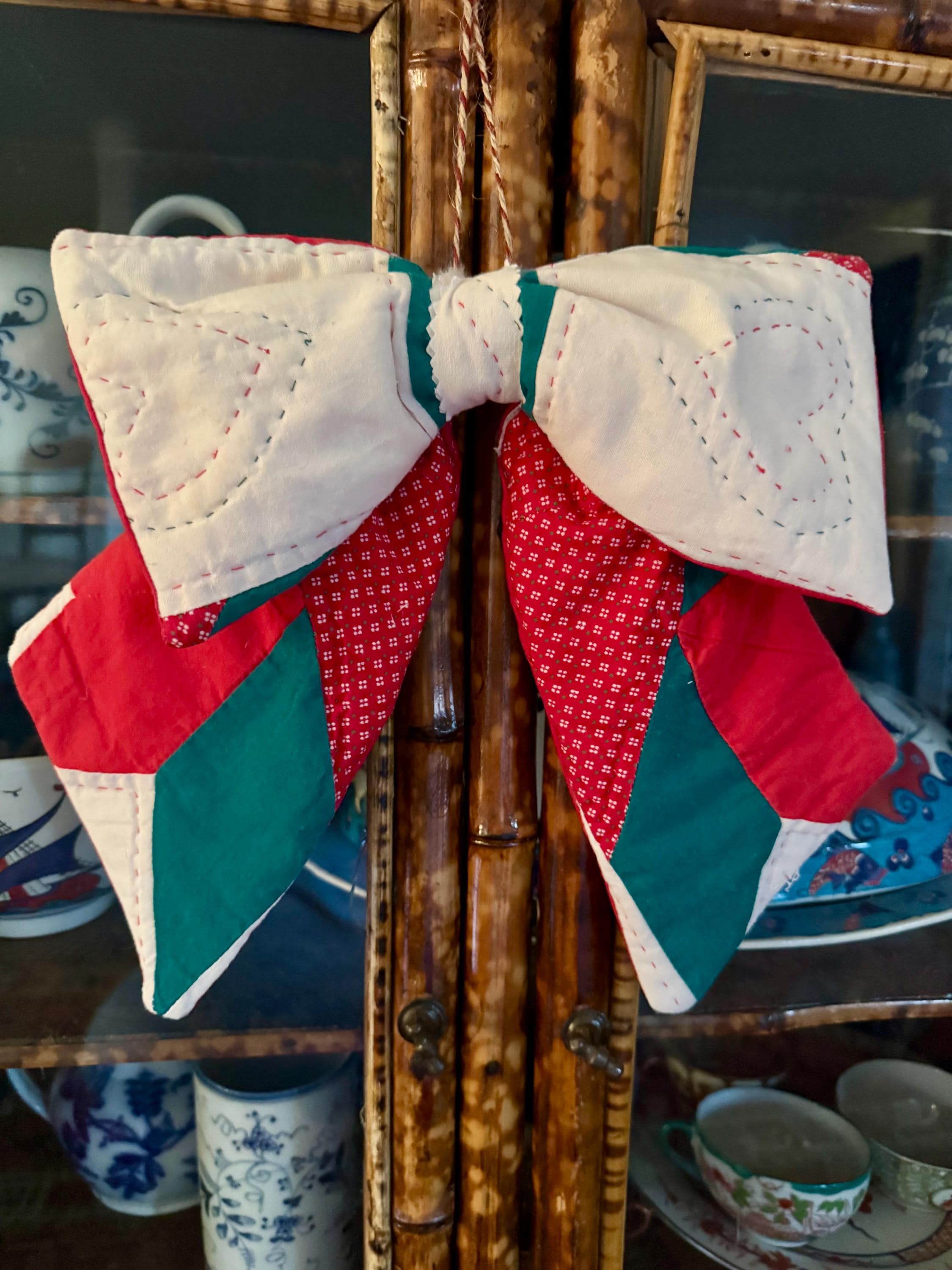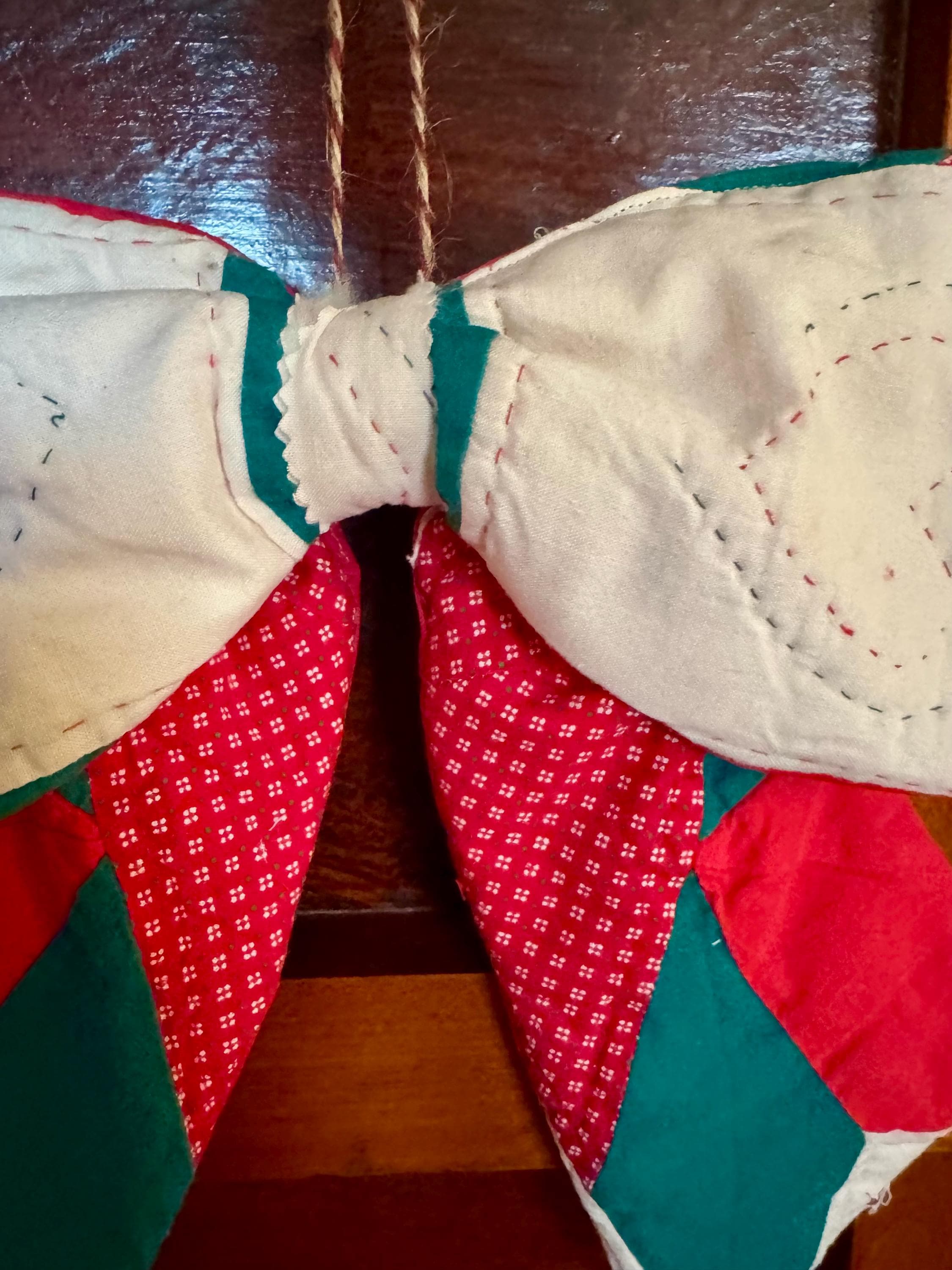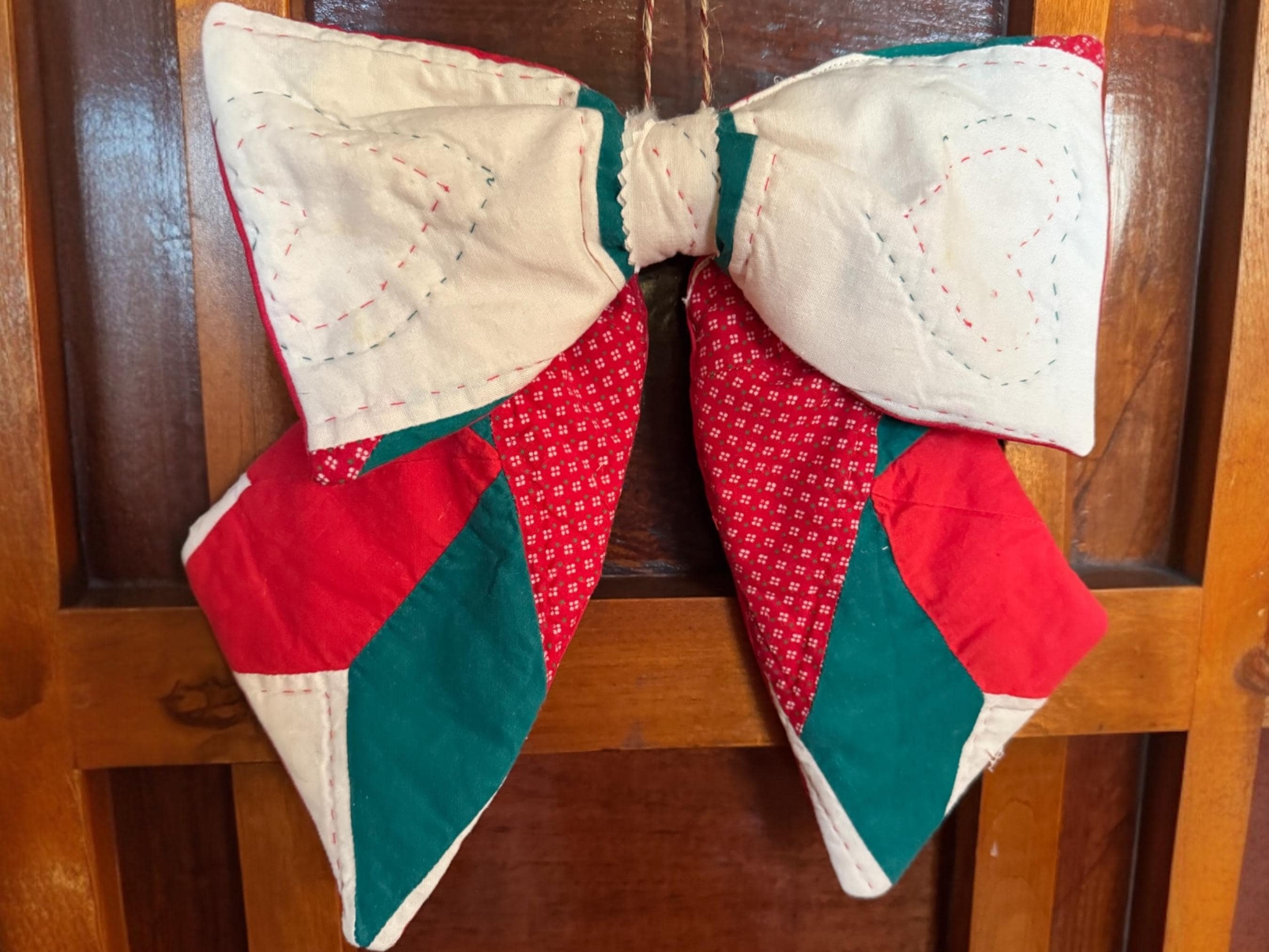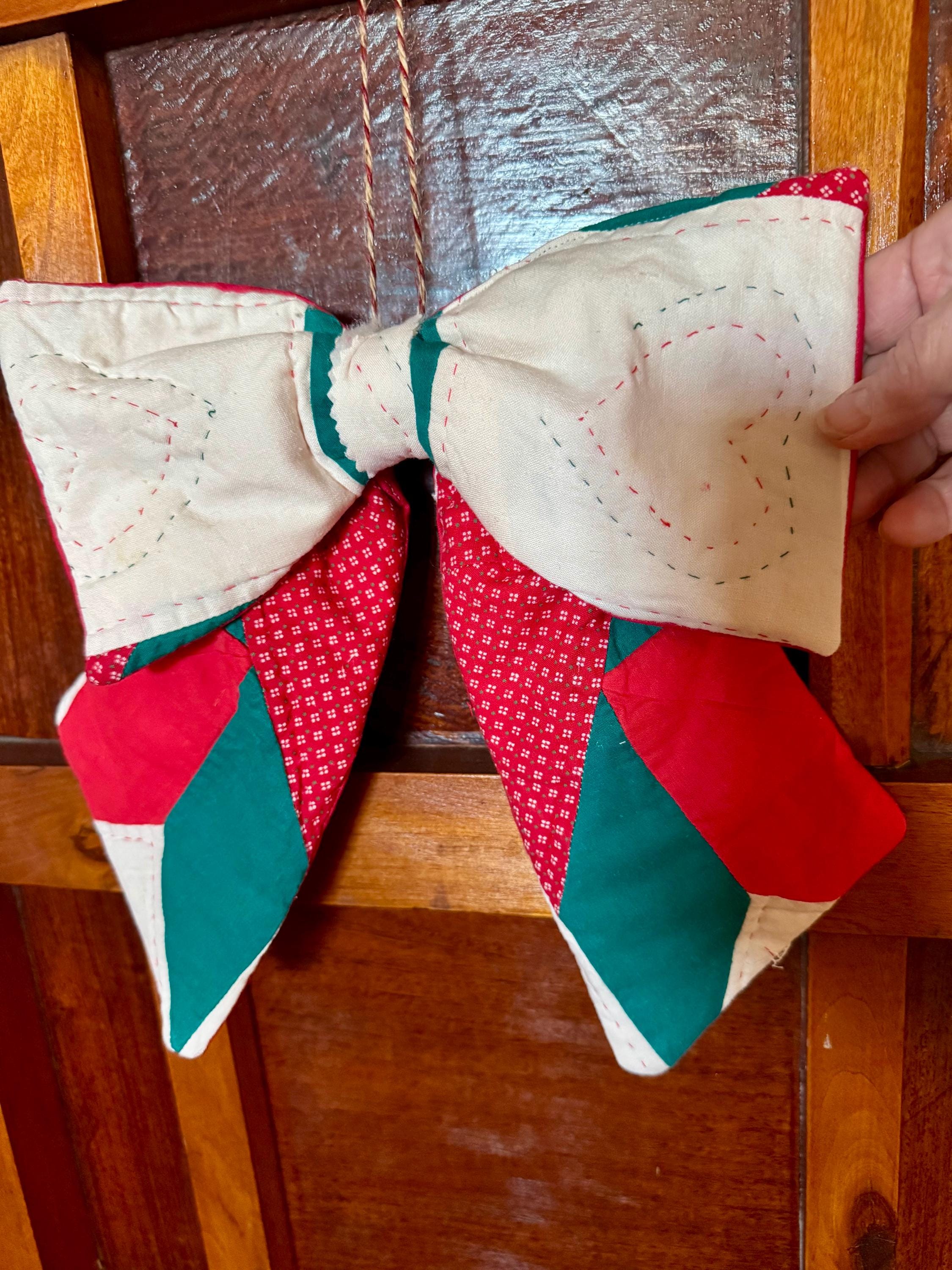 Bow - Vintage Quilt Christmas Tree Topper, Farmhouse Cottage Style Door Wreath Decor, Charming Faded Colors! Handmade fabric quilted bow