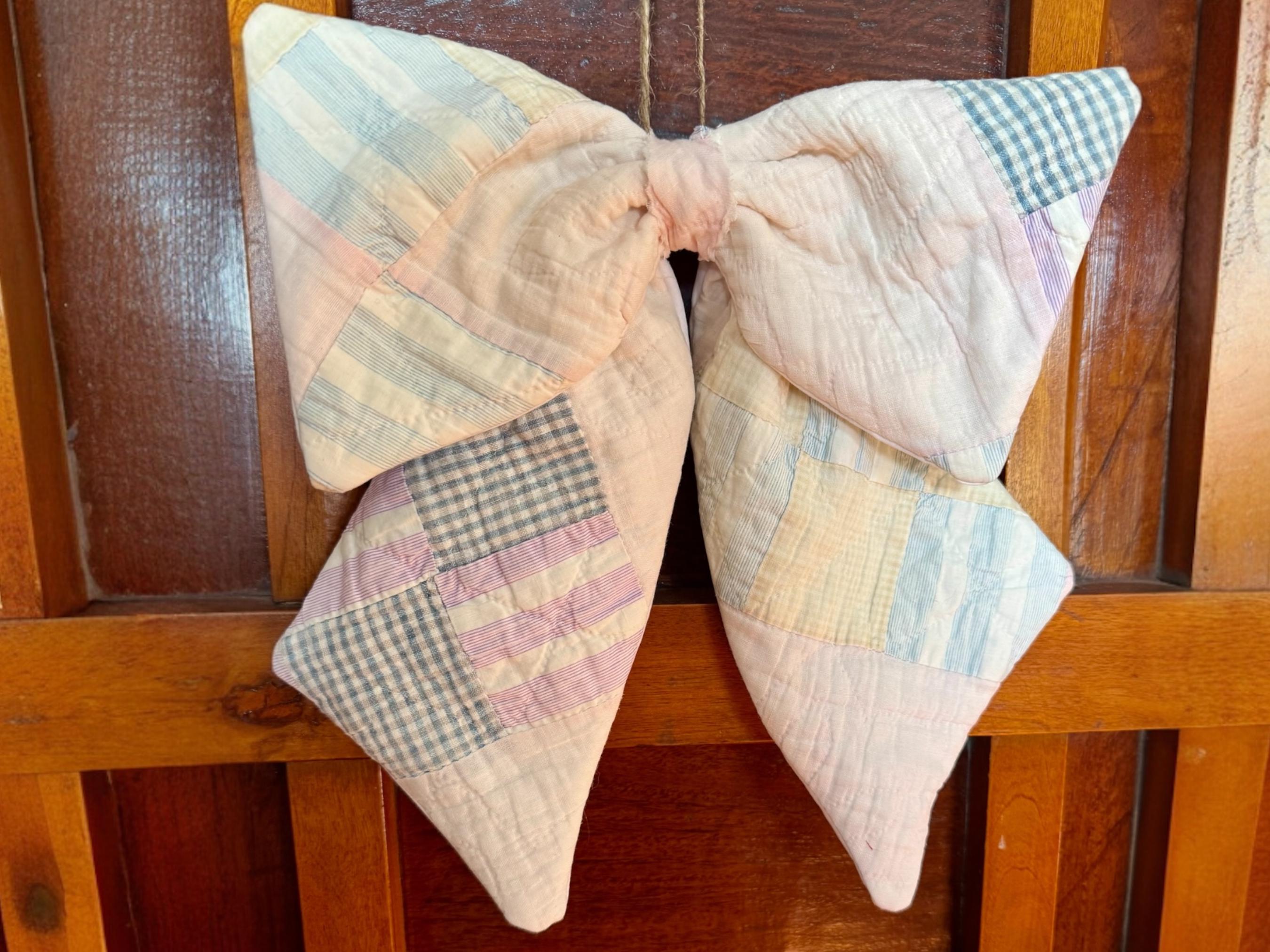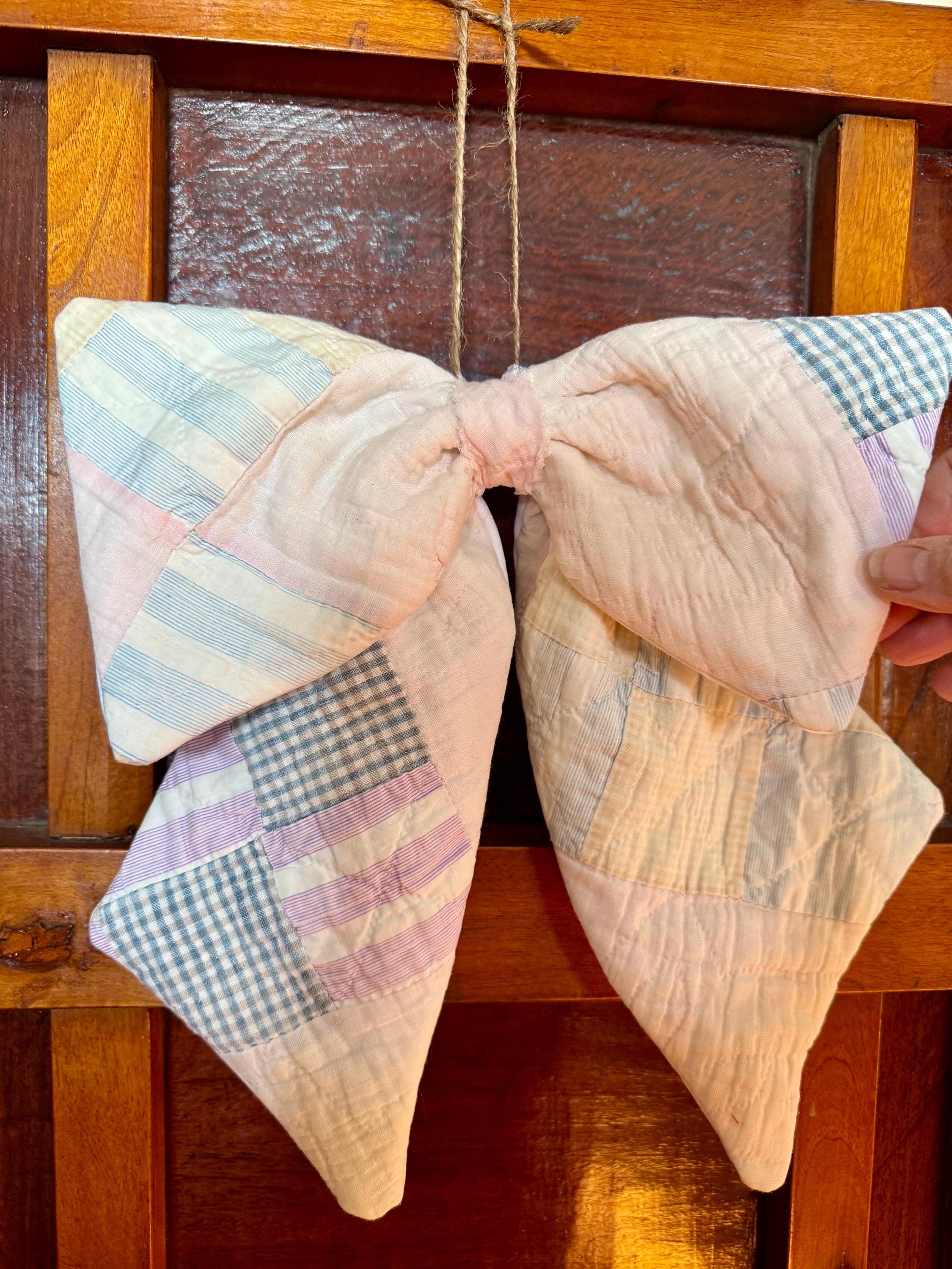 Vintage antique quilt hanging wreath bow is so charming in charming faded pastel sherbet patchwork colors- each pattern on each bow is different so it is truly unique. So pretty and welcoming for door decor, wreath bow or a Christmas tree topper - or for any time. I’ve lined the reverse in a matching white decorator cotton which adds to its design. This door wreath bow sash is perfect for welcoming front door decor and is lovely for any farmhouse, cottage, shabby chic, Christmas or anytime styles and home decors! It comes with a matching beige jute removable hanger for peg rack hanging so you can hang it anywhere ( see the photo of how you can display it - and to tie on a Christmas tree add wire or tie with the jute string) or you can affix to your wreath (not included) with the jute string or your wreath wire for door hanging. The material is SO pretty- but as it is antique/vintage it is not weather proof so it’s recommended for indoor use or behind a storm door as an outdoor sash or bow! This vintage bow wreath scarf is in fresh pastels and you can change the many I make for your mood or the season. Lovely for you- or gift one for a housewarming, realtor, wedding shower, birthday or any other gift! The bow is approximately 11” across and the tails are 12”. EACH pattern is slightly different for a completely unique bow.