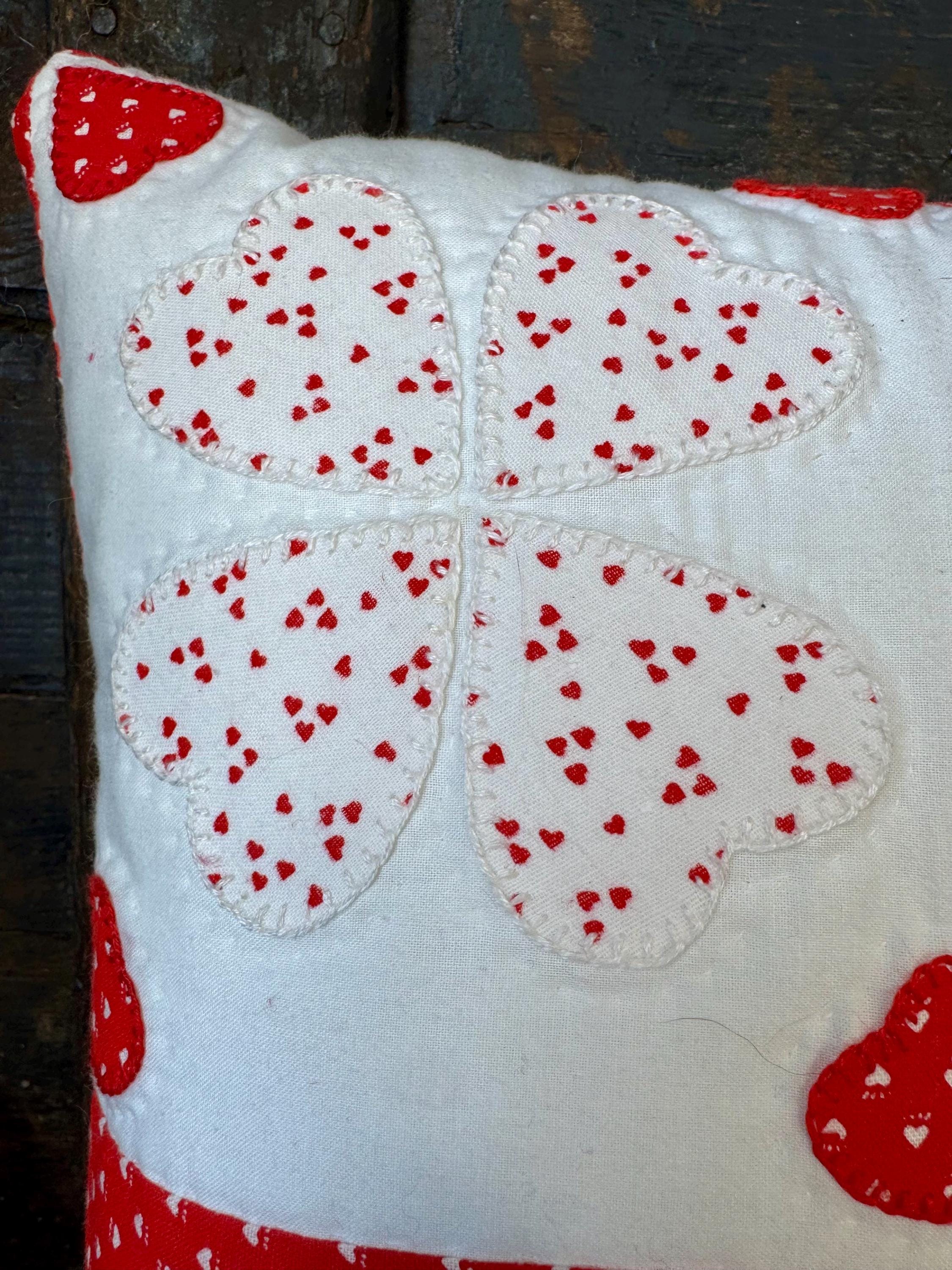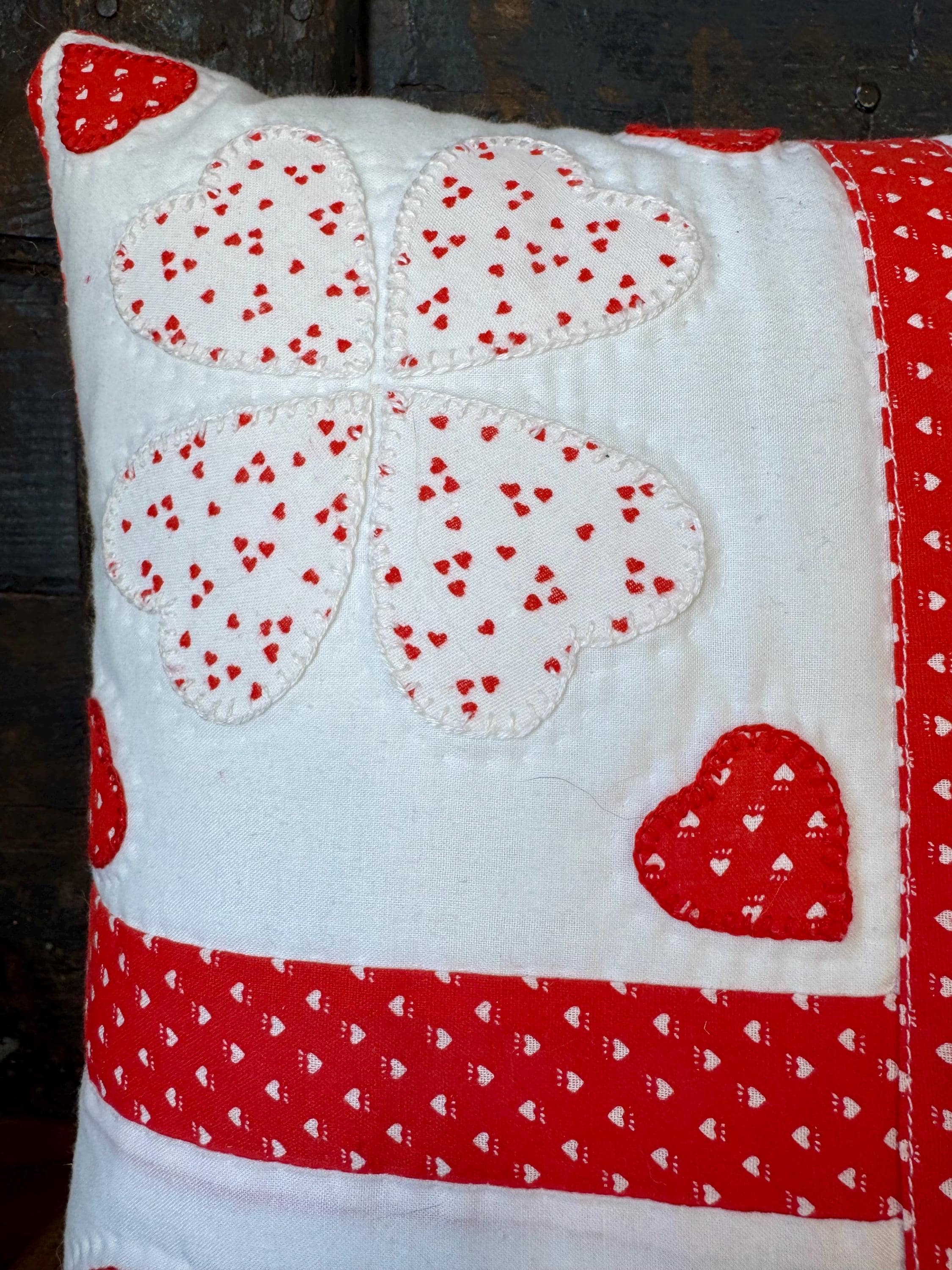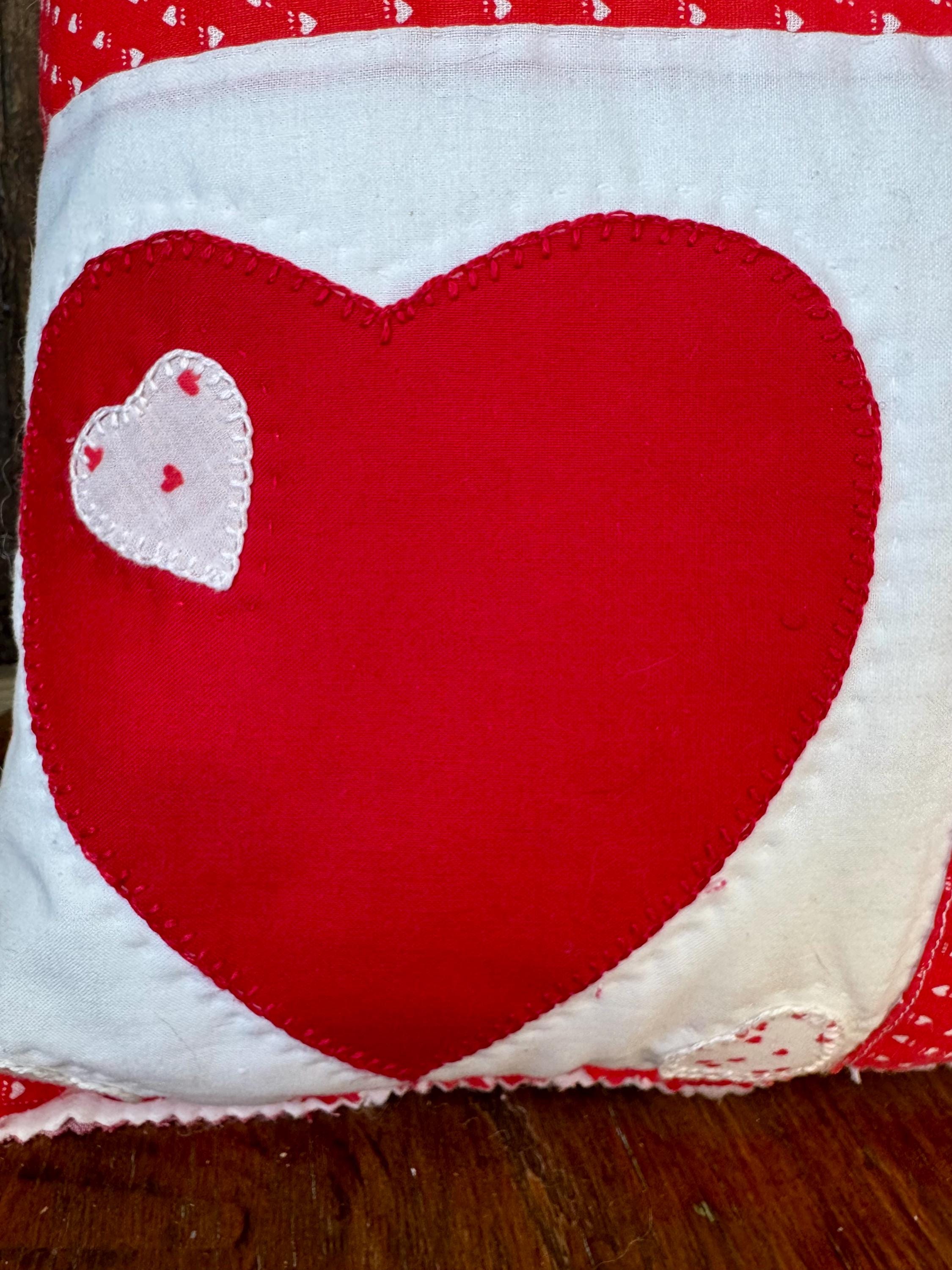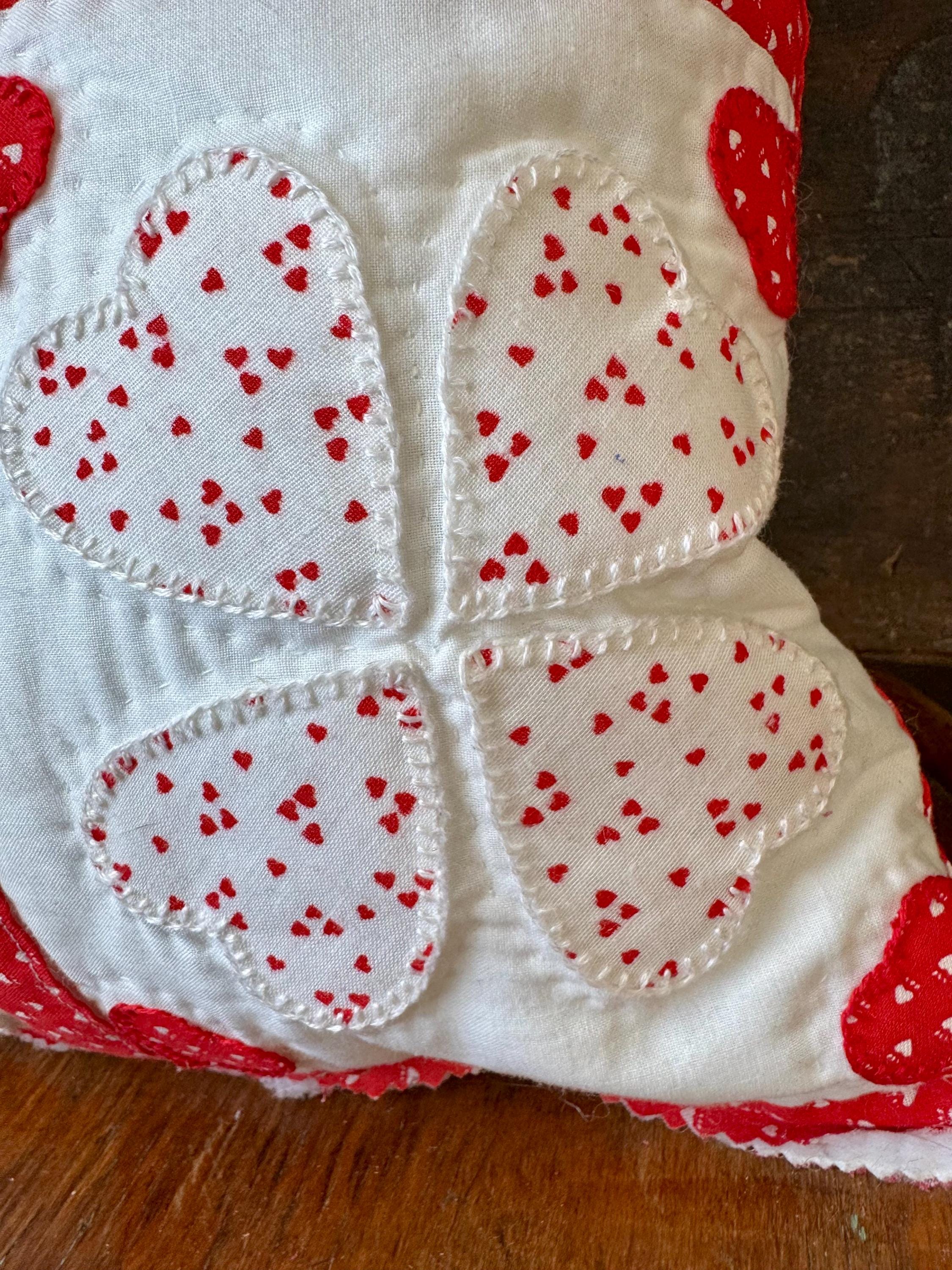 Vintage Quilt Hearts Pillow - Farmhouse cottage style red hearts with hand embroidery toss sofa cushion, red polka dots on back! M 15”