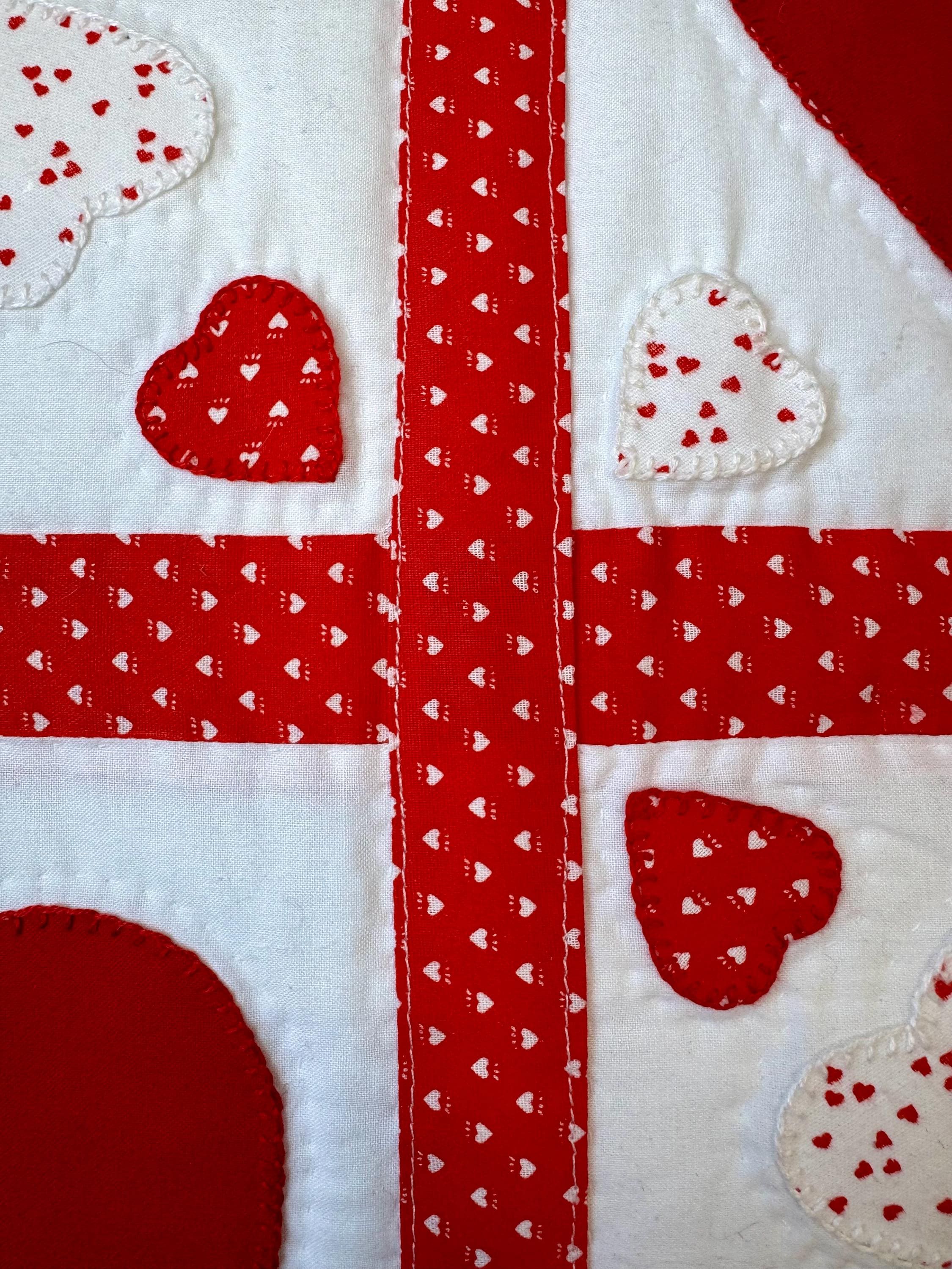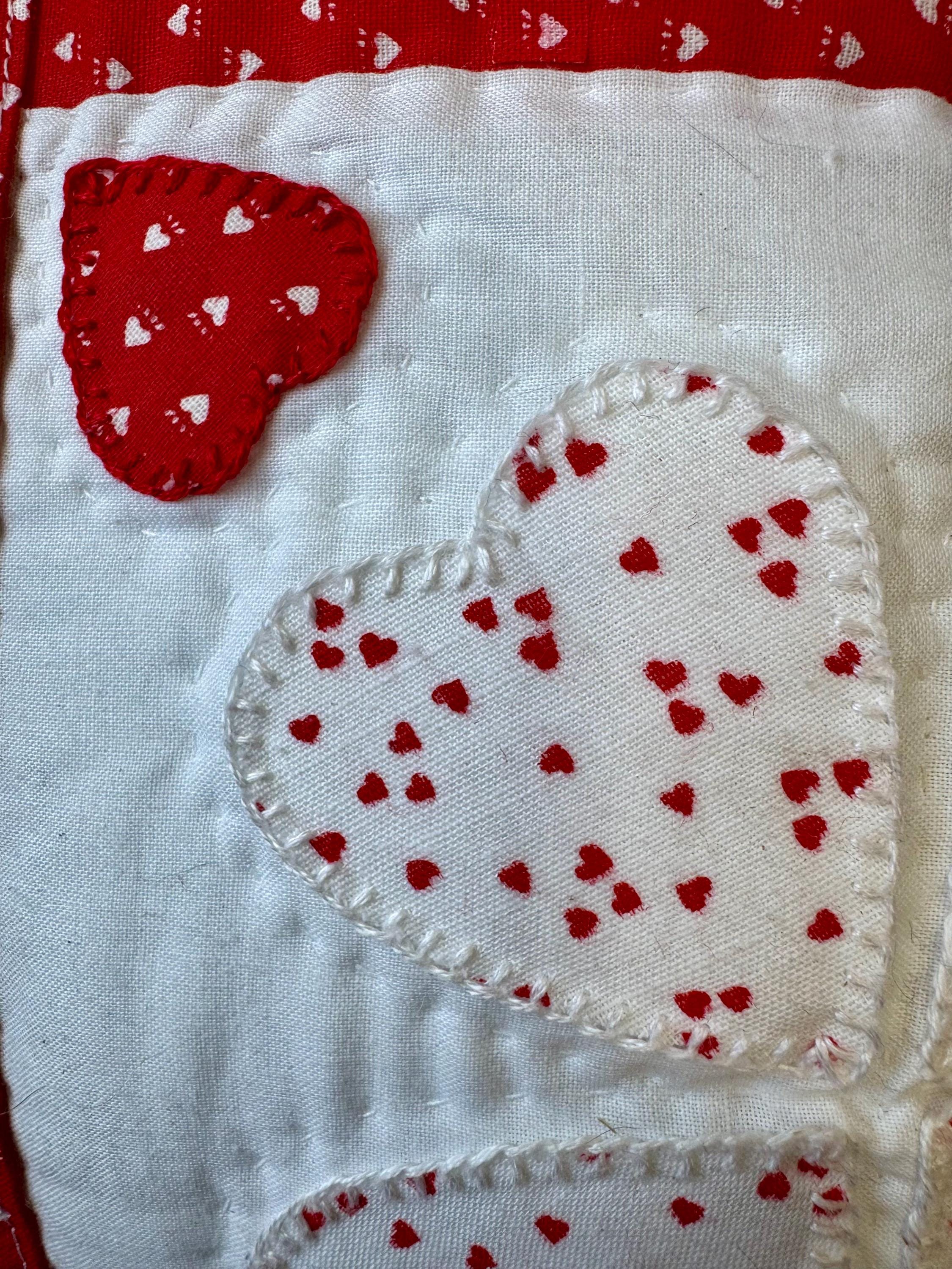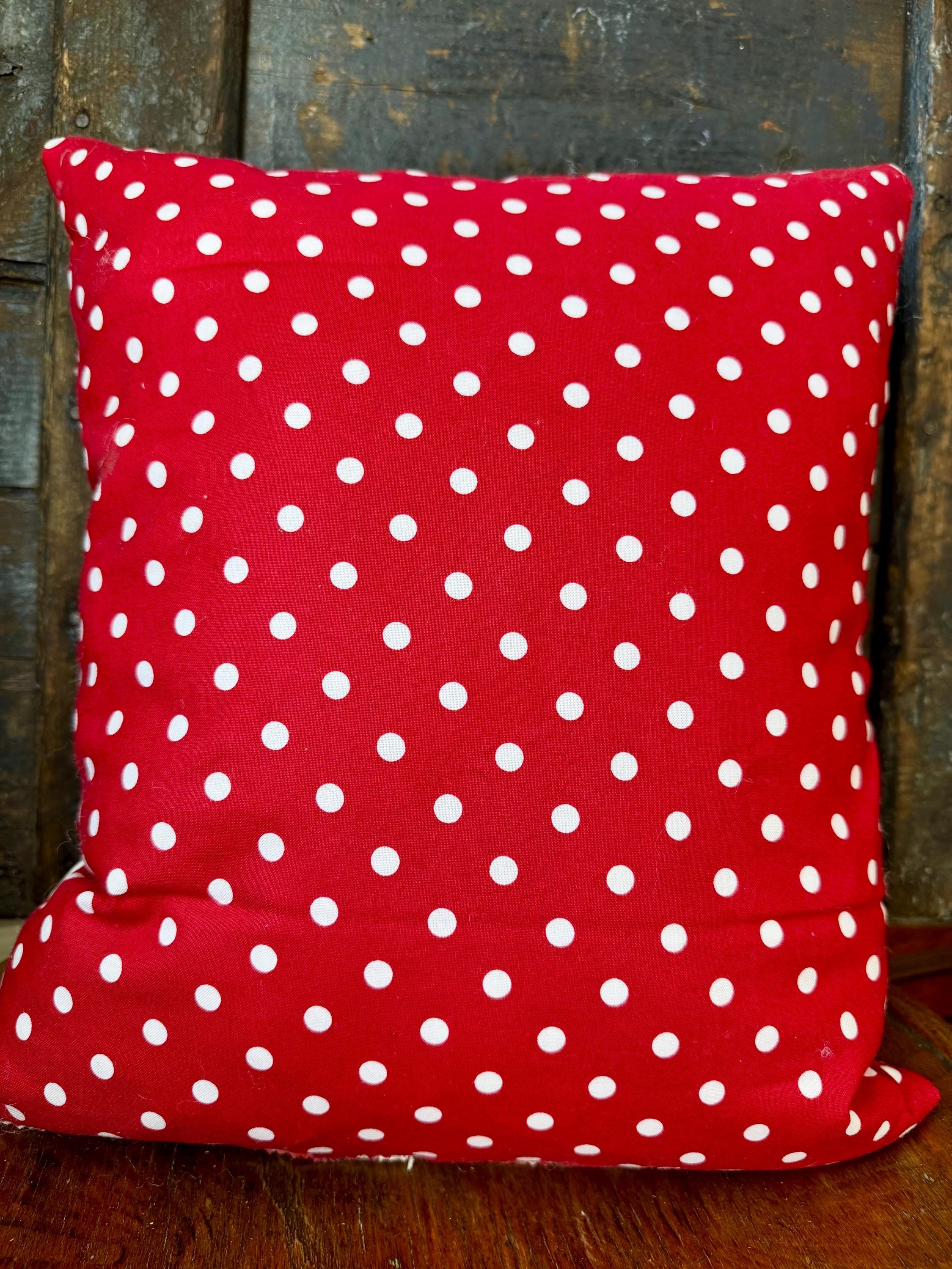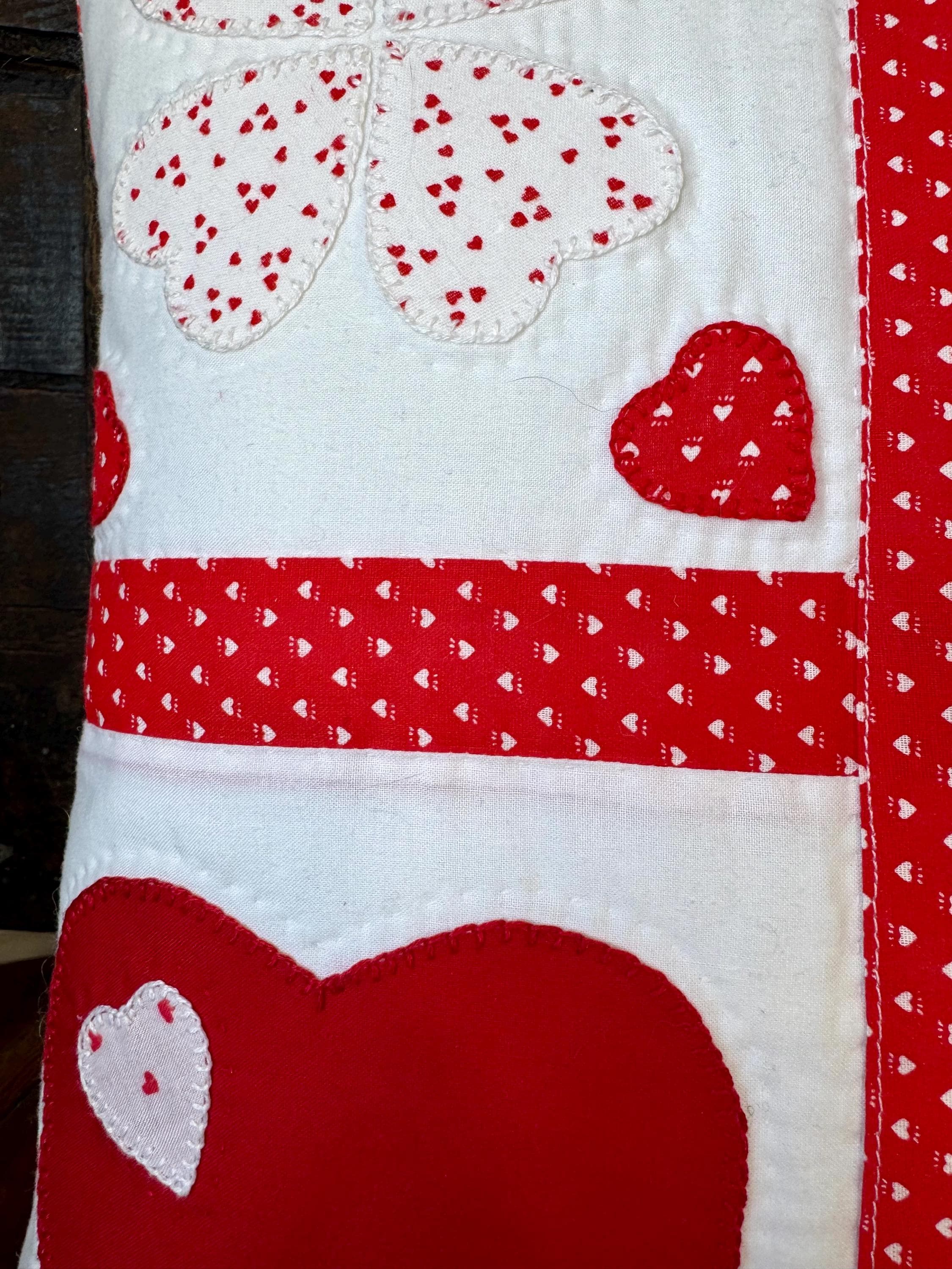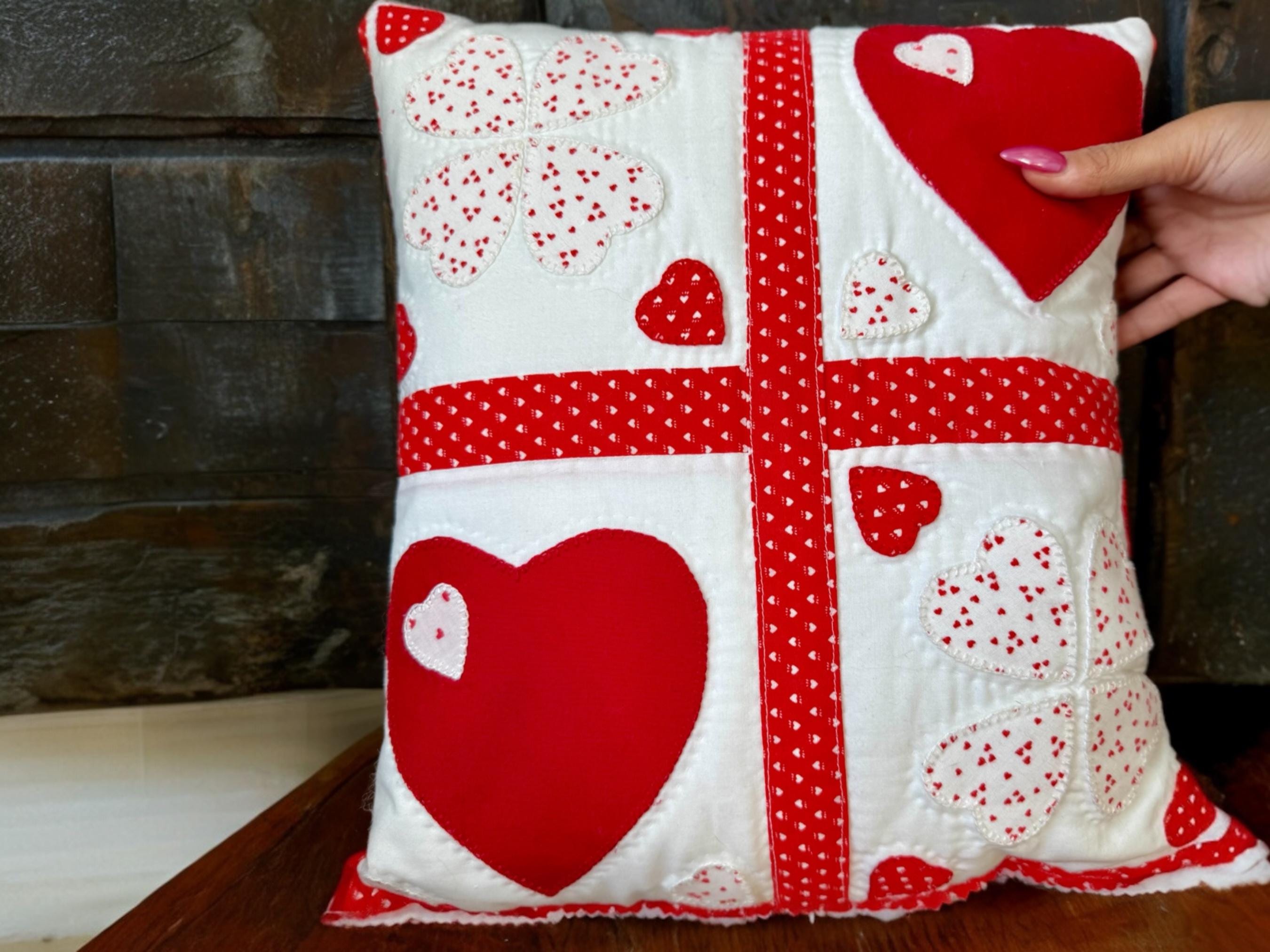 Vintage Quilt Hearts Pillow - Farmhouse cottage style red hearts with hand embroidery toss sofa cushion, red polka dots on back! M 15”