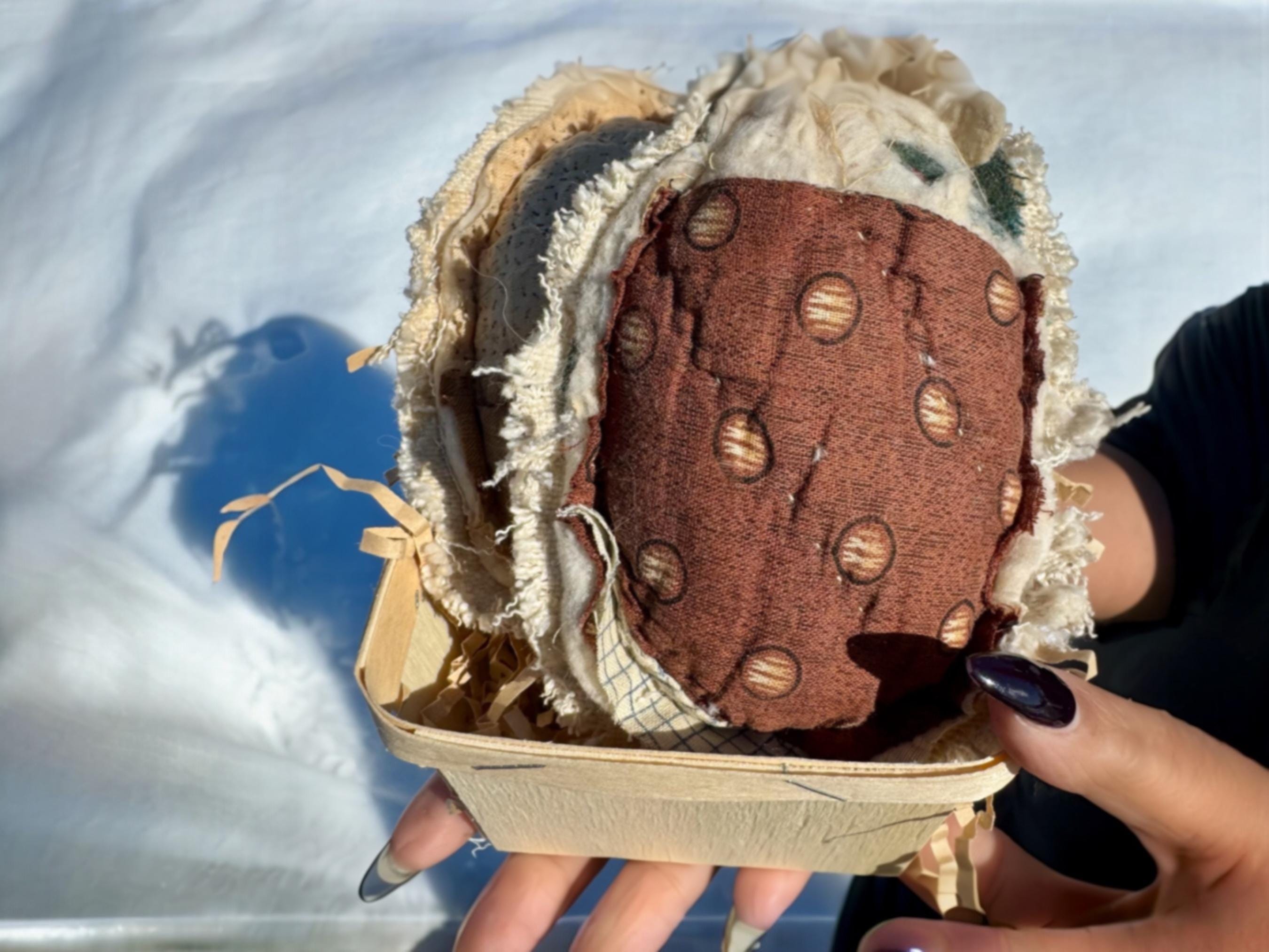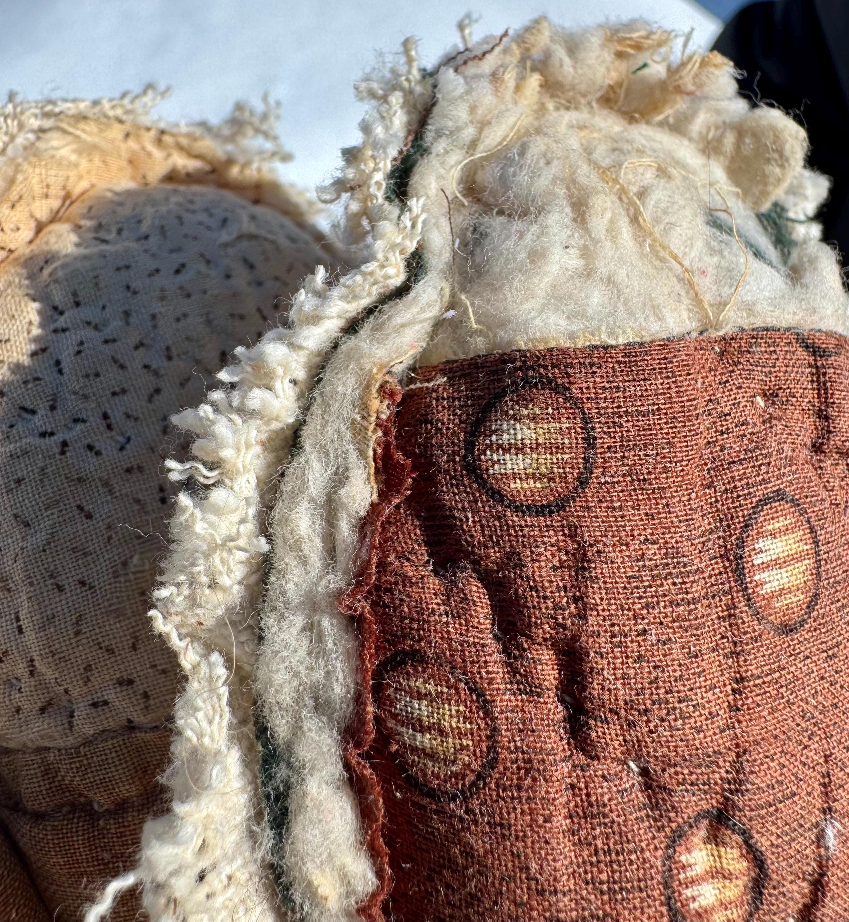 Easter Eggs - antique quilt in berry basket! Farmhouse cottage style primitive eggs, Set of 2 - charming & tattered, vintage grainsack back