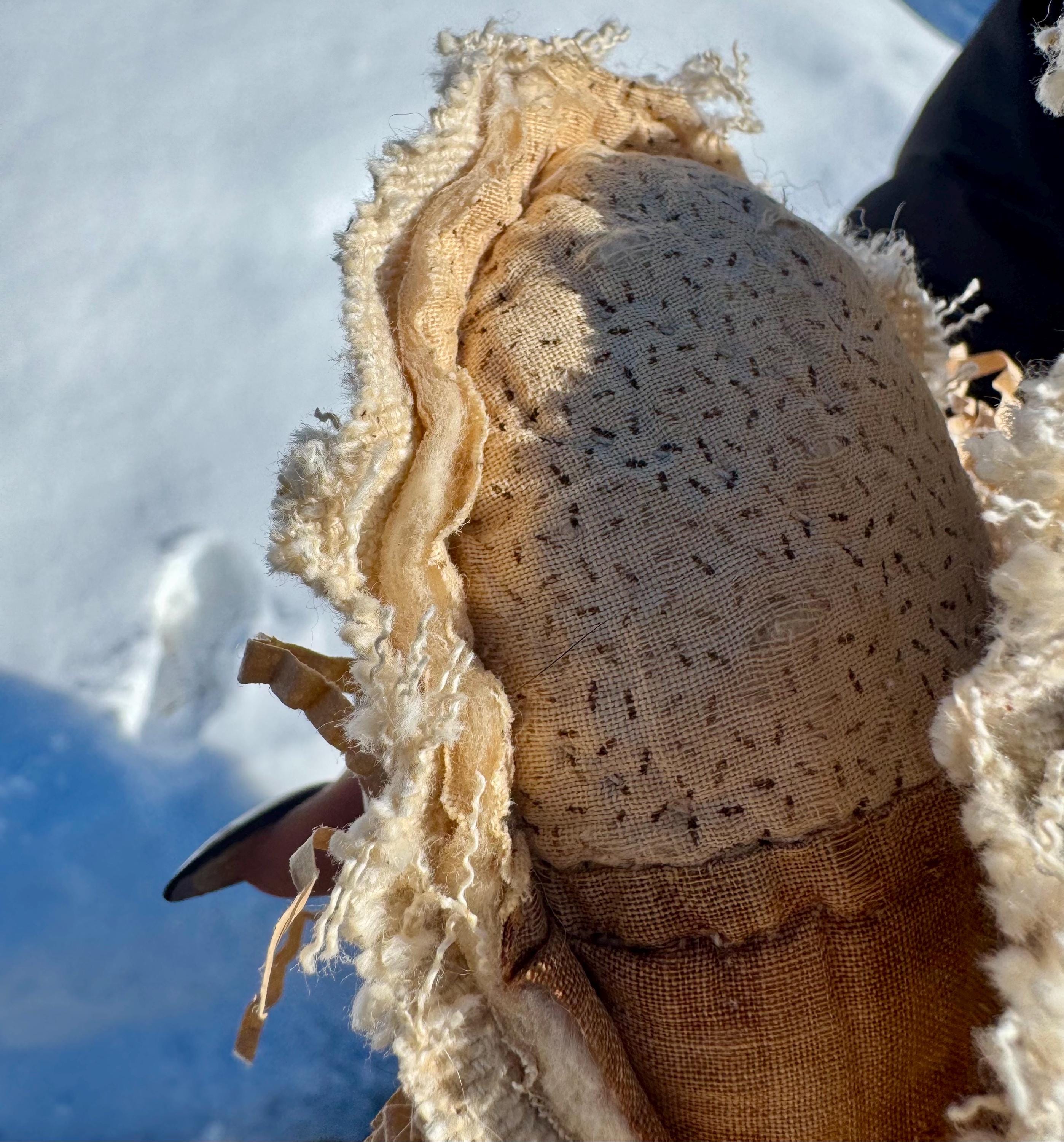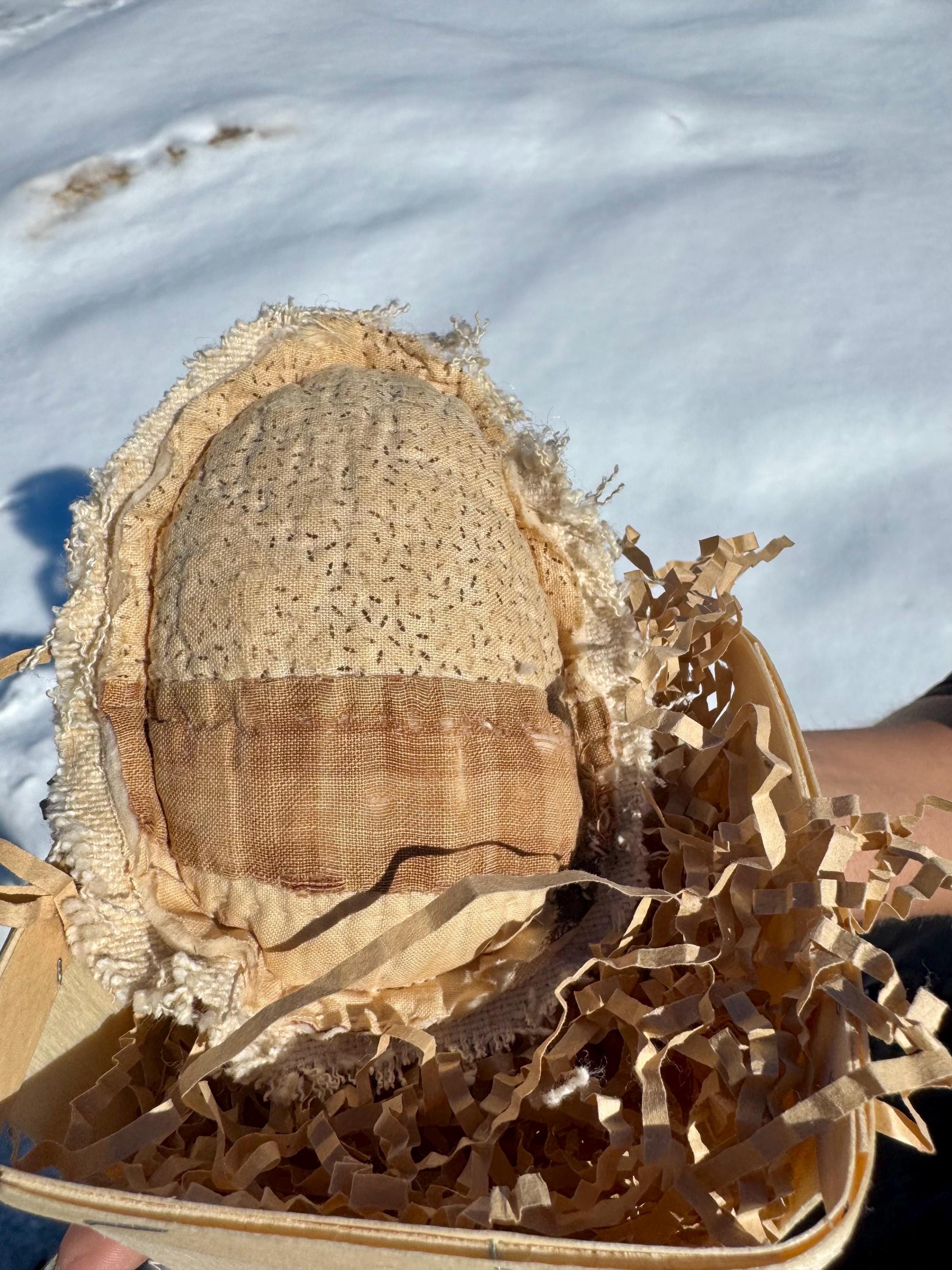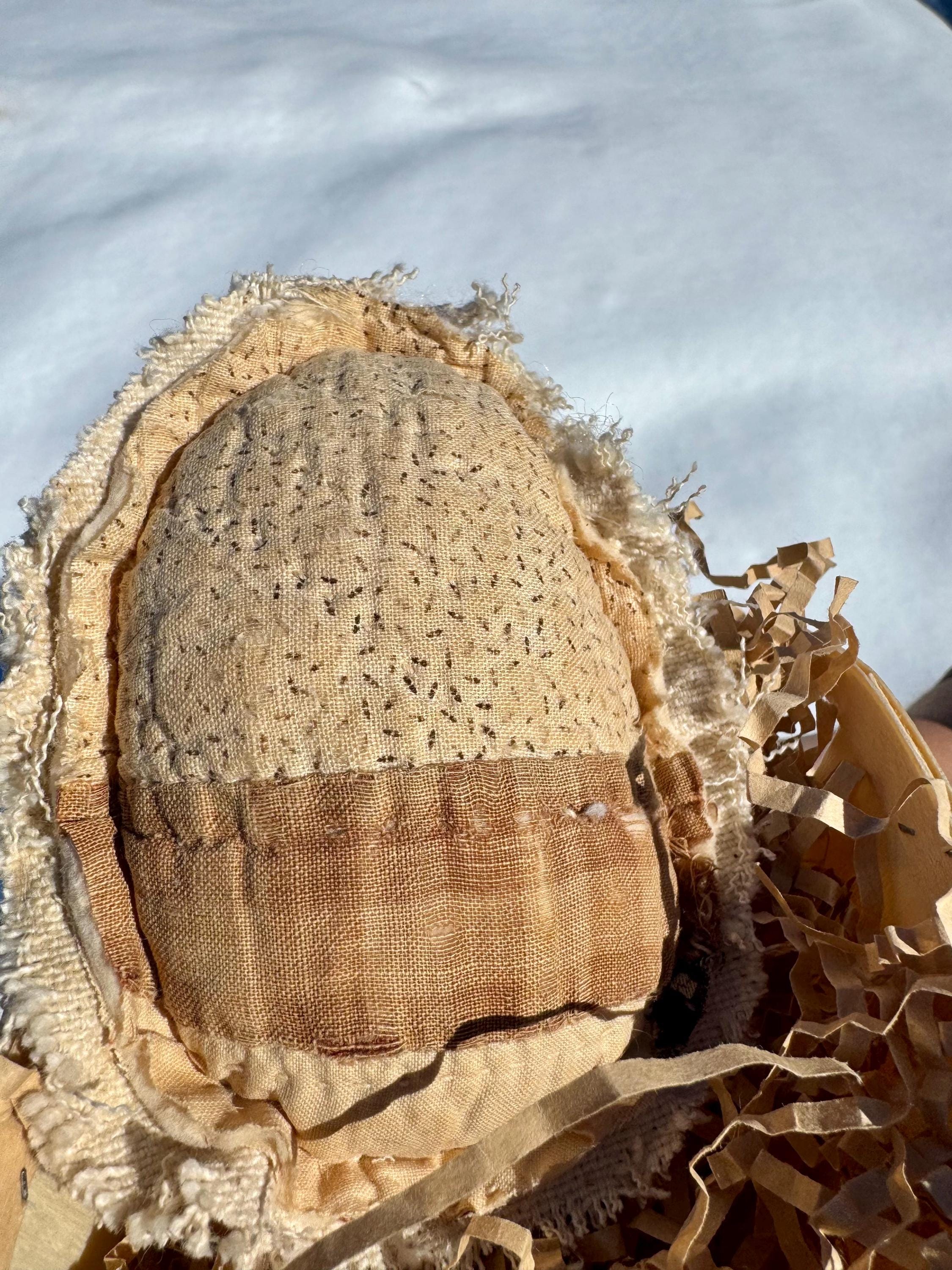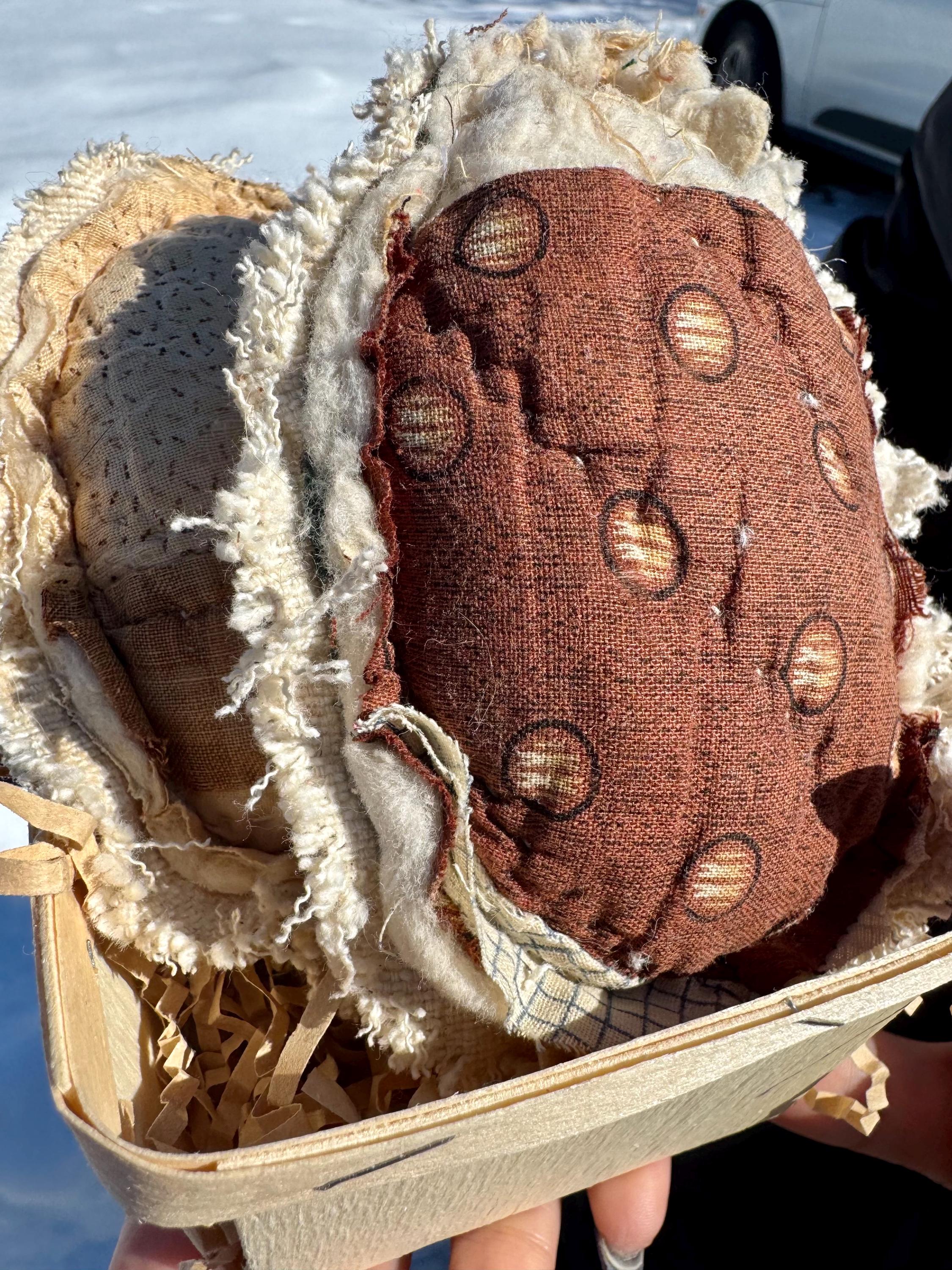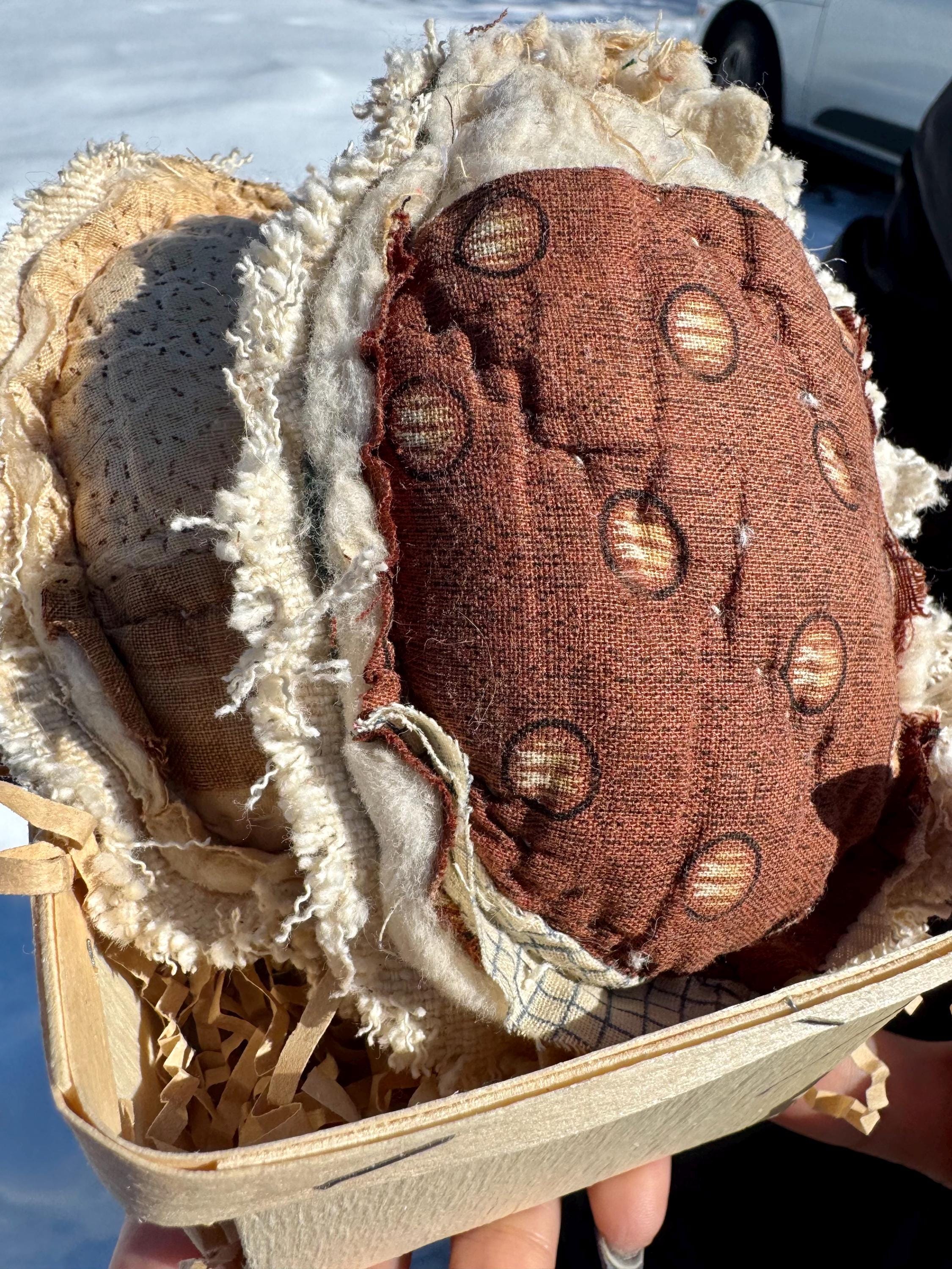 Charming, distressed and tattered antique 19th centuryquilt patchwork Easter eggs are so seeet as a set of two in a wood berry basket! The colors are primitive - beige, black and cream - and you can see the sheep wool batting poking out. Neat! These 2 eggs have vintage grain sack on the reverse which adds to the design and cost. Each egg is approximately 3 inches across and 5 inches long. The wood berry basket is approximately 4 inches on each side and comes filled with paper ‘grass.’