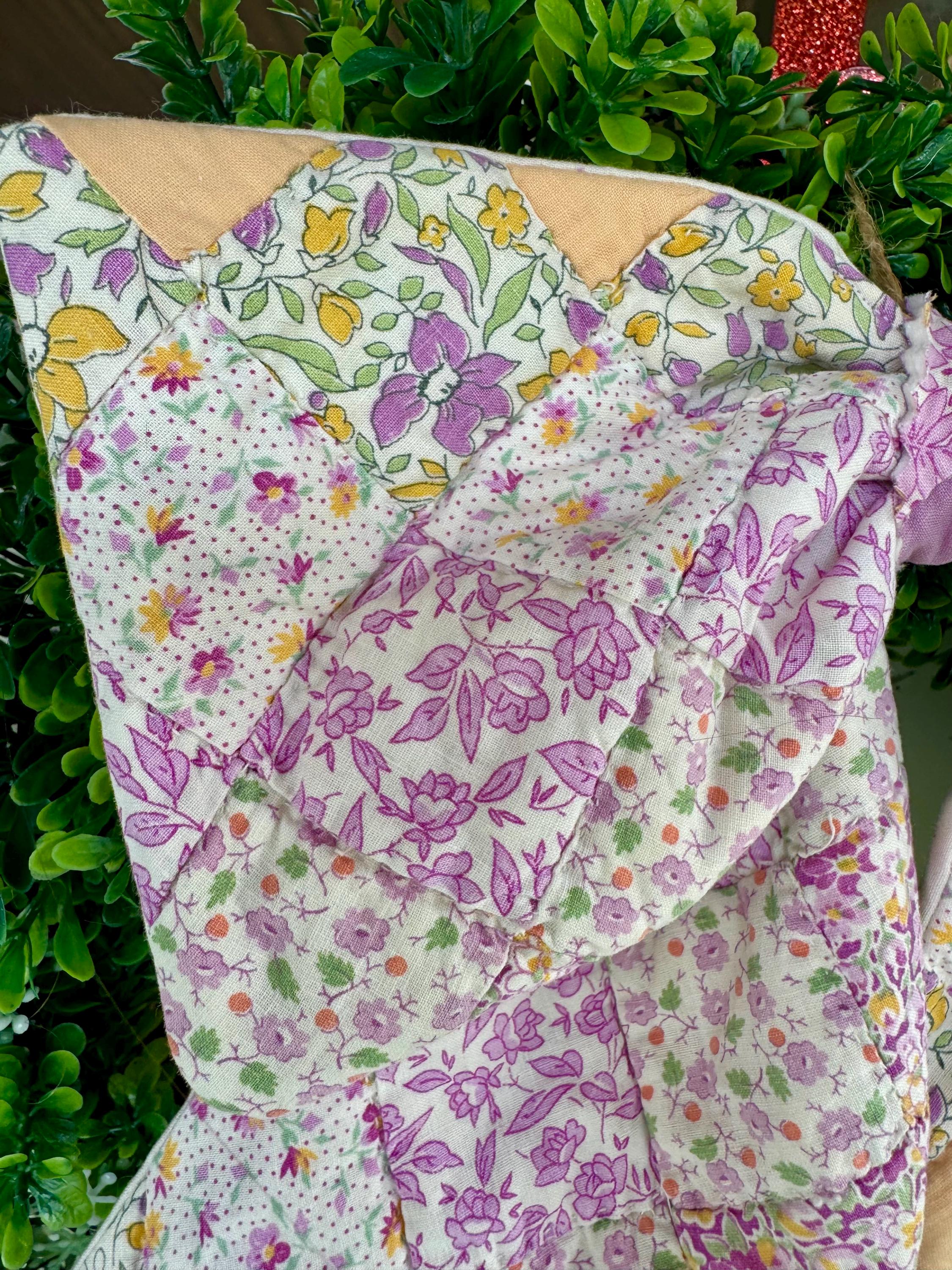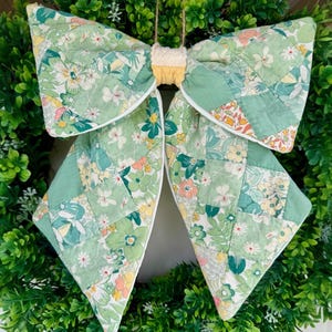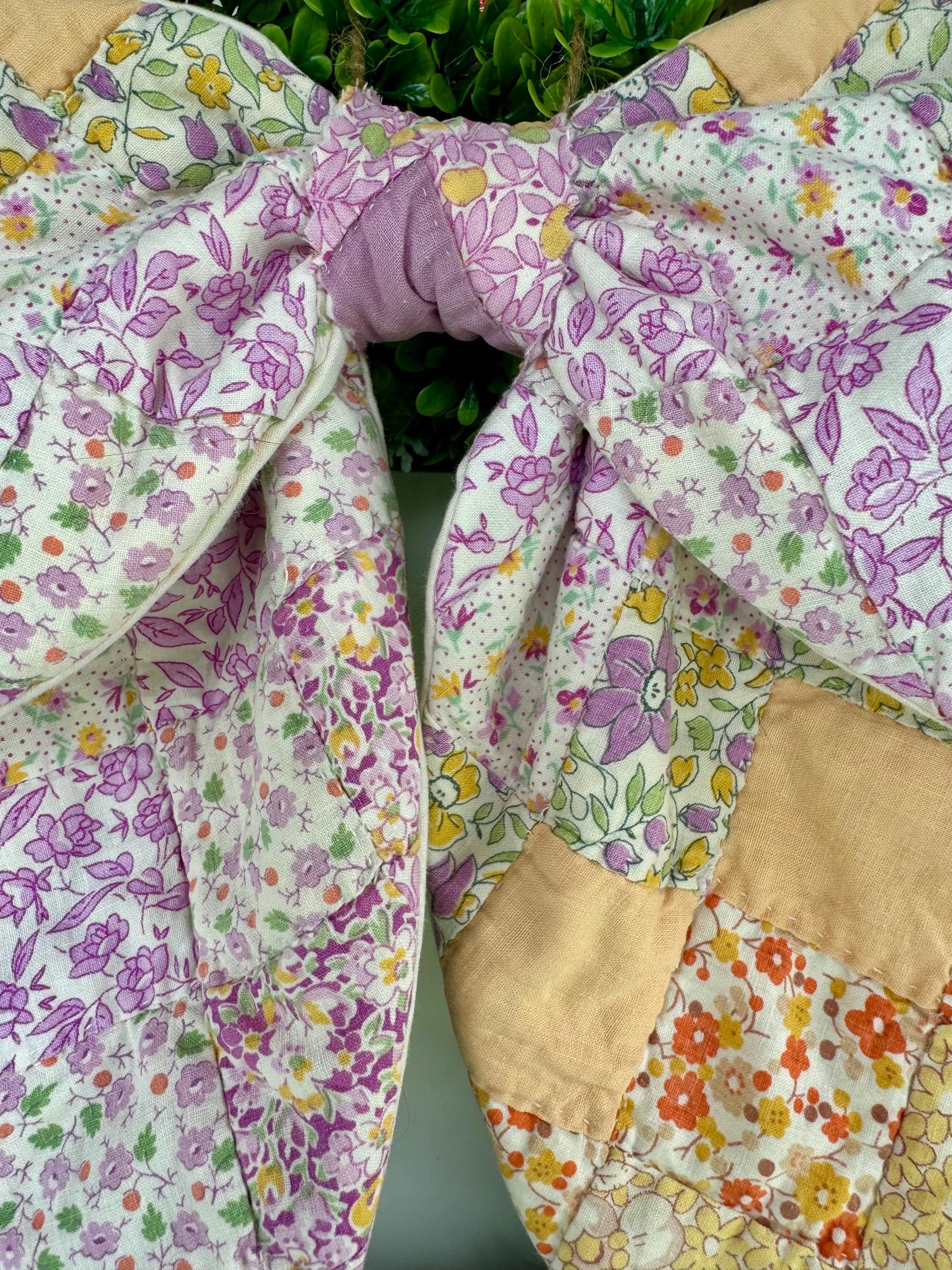 Vintage antique quilt hanging patchwork wreath bow is so charming in charming faded Spring or Summer Pastel Purple and Yellow patchwork colors. So pretty and welcoming for door decor, wreath bow, peg hanger or anywhere! I’ve lined the reverse in a matching white decorator cotton which adds to its design. This door wreath bow sash is perfect for welcoming front door decor and is lovely for any farmhouse, cottage, shabby chic, or anytime styles and home decors! It comes with a matching beige jute removable hanger for peg rack hanging so you can hang it anywhere ( see the photo of how you can display it - and to tie with the jute string) or you can affix to your wreath (not included) with the jute string or your wreath wire for door hanging. The material is SO pretty- but as it is antique/vintage it is not weather proof so it’s recommended for indoor use or behind a storm door as an outdoor sash or bow! This vintage bow wreath scarf is in fresh pastels and you can change the many I make for your mood or the season. Lovely for you- or gift one for a housewarming, realtor, wedding shower, birthday or any other gift! The bow is approximately 11” across and the tails are 12”. EACH pattern is slightly different for a completely unique bow.