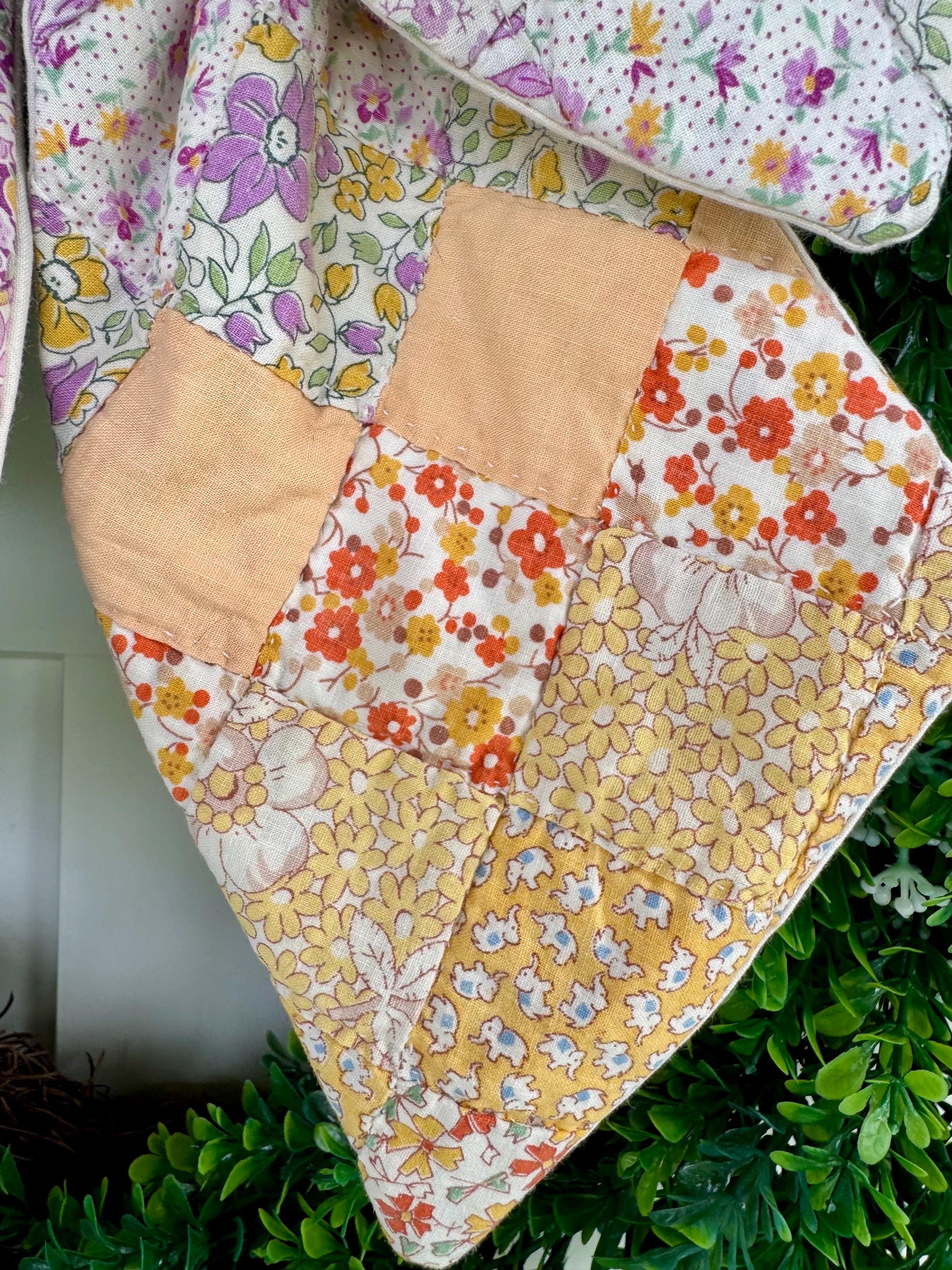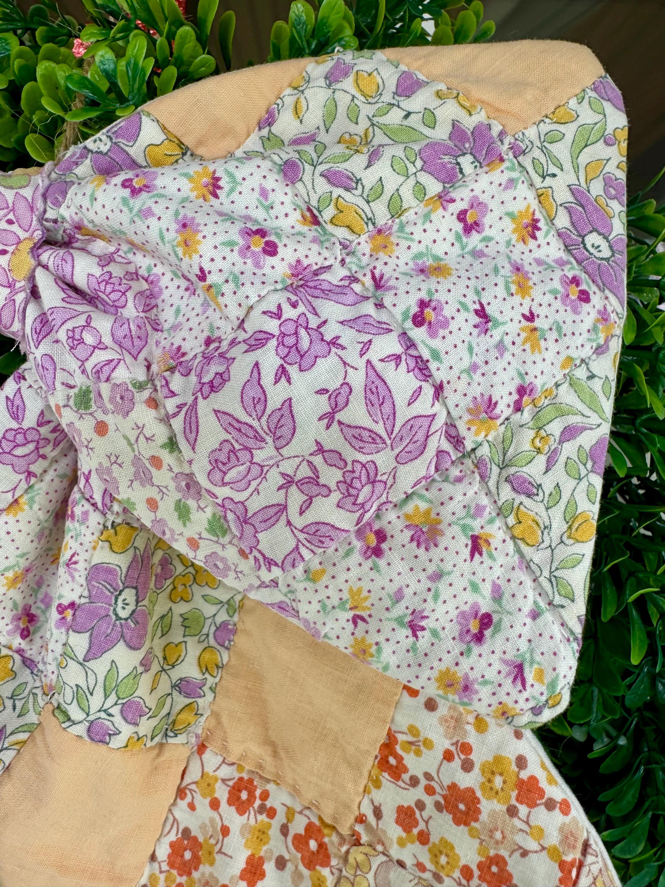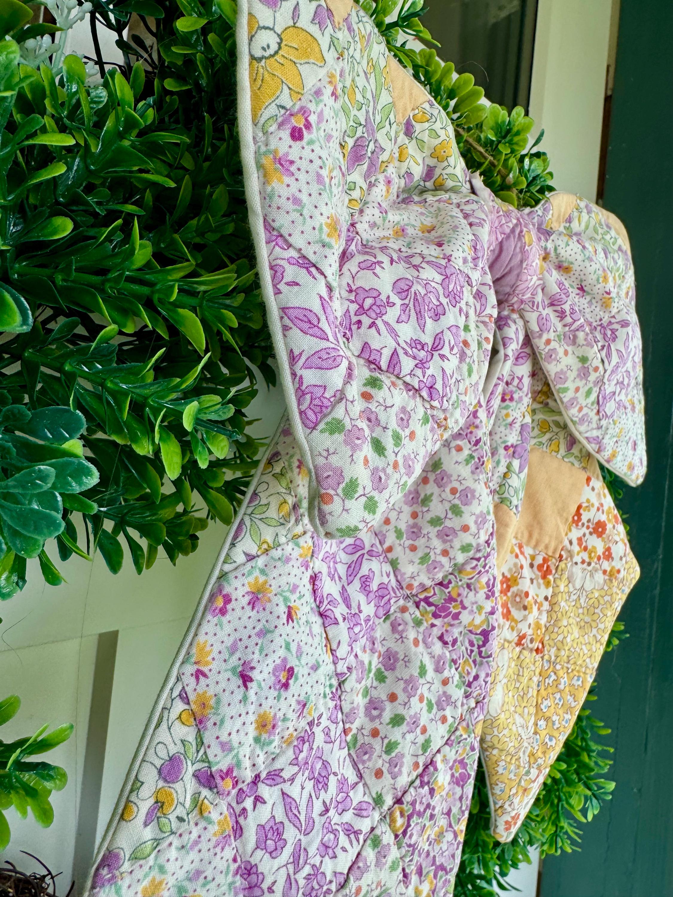 PLEASE NOTE: as with any antique and vintage textile, there may be distressed areas, wear and gentle tea staining which adds to its charm. ALSO PLEASE NOTE: These few are cut from a vintage quilt and each pattern is unique/may vary for each such scarf. Spot clean and hang to dry- not a toy. Wreaths are not included.